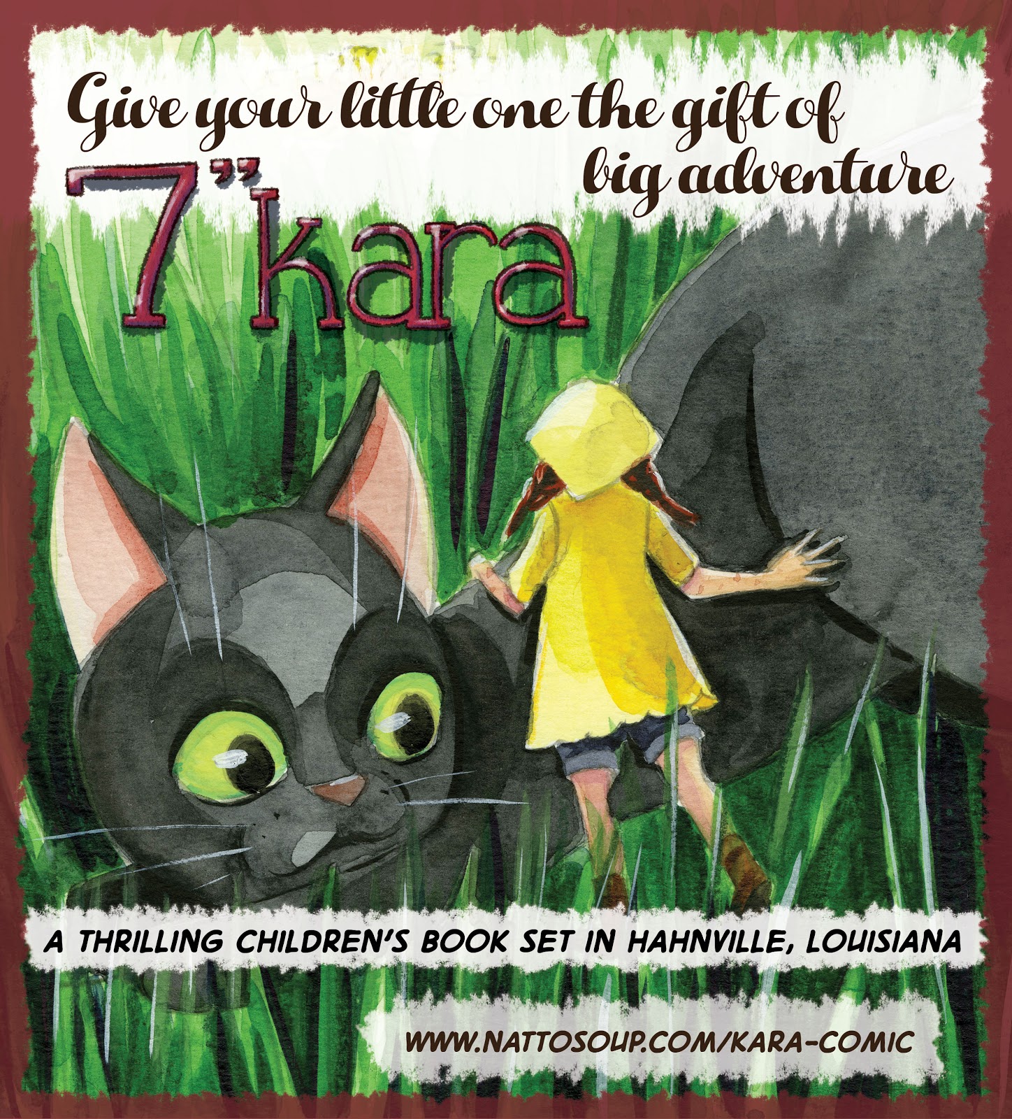 This unboxing and overview was brought to you thanks to the generosity of my backers on Patreon, and was sponsored by 7" Kara,Volume 1. 7" Kara is an ongoing children's watercolor comic set in rural Louisiana, and follows the adventures of tiny Lilliputian Kara as she discovers humans, explores the back yard, and befriends a kitten. Volume 1 is available now in the Natto-shop, just in time for Christmas!