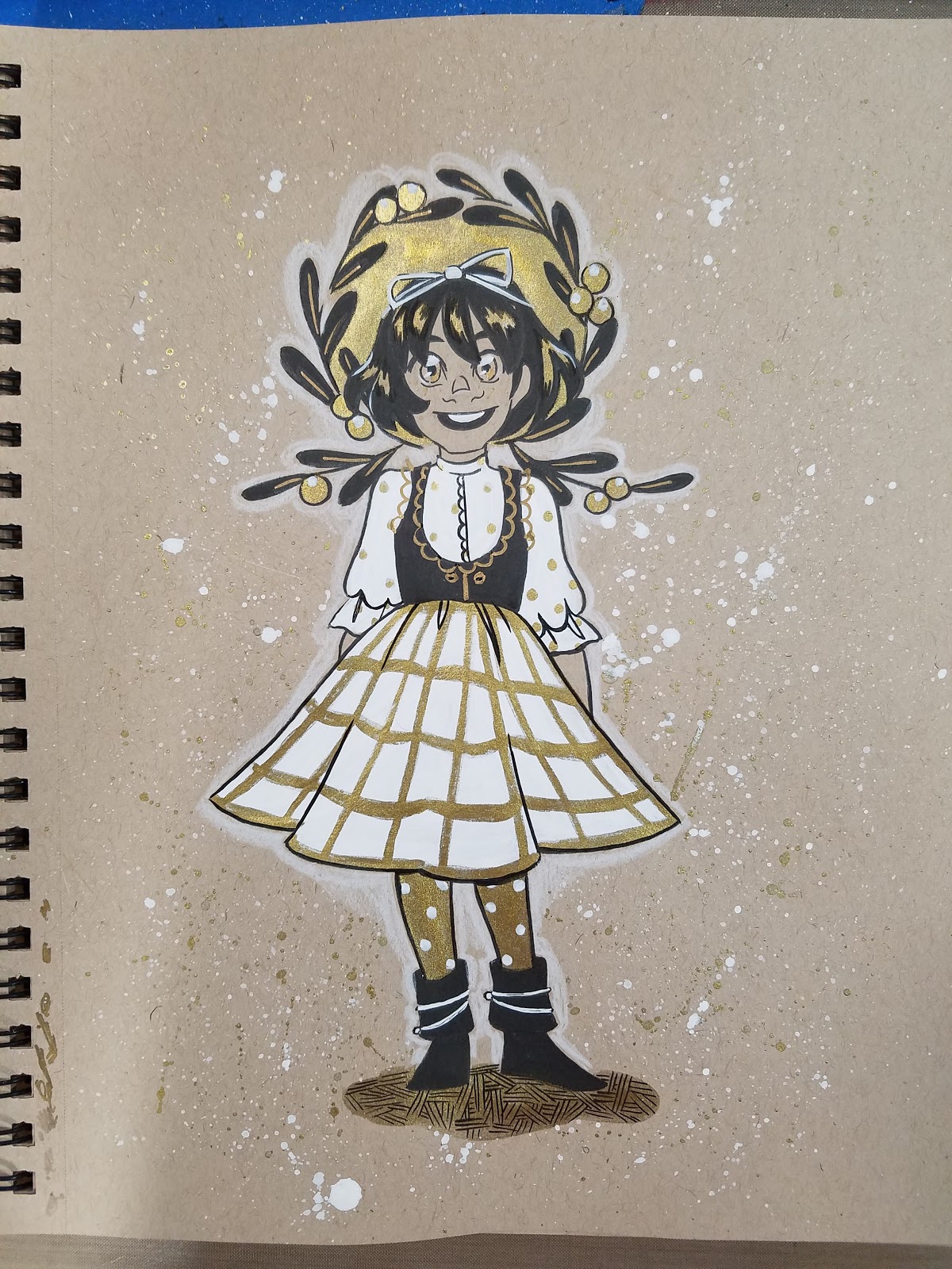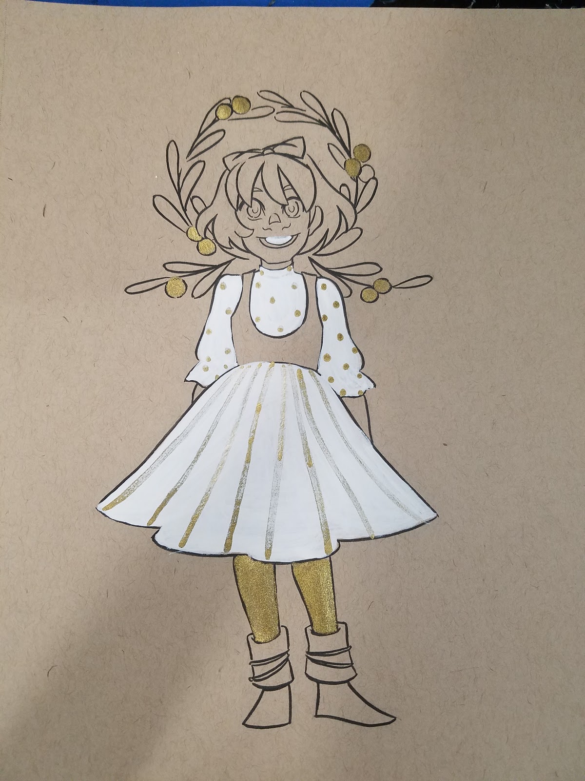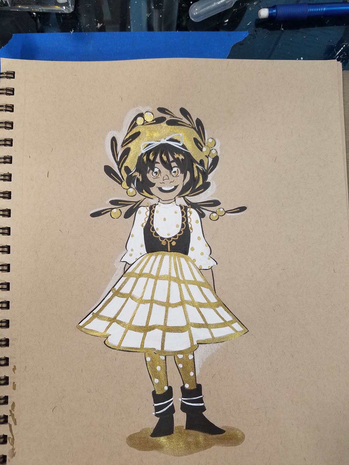 Toned Tan Paper+Graphite+Black Ink+Copic Opaque White (or Gouache)+ Gold Ink