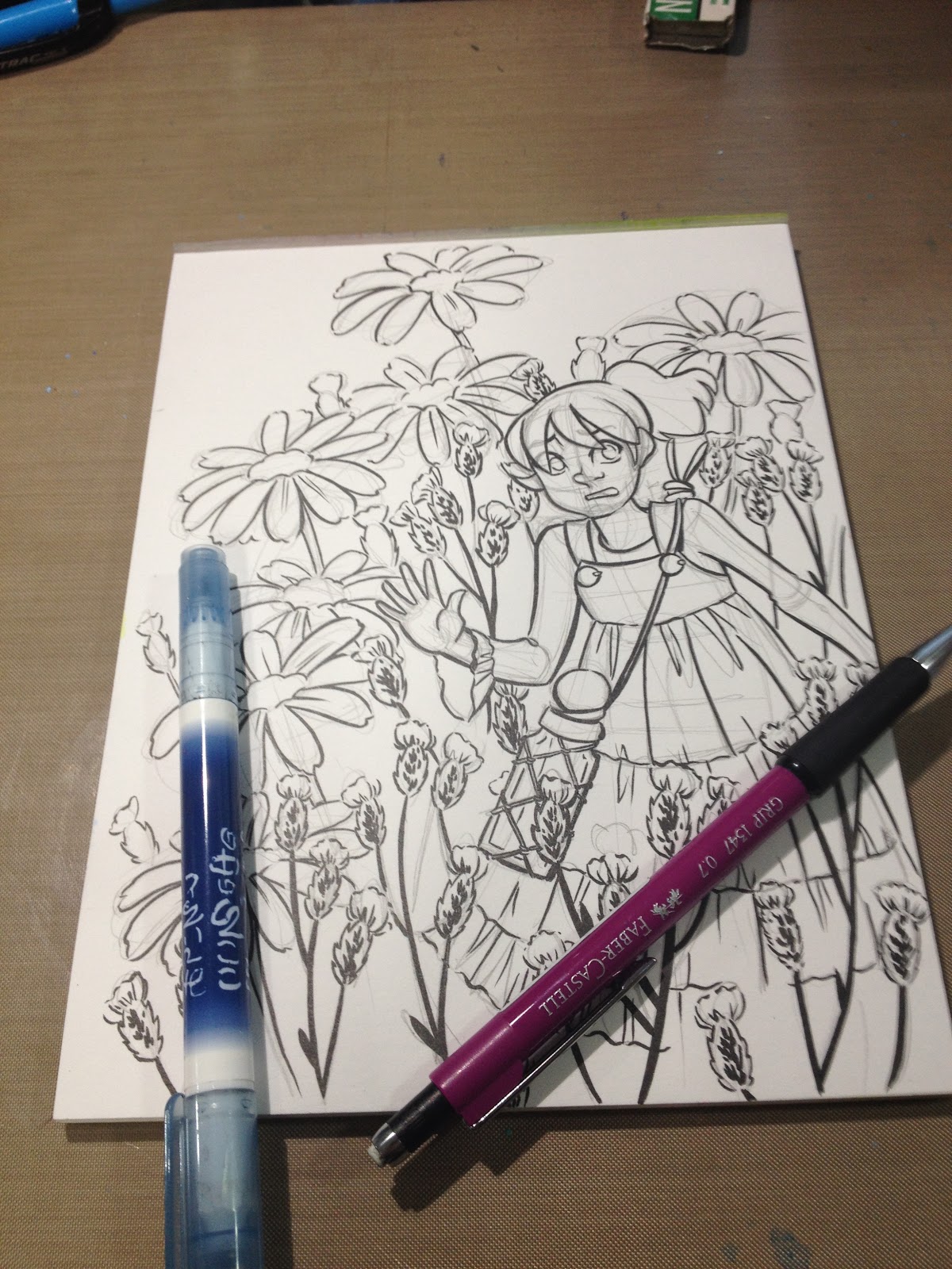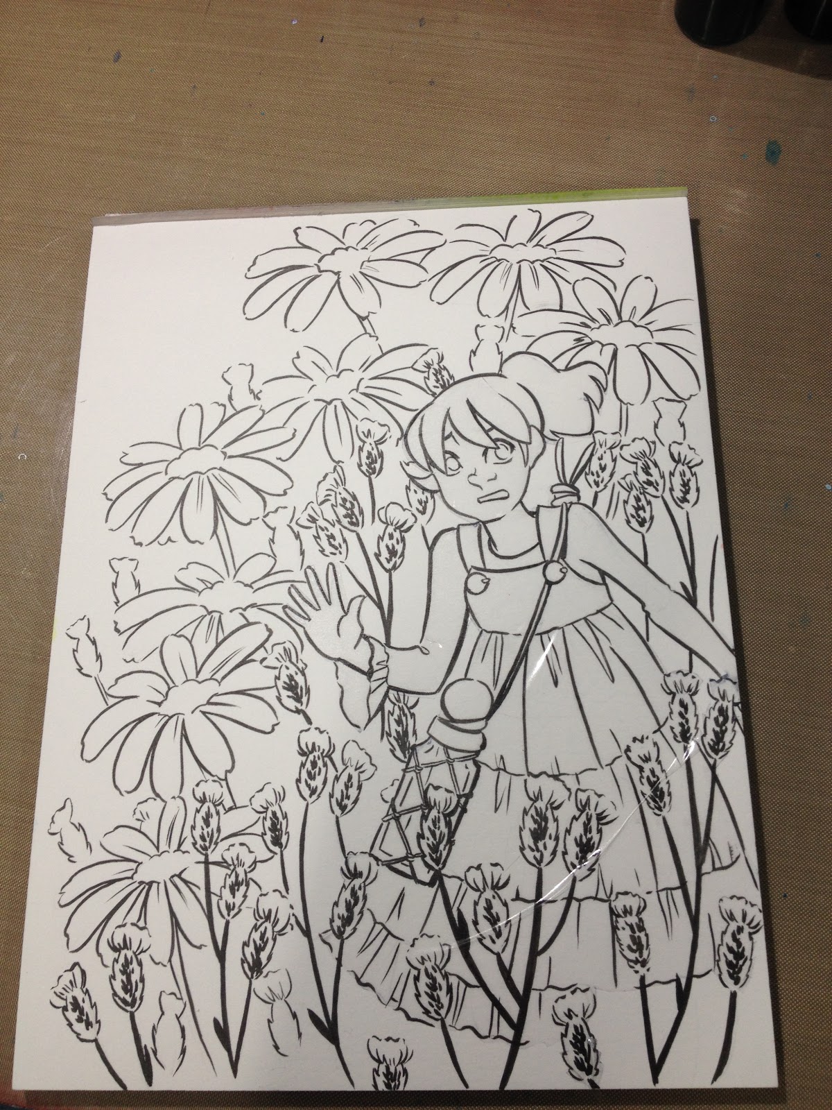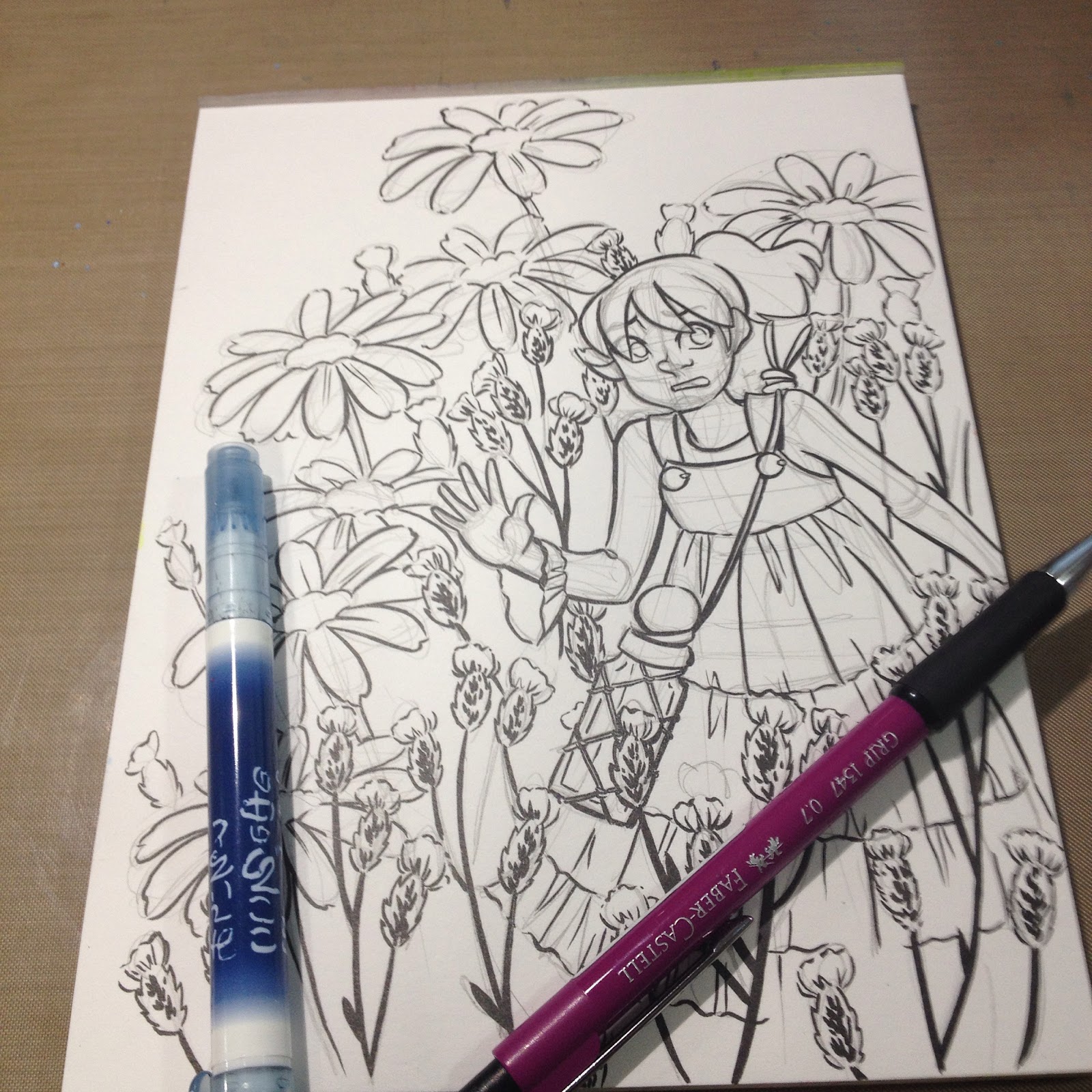 Once the character has been inked, I move on to inking other mid-ground objects.