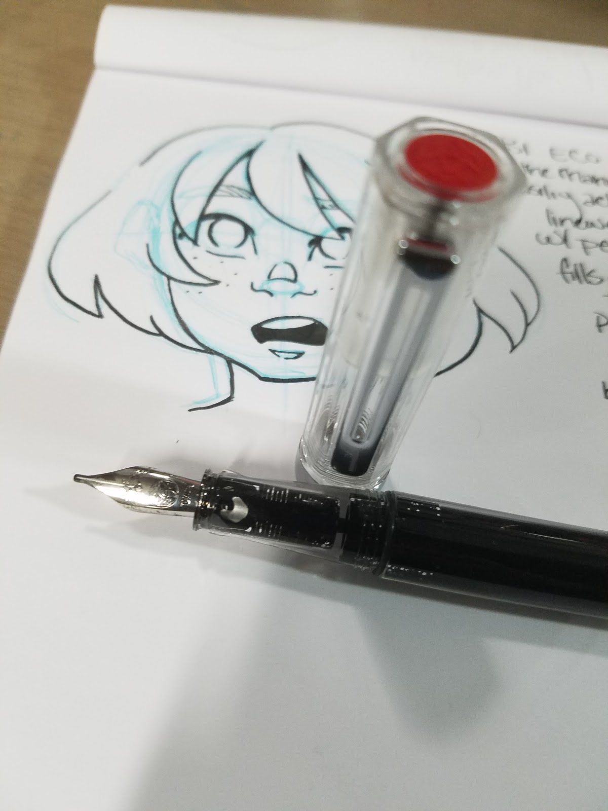I did, however, buy a few after visiting with Heidi and recording a video on the best fountain pens for sketching. I was weak- playing around with dip nibs for Inktober made me fall in love with nib inking again- and I wanted to find the Pentel Pocket Brush equivilent of a fountain pen. Something inexpensive, with expressive lines, that I could take anywhere. Heidi's reccs started me off on a strong foot- the TWSBI Eco and a JetPens Chibi for fun, but I quickly added a Noodlers Flex, a Pilot Varsity, and a Sailor Fude De Mannen.