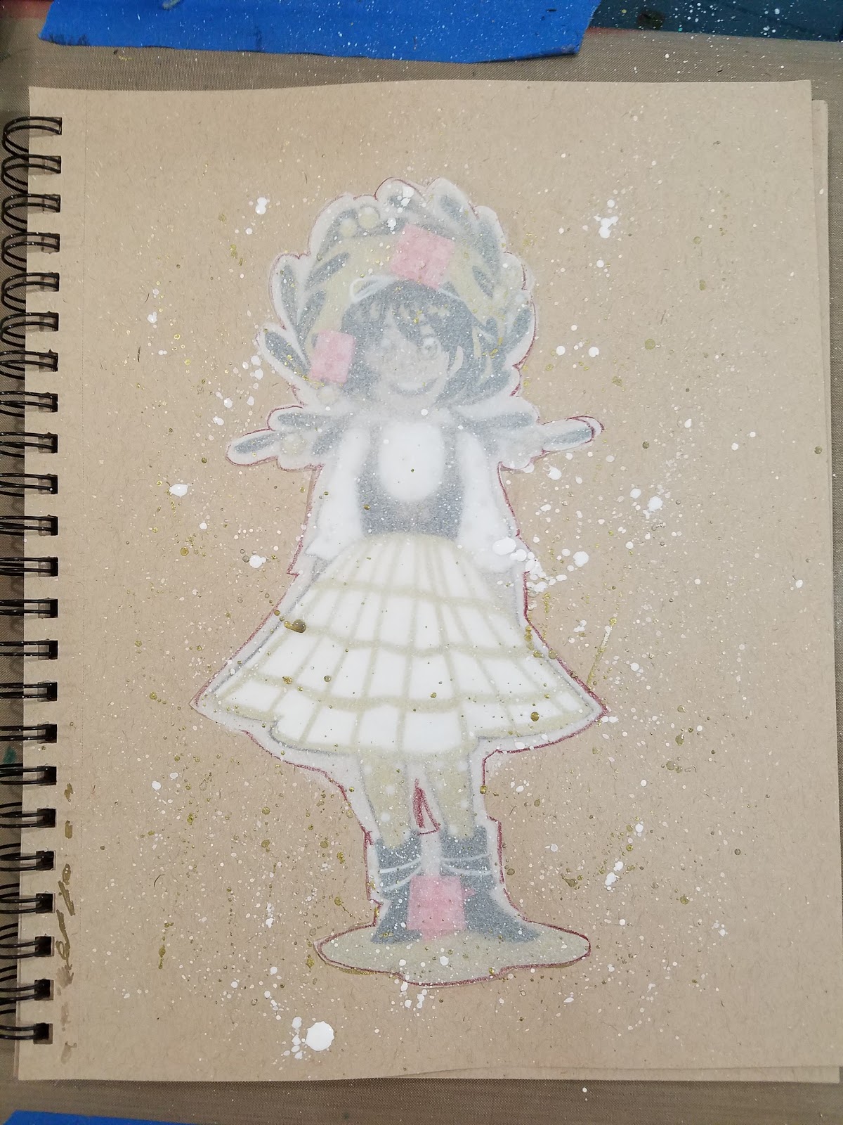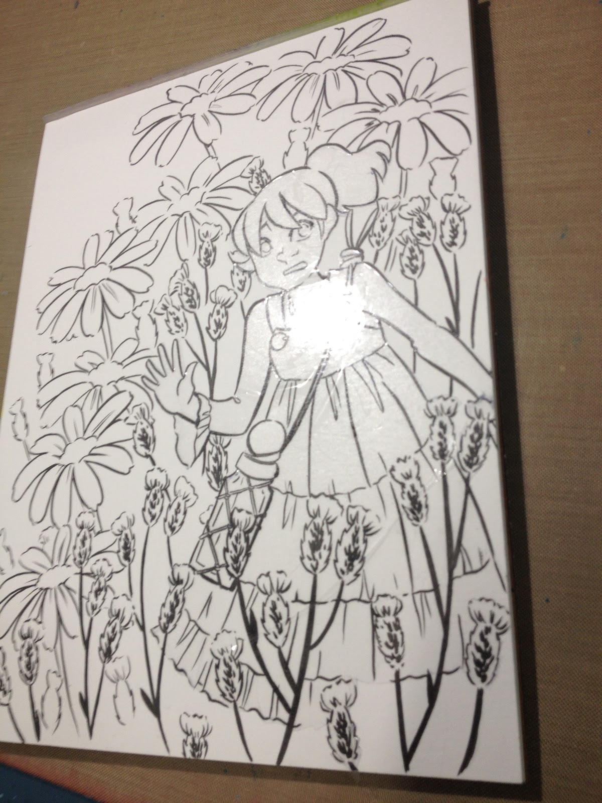 Before cutting my frisket, I use an alcohol based marker (like a Sharpie) to trace the outline of the object I want to mask (in this case, Kara, from my comic, 7" Kara). Once I have traced my outline, I use a small, sharp knife to carefully cut out my shape. Once the shape has been removed from the rest of the frisket, I use an alcohol wipe to remove the Sharpie, as leaving it on will cause smearing once I start applying alcohol inks. Depending on how large the masked area is, I may cut the backing paper to aid in application (see video tutorial linked), and carefully apply my mask over the area.