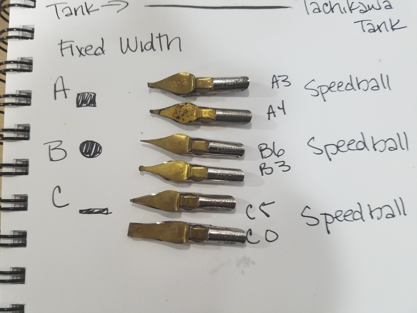 A and C nibs are great for borders on comic pages if you want to go old school, and B is useful for handlettering comic fonts.