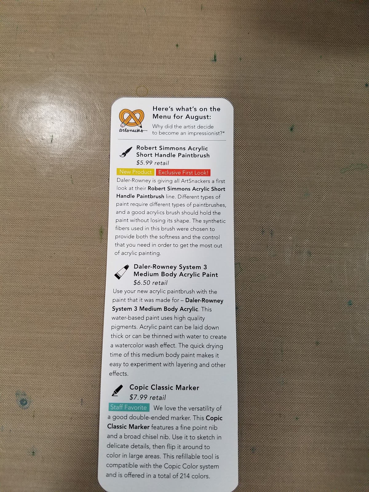 Please watch the video for a demonstration of the materials included inside my ArtSnacks August box.