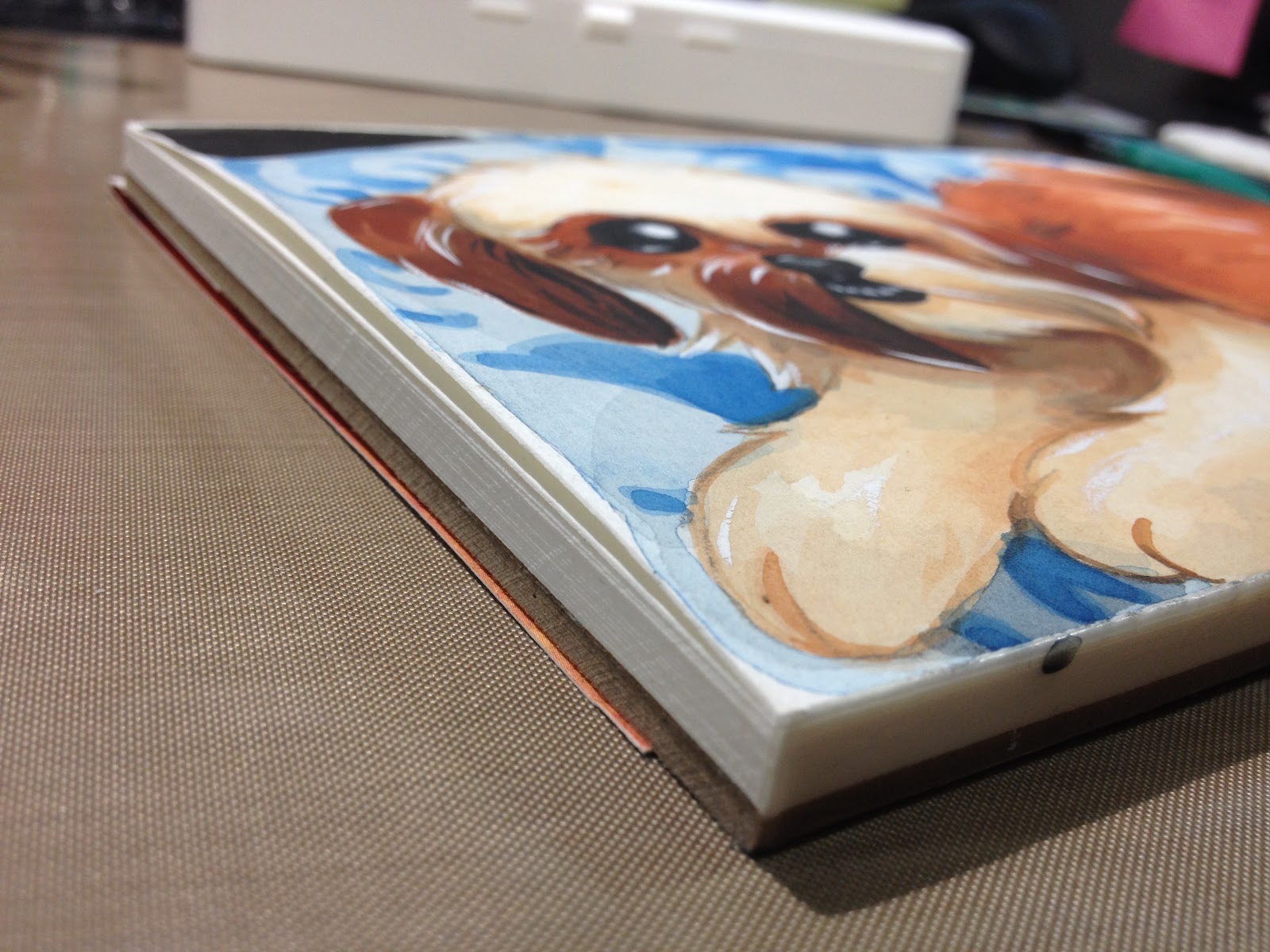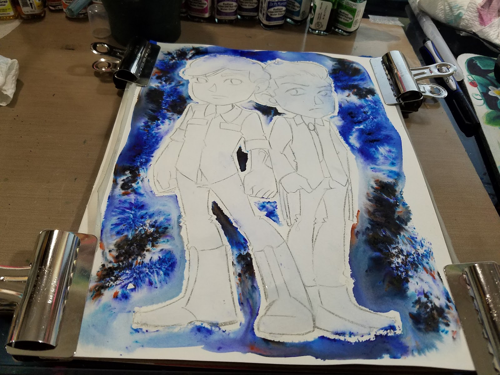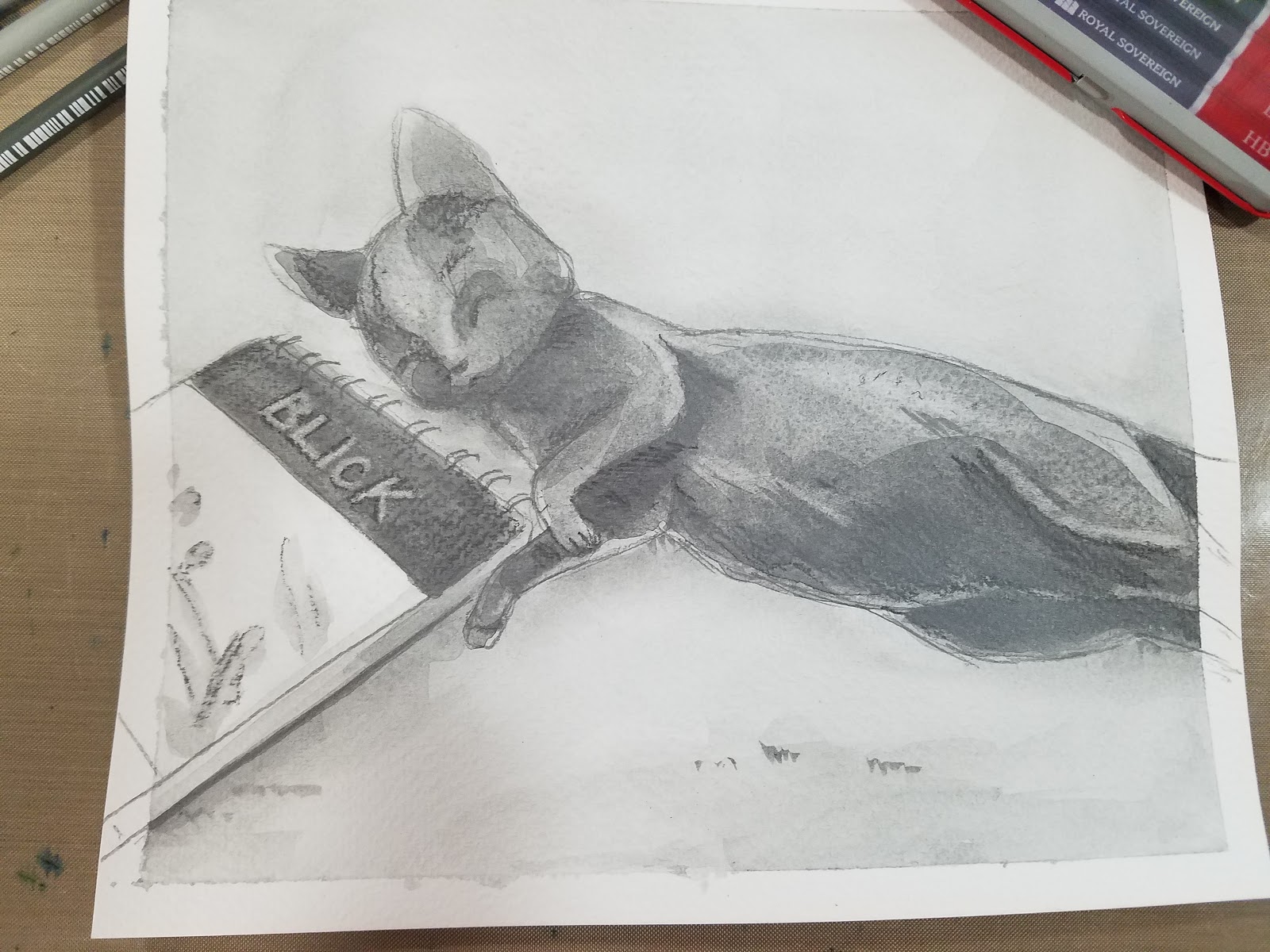 Sometimes watercolor blocks don't do a great job of holding the paper down, so you may need to augment with some handy bulldog and binder clips, as shown with the commission below.