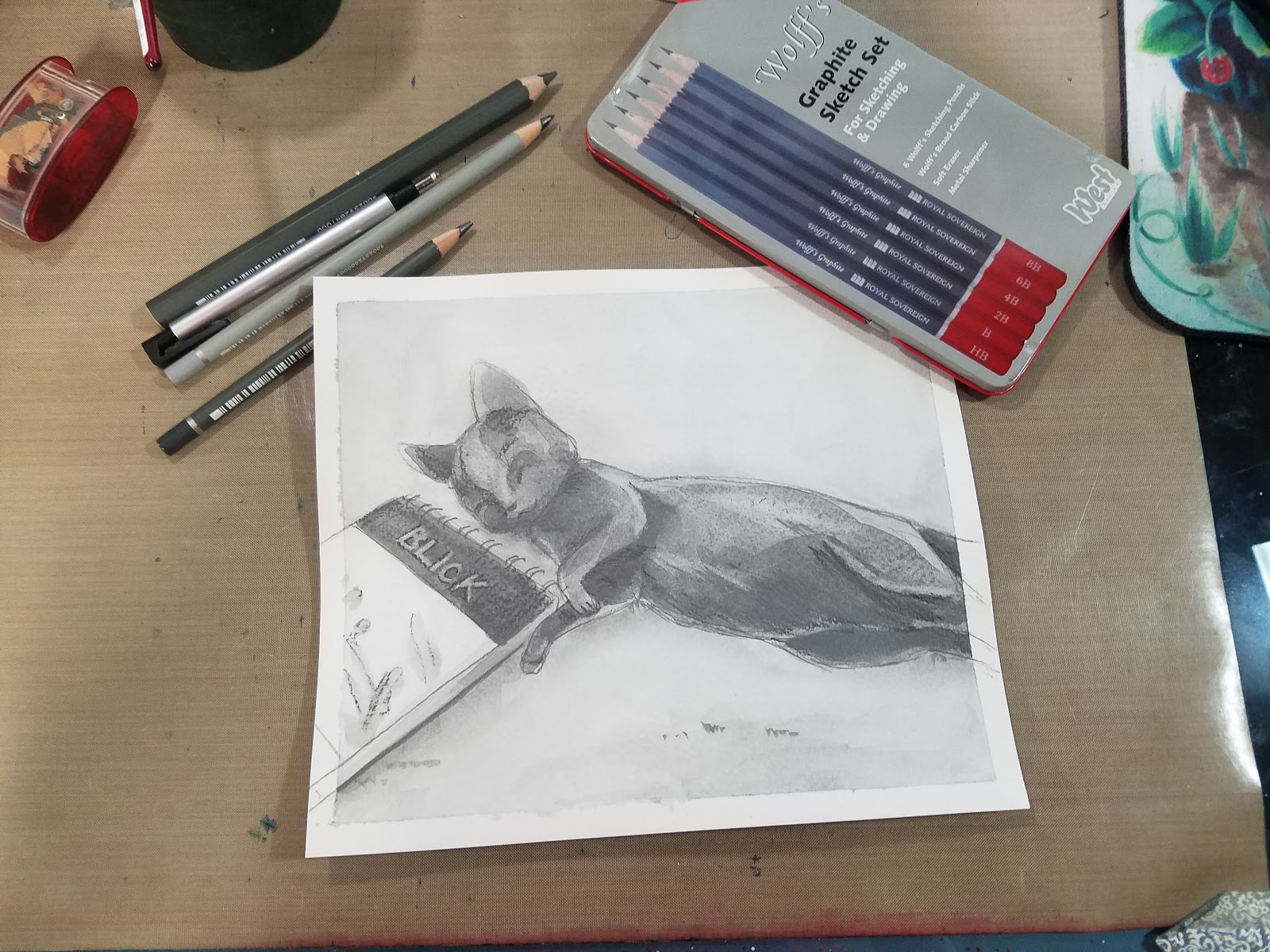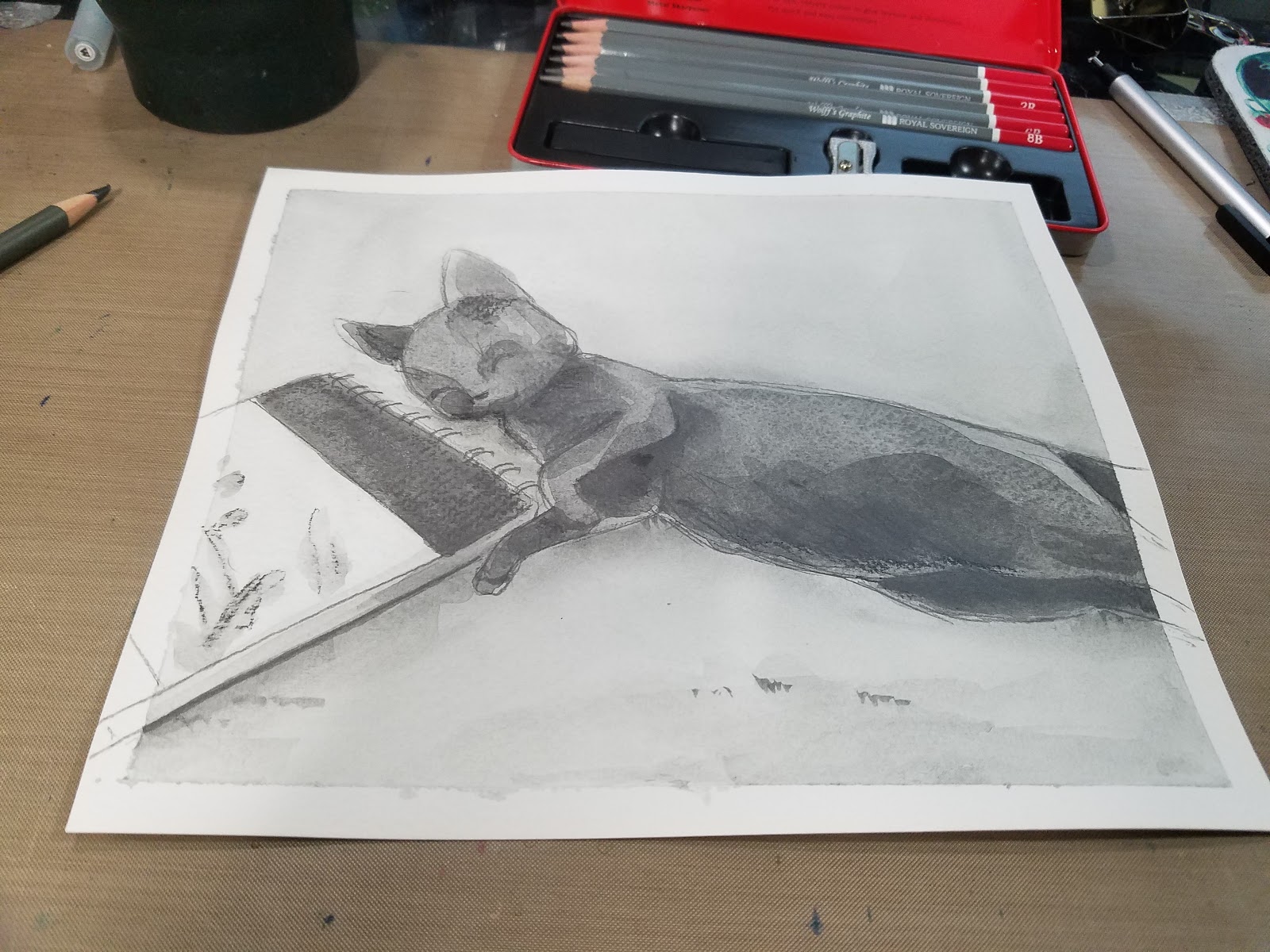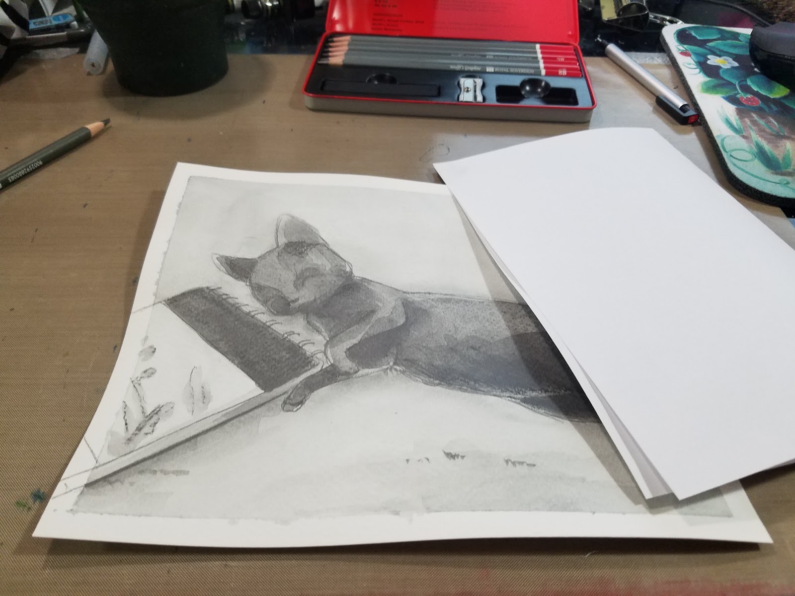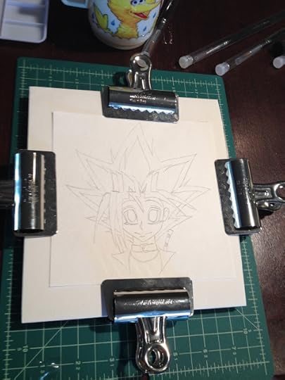 Sometimes watercolor blocks don't do a great job of holding the paper down, so you may need to augment with some handy bulldog and binder clips, as shown with the commission below.