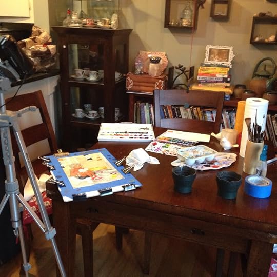 I use a particular brand of crepe paper blue masking tape- 3M Blue- as I've tested several other brands of masking and artists tape (including watecolor tape) and find that this brand works best for the papers I use, with minimal ripping. Watercolor tape is not meant to be removed from the paper- you are intended to cut your paper away- which does not work for my method of creating watercolor comics. I started out using lapboards as a stretching surface, but have found corrugated plastic Gatorboard (like political sign boards) to be superior- non absorbent, will not splinter, lightweight, very cheap, can easily be cut to size.