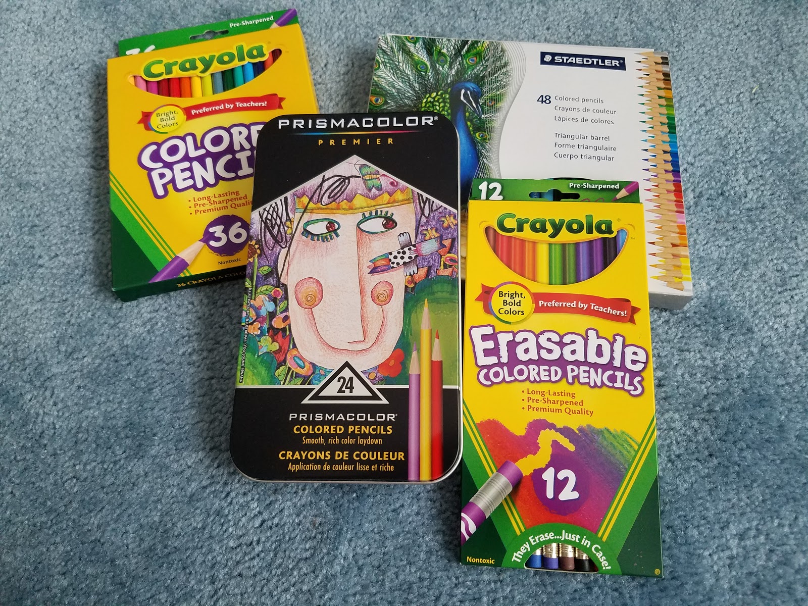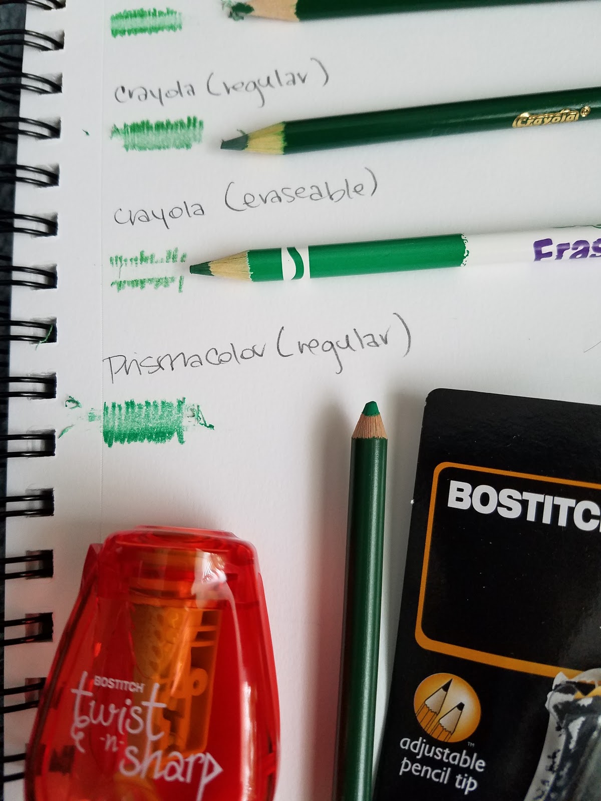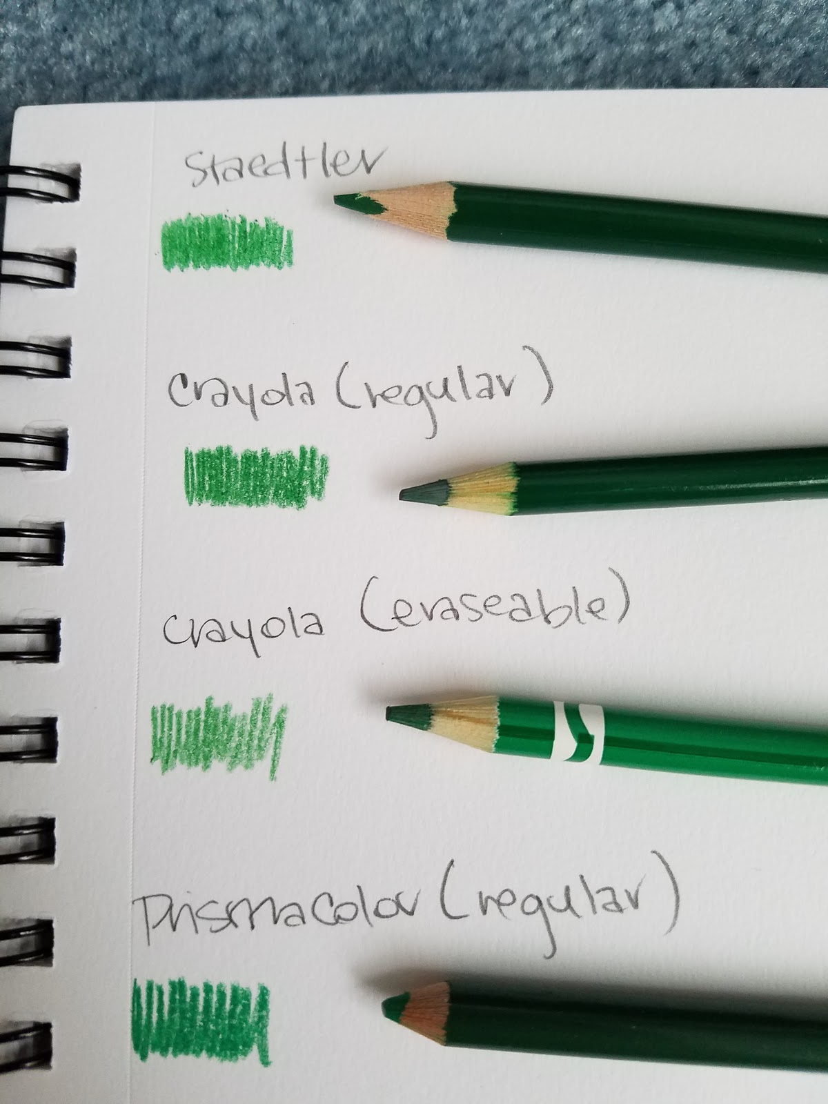 Side By Side Comparison: Crayola Original, Crayola Erasable, Prismacolor pencils, Staedtler Color Pencils