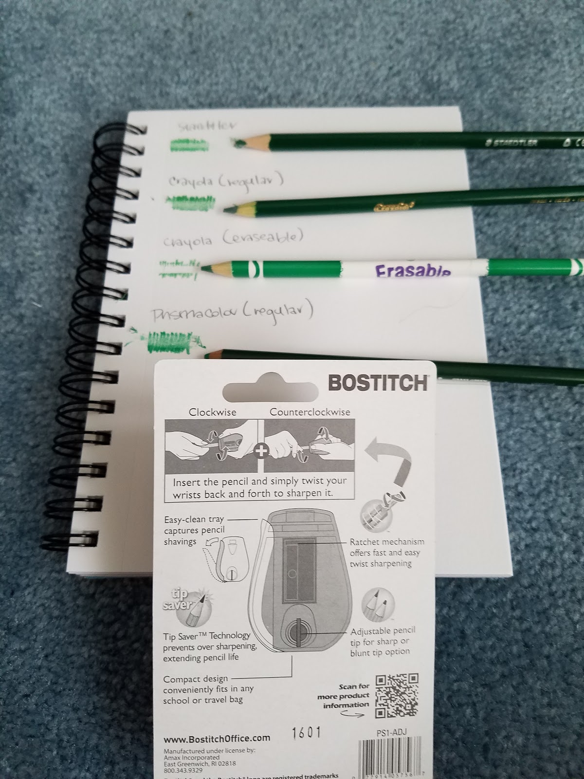 For young artists, the right pencil sharpener can make a huge difference, especially with expensive color pencils like Prismacolors, which are prone to breakage in the wrong sharpener. The Bostitch Ratcheting Sharpener reminds me of another ratcheting sharpener I've used in the past, and since the sharpener doesn't require full rotations to sharpen pencils, may be easier for small hands to use.