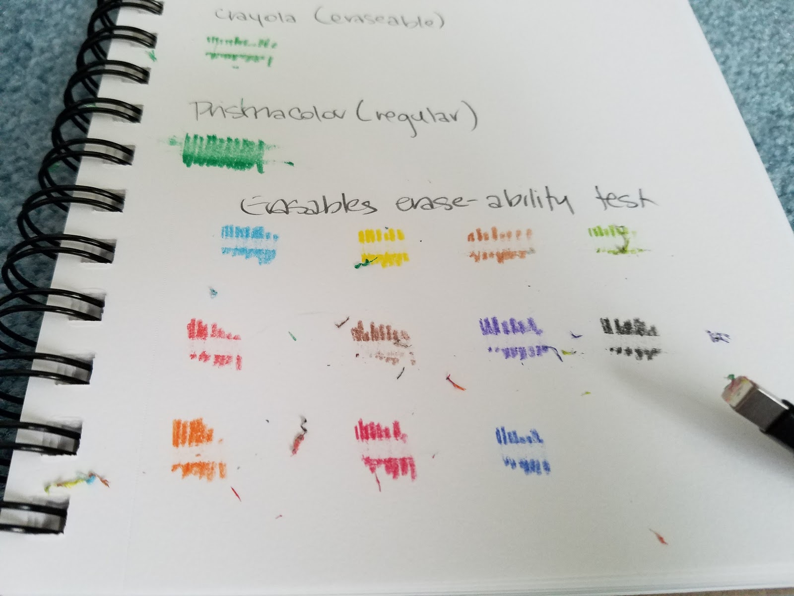 Of all the color pencils, the Erasables erase the most cleanly, leaving very little to no color on the paper. All colors tested perform well. I have not yet tested the erasers on these pencils, I used a fairly stiff Mono eraser.