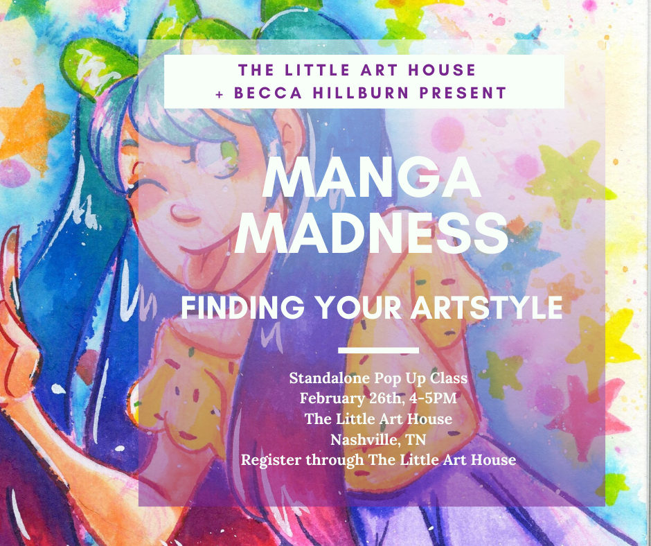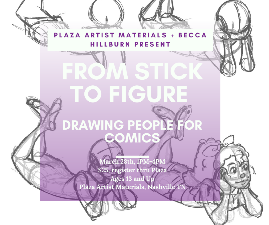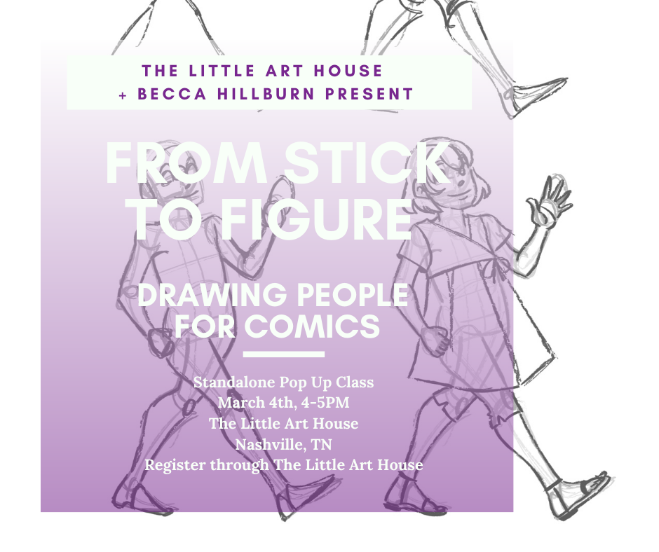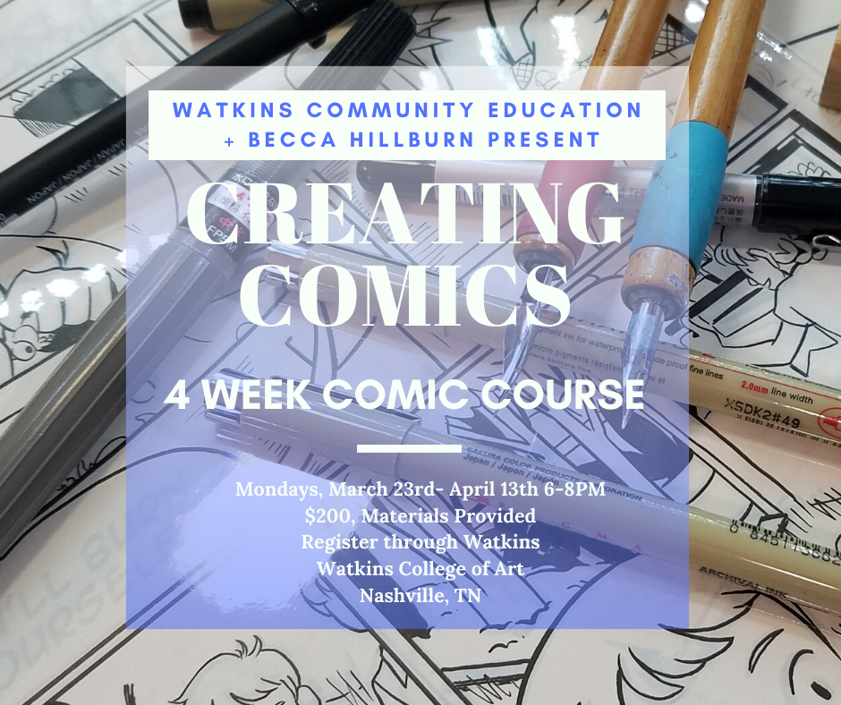 My last comic class in Nashville! In this three hour workshop, we'll talk about comic art, process, and you'll get your hands on commonly used comic tools. Together we'll make an eight page minicomic. Although we provide the materials, feel free to bring your own favorites! Snacks are provided, but you're welcome to bring your own.