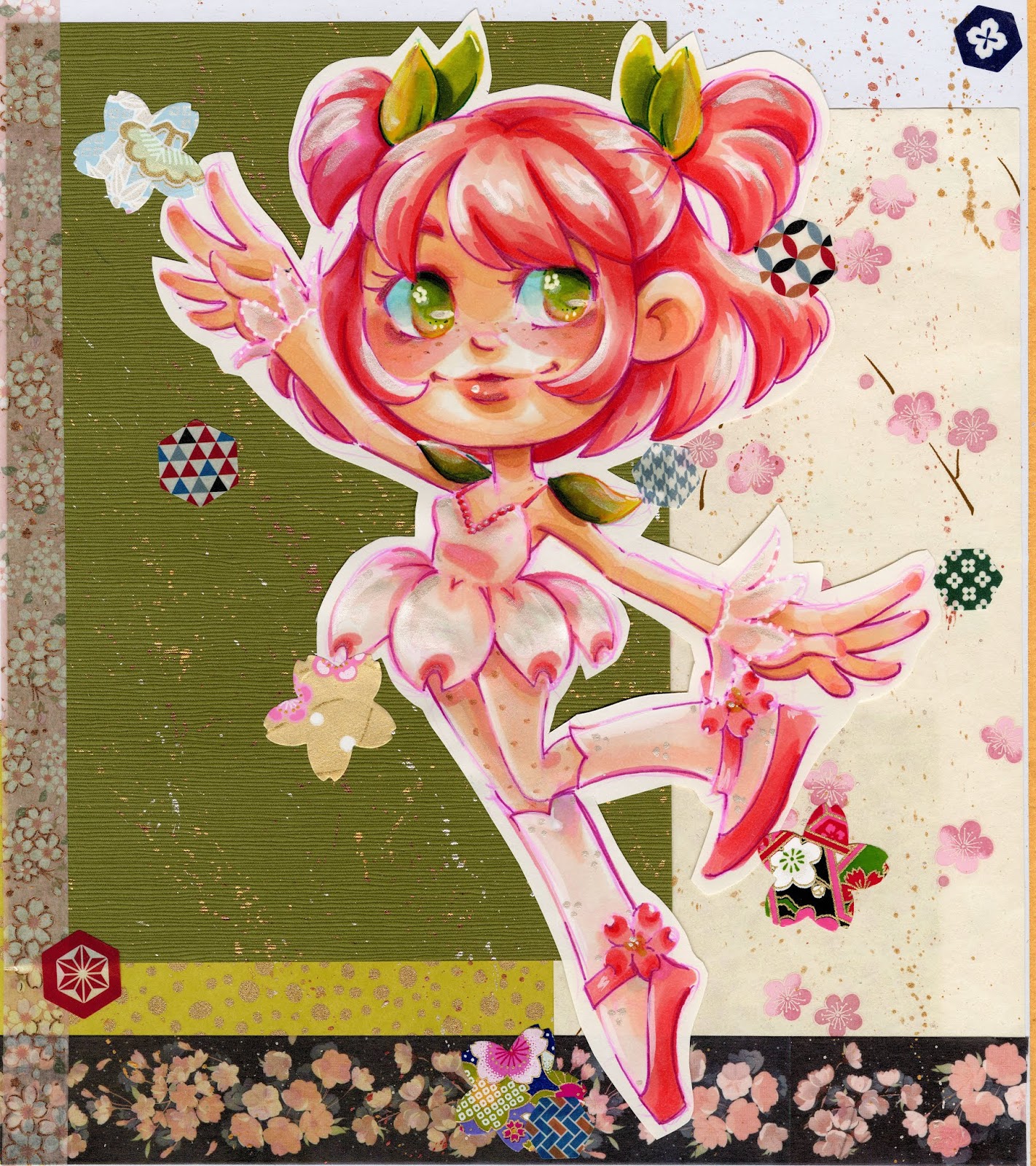 Copic and Blick Studio Brush markers on sketchbook paper, chiyogami paper background