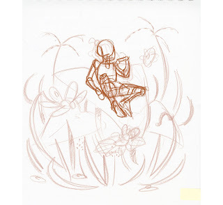 Most of my illustrations are developed in stages. This gives me a chance to refine the concept, improve the anatomy, and restage if necessary. I often work in a combination of traditional and digital media- digital gives me the flexibility to create as many layers as necessary to get the sketch right, and allows me to easily cut and resize problem areas.[=