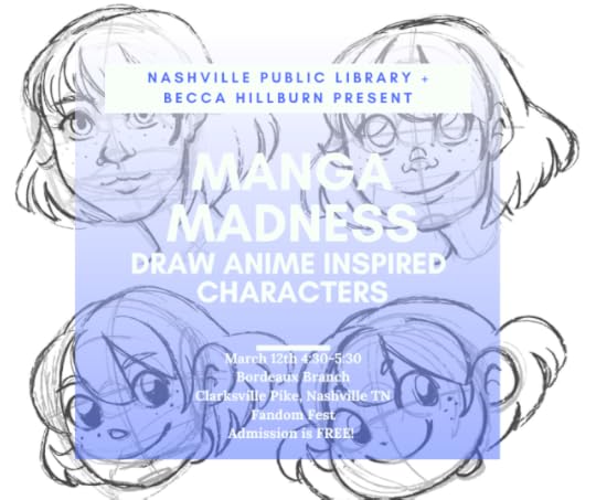 This class is more than just manga! Part of Nashville Public Library's Fandam Fest, I'll show you how to construct and draw your own characters in this free hour long workshop! Bring your sketchbooks and be prepared to draw!
