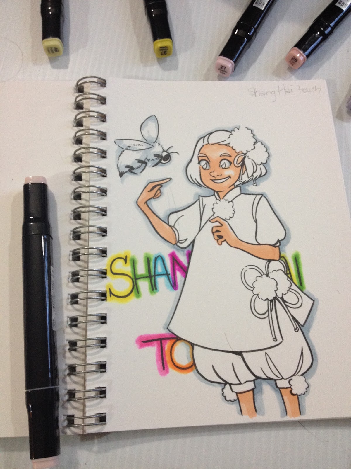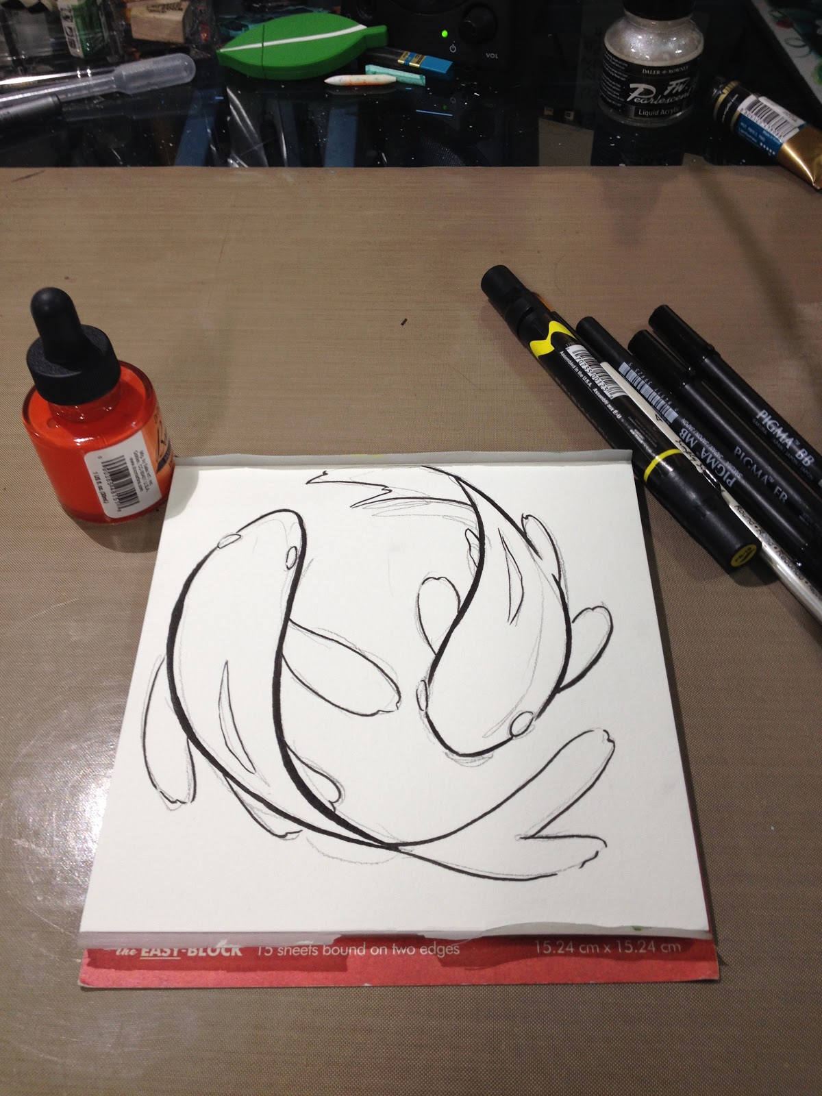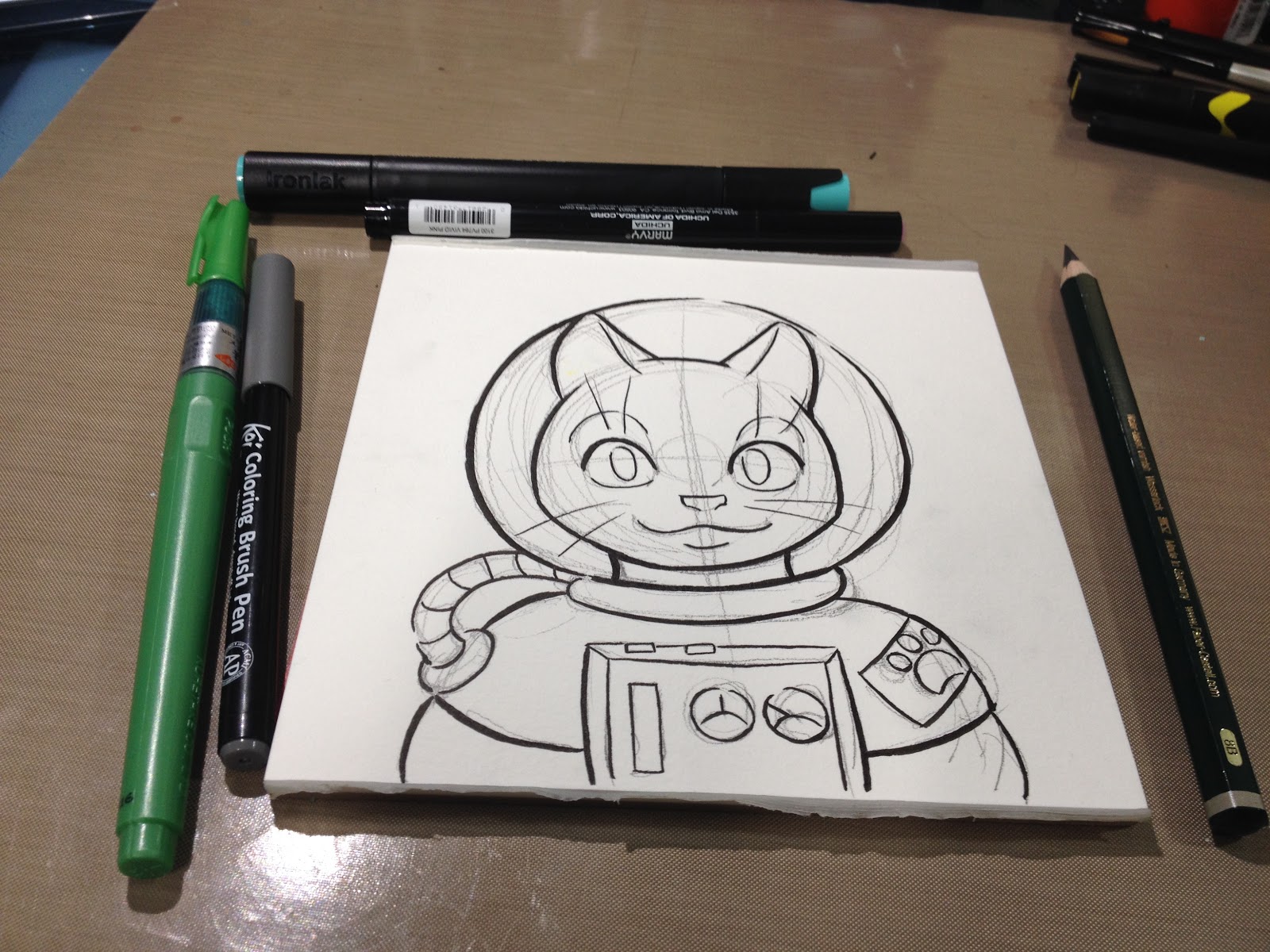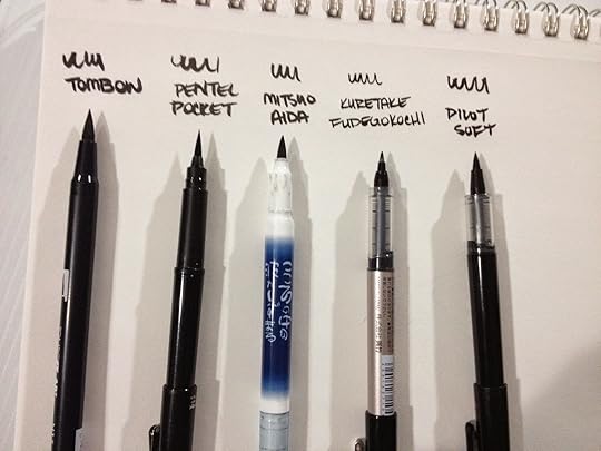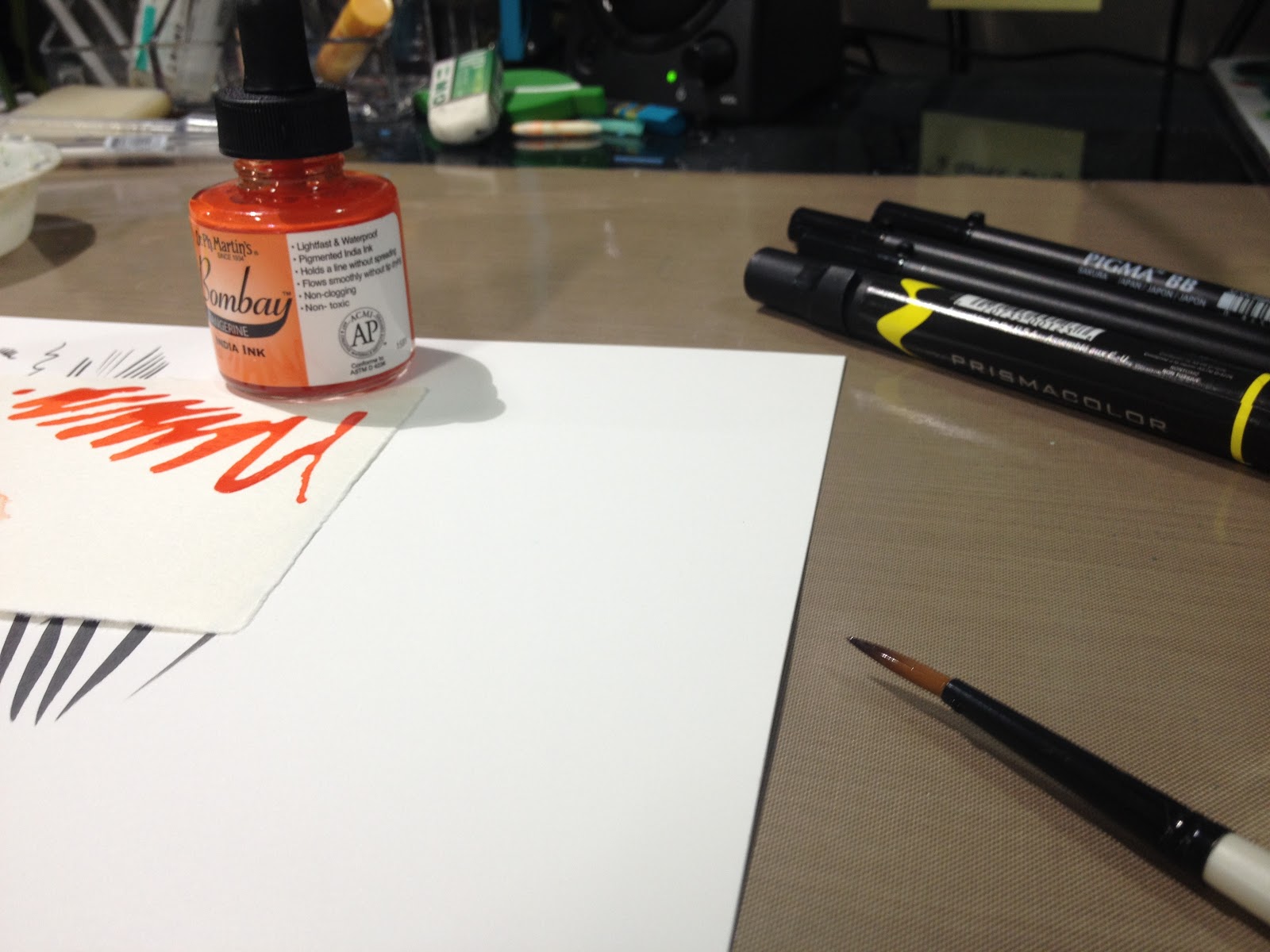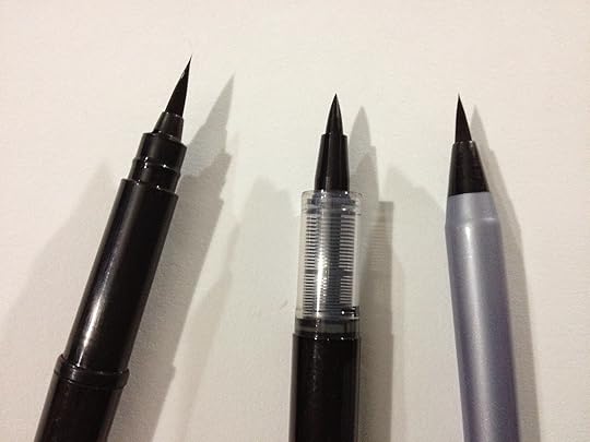 I've moved almost entirely away from technical pens, as fude pens allow a range of expressive brushstrokes not available to technical pens. Even my inking brush, which is still used in the studio, is often neglected, as there's a fude pen for my every need. My alcohol marker field tests? Inked with a Sailor Mitsuo Aida. My convention inks? Inked with a Kuretake Fudegokochi.