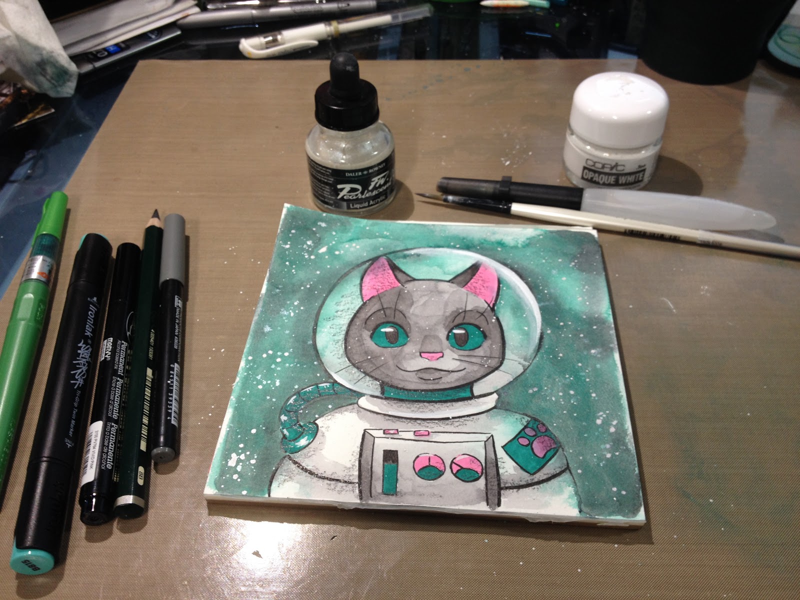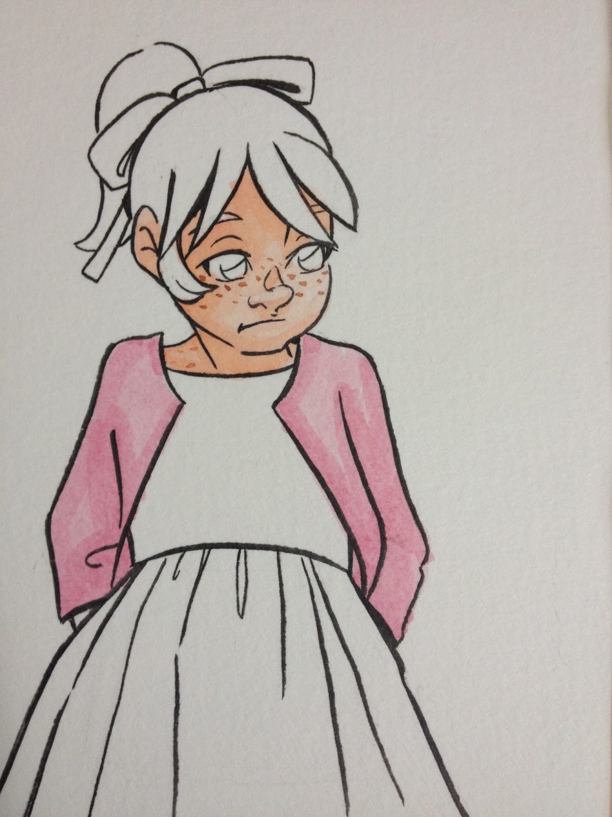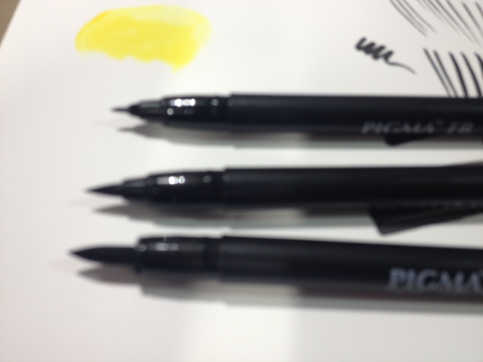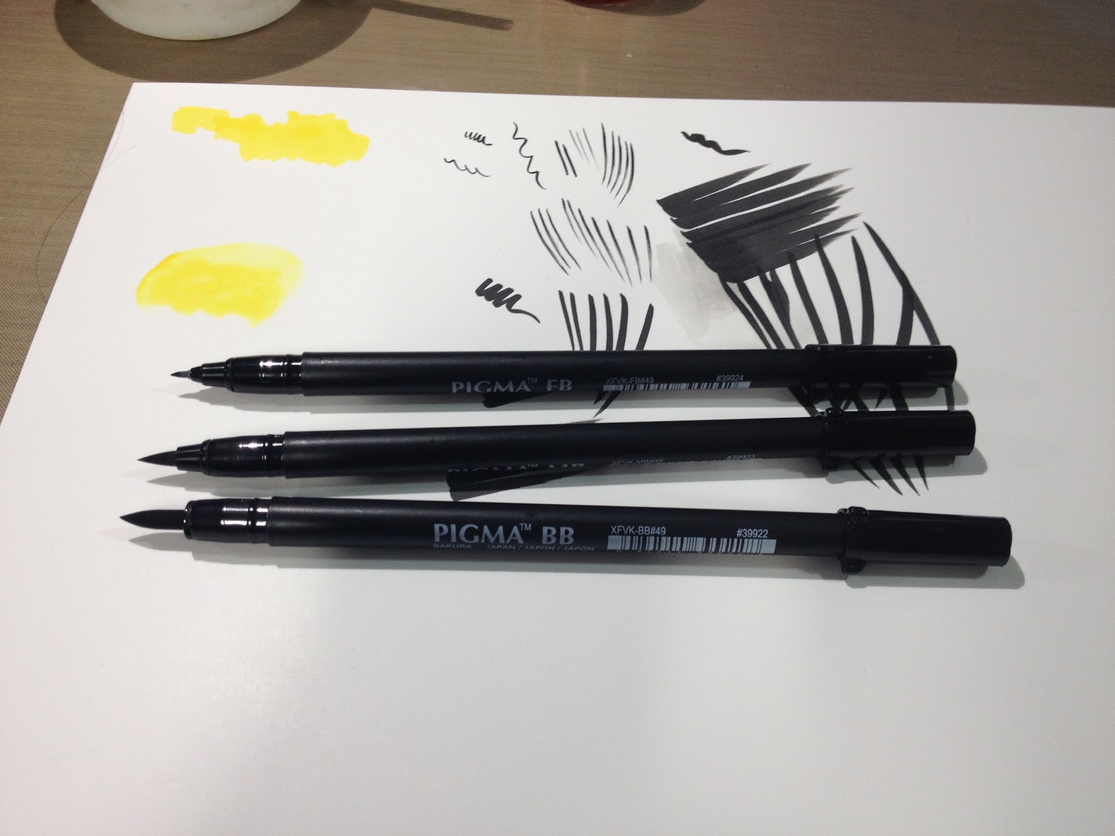The Pigma MB started to get mushy as I inked, and the Pigma FB often grayed out on long lines, but the Pigma BB was a total dream- it's like someone put a Copic Superbrush in a pen designed for Copics+Watercolor, and I love it.