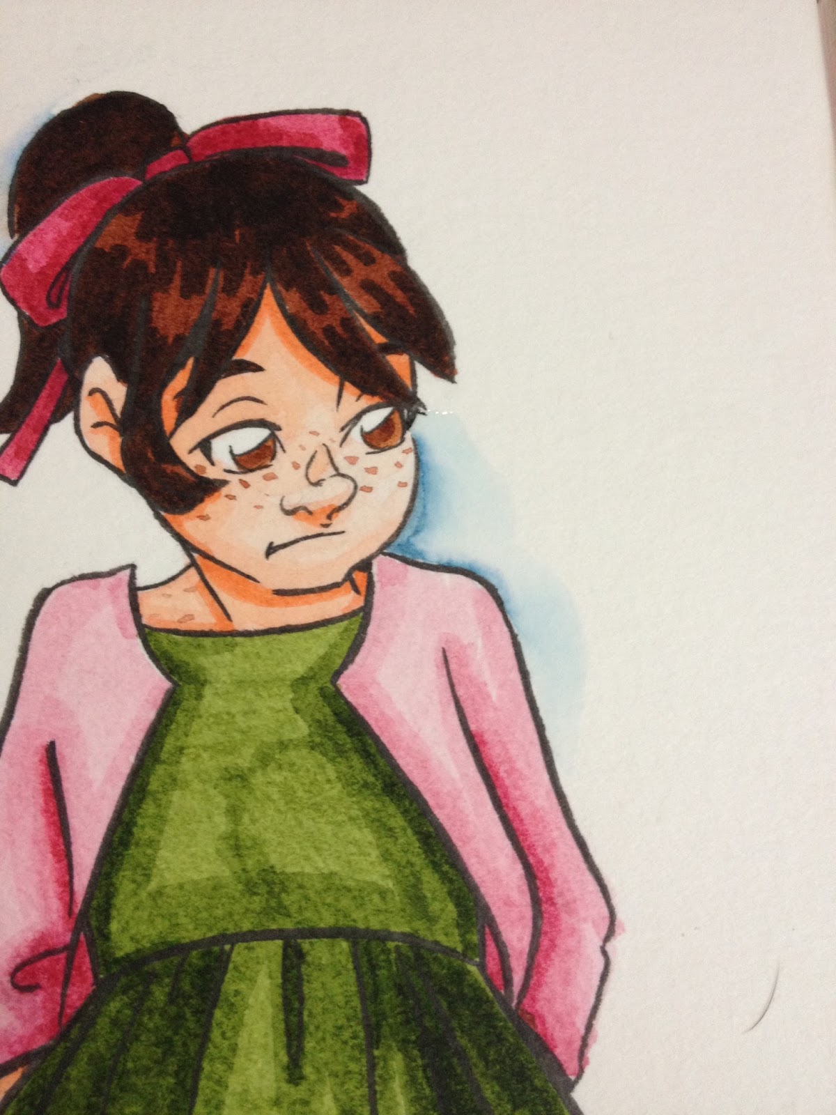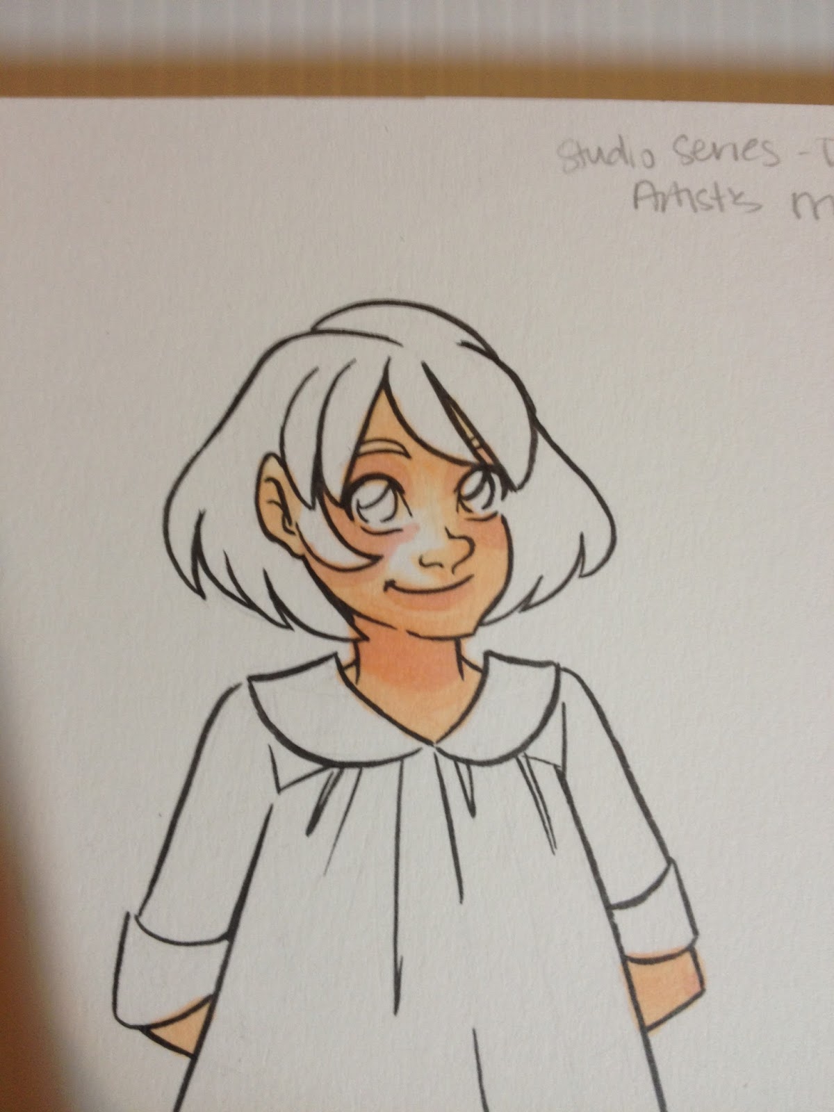 On watercolor paper, these waterbased markers are actually pretty fun to render with, and are far less likely to give you fume headaches the way prolonged exposure to Copics sometimes can. Yes, streaking is still an issue, although far less of an issue than it was on marker paper or cardstock. I realize some of my readers might not have wood pulp based watercolor paper laying around, but I know Canson's cheaper offerings, like their Biggie pads, are wood pulp, and might be worth playing around with if you enjoy using waterbased markers.