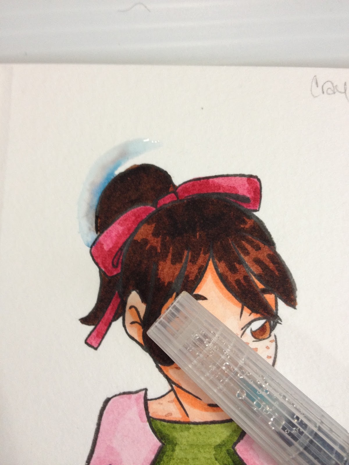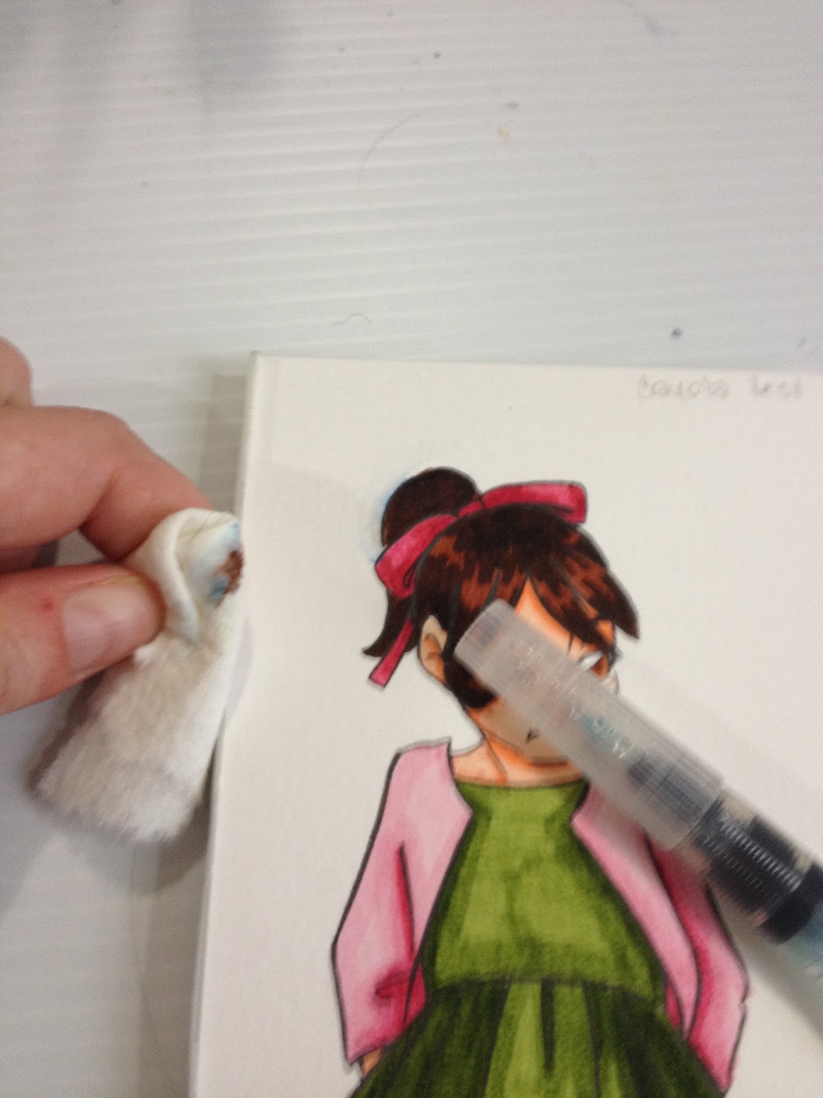 It's better to apply the marker wider than you normally would for watercolor markers, then SPARINGLY (and I mean, wipe all the water out of the brush of your waterbrush first) apply water away from the main figure.