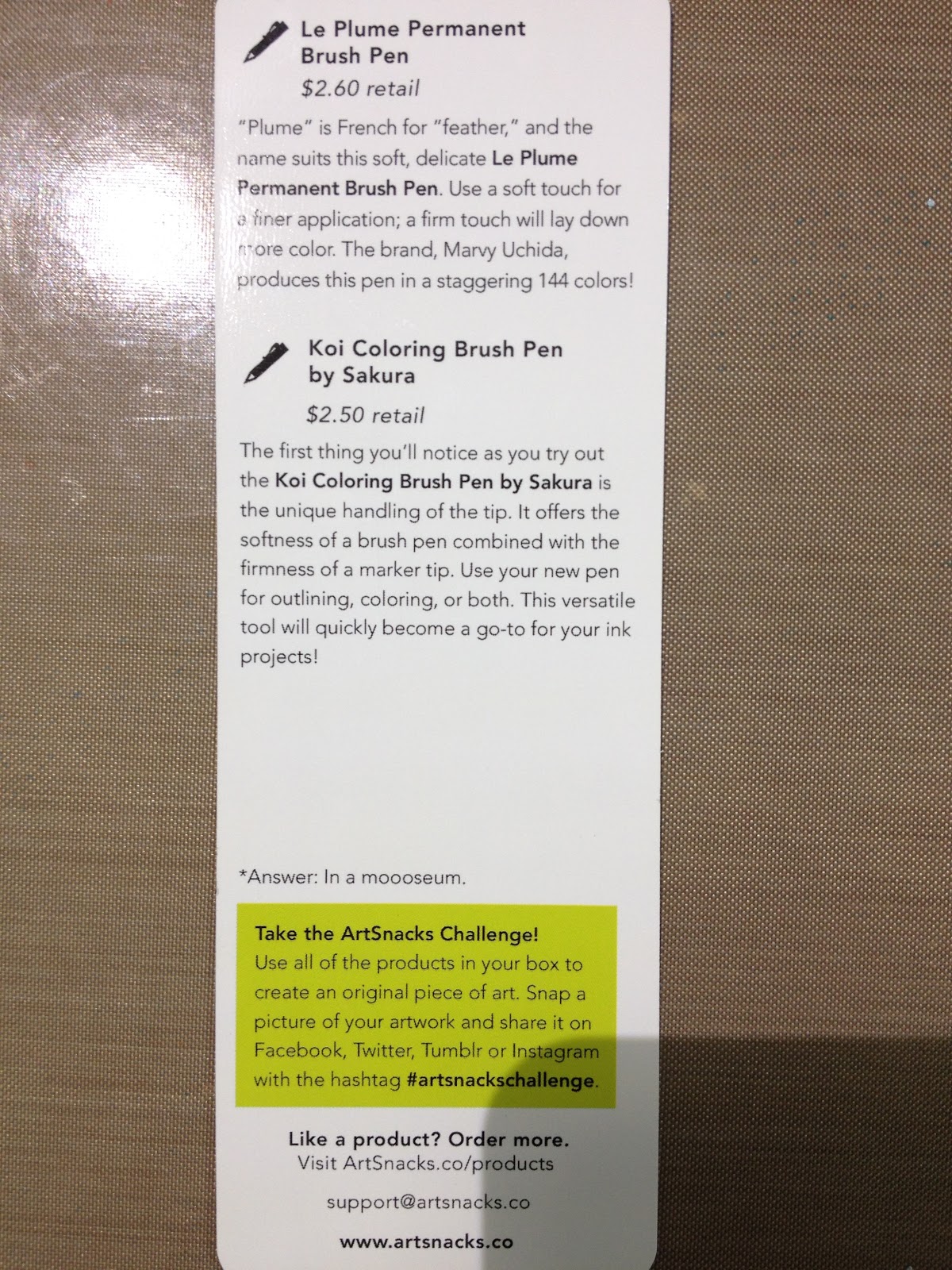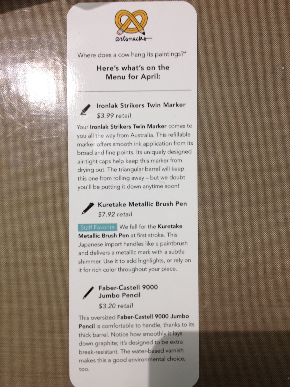 This month, ArtSnacks really impressed me with materials I'd seen online, but hadn't had the chance to try out. The Kuretake Metallic Brushpen, while almost identical to the Wink of Luna sent out in the February Box, is still novel enough to appeal to my art supply reviewer's heart.