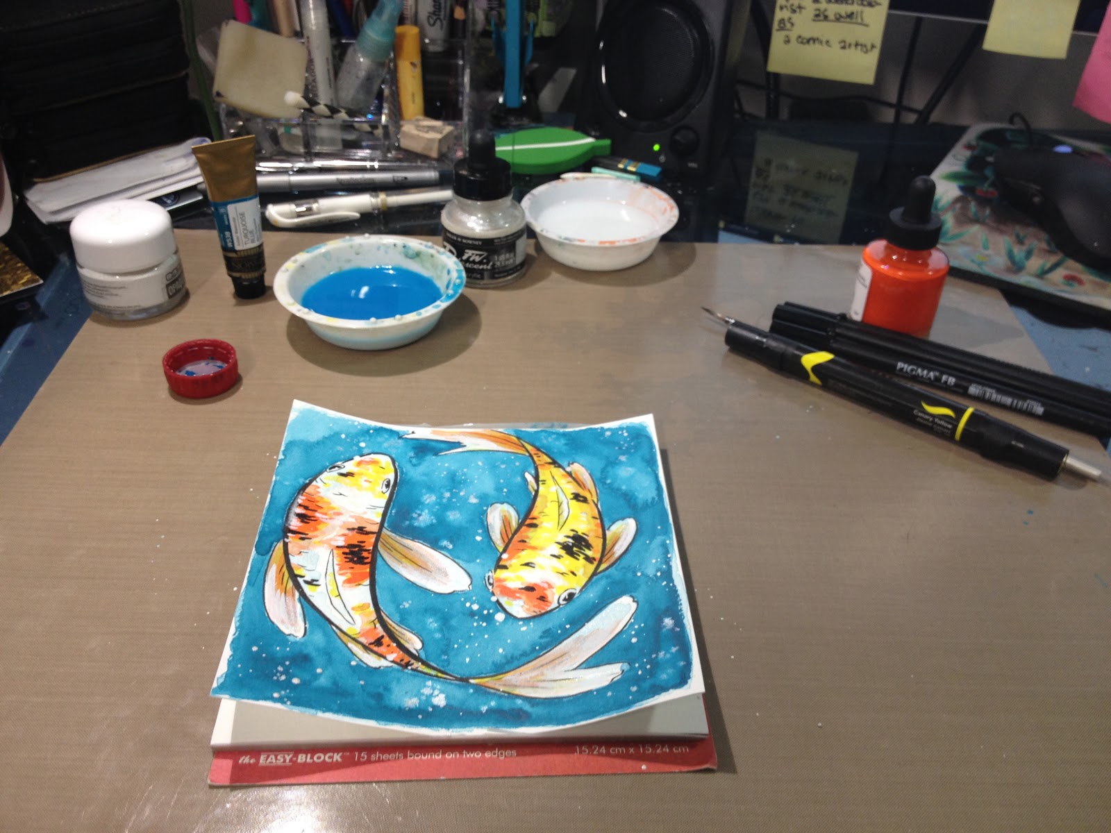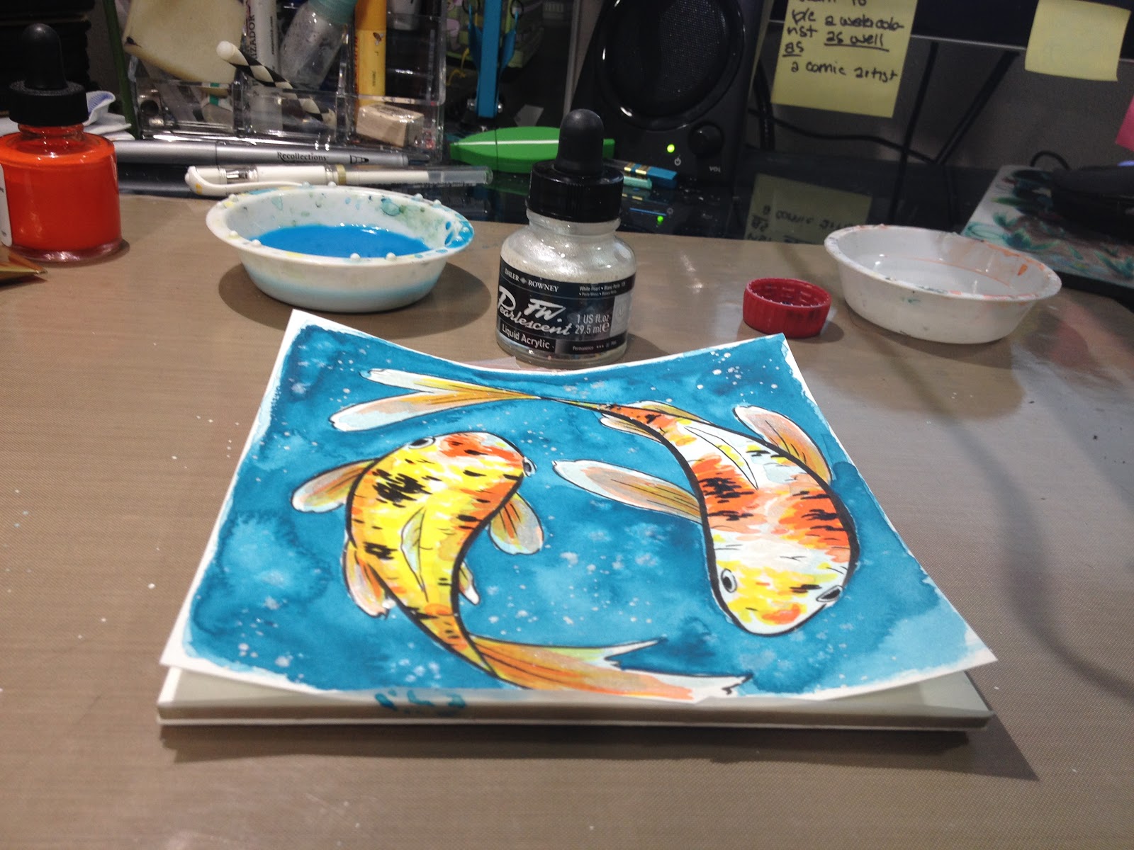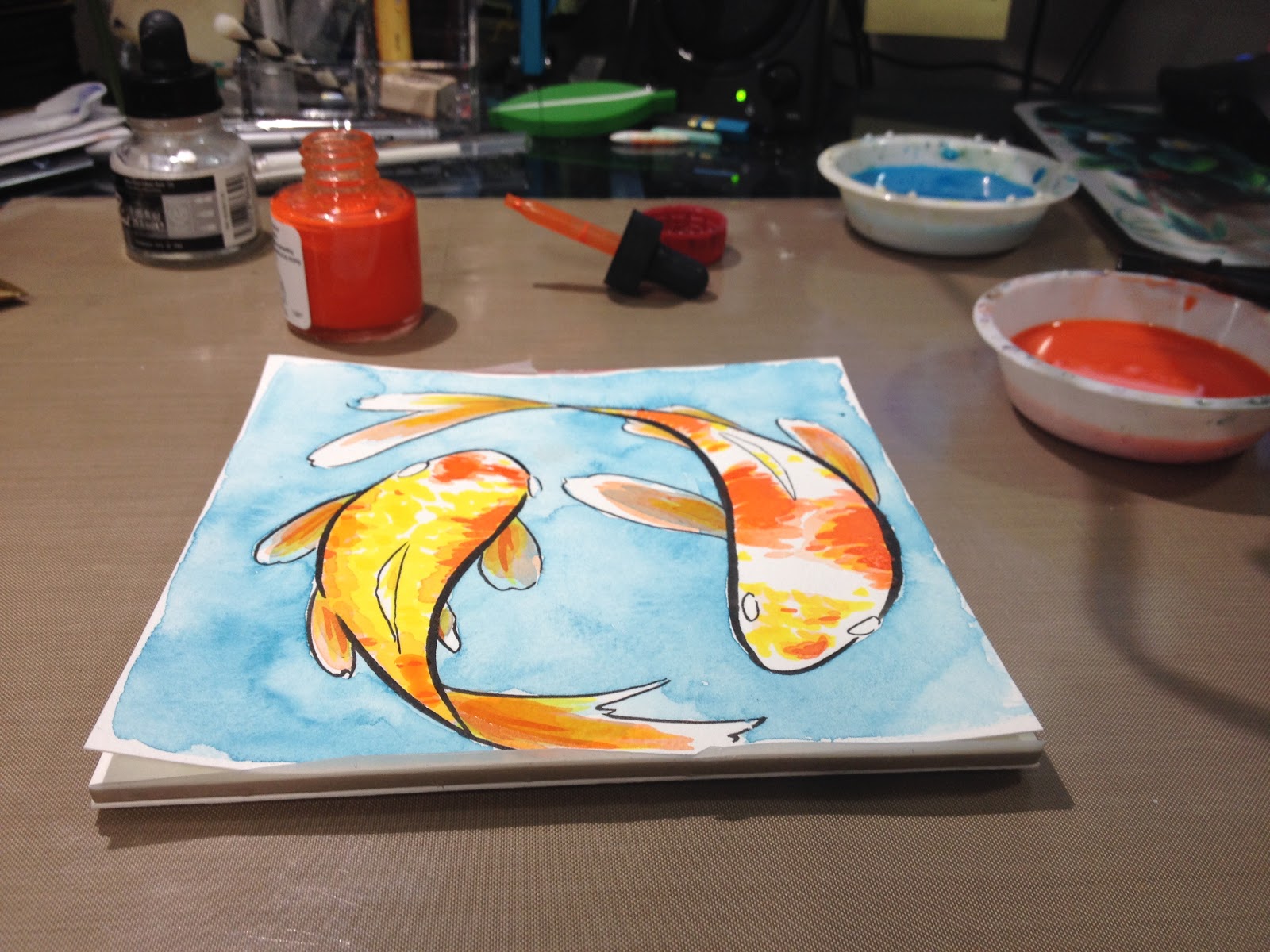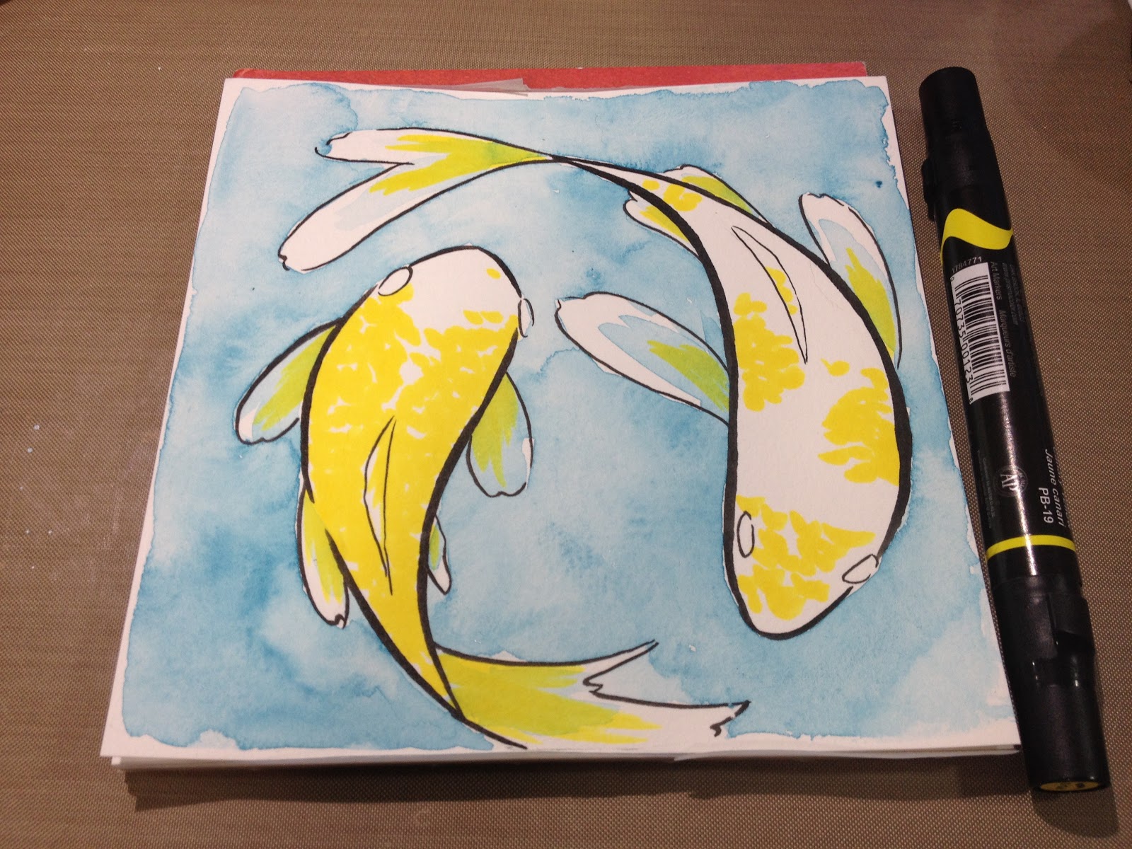 Once the wash dried, I began applying the koi's scales in the Prismacolor's Canary Yellow.