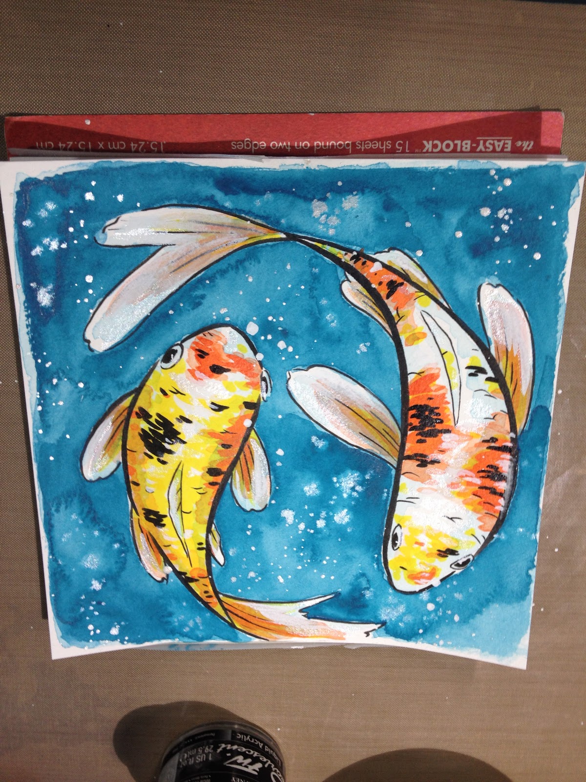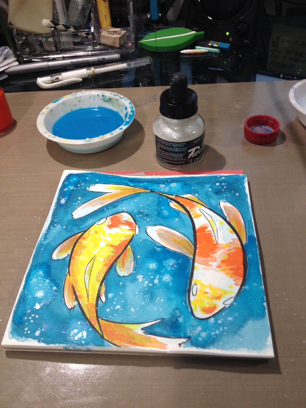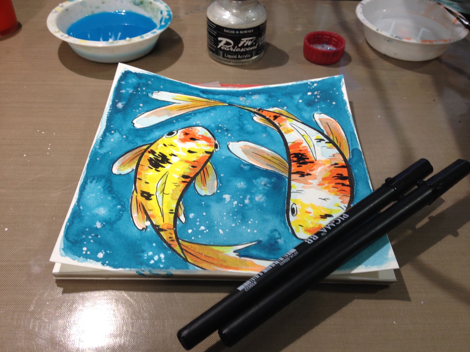 Once the wash dried, I began applying the koi's scales in the Prismacolor's Canary Yellow.