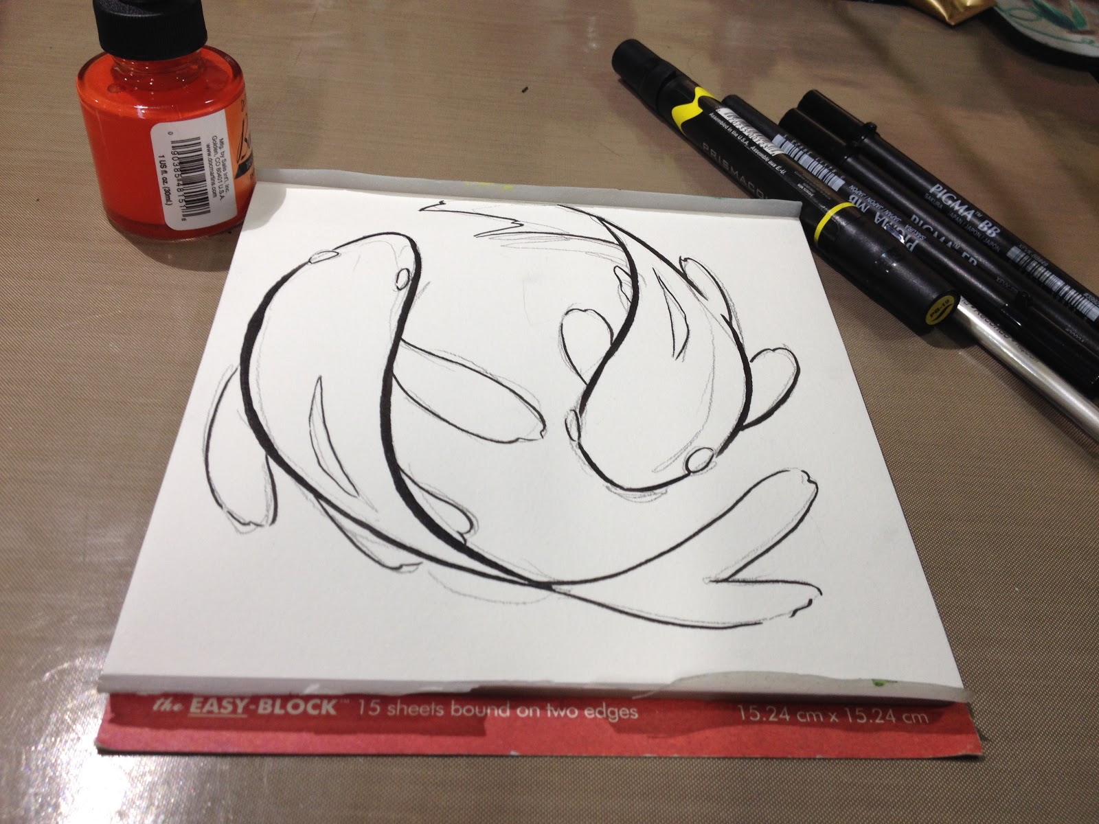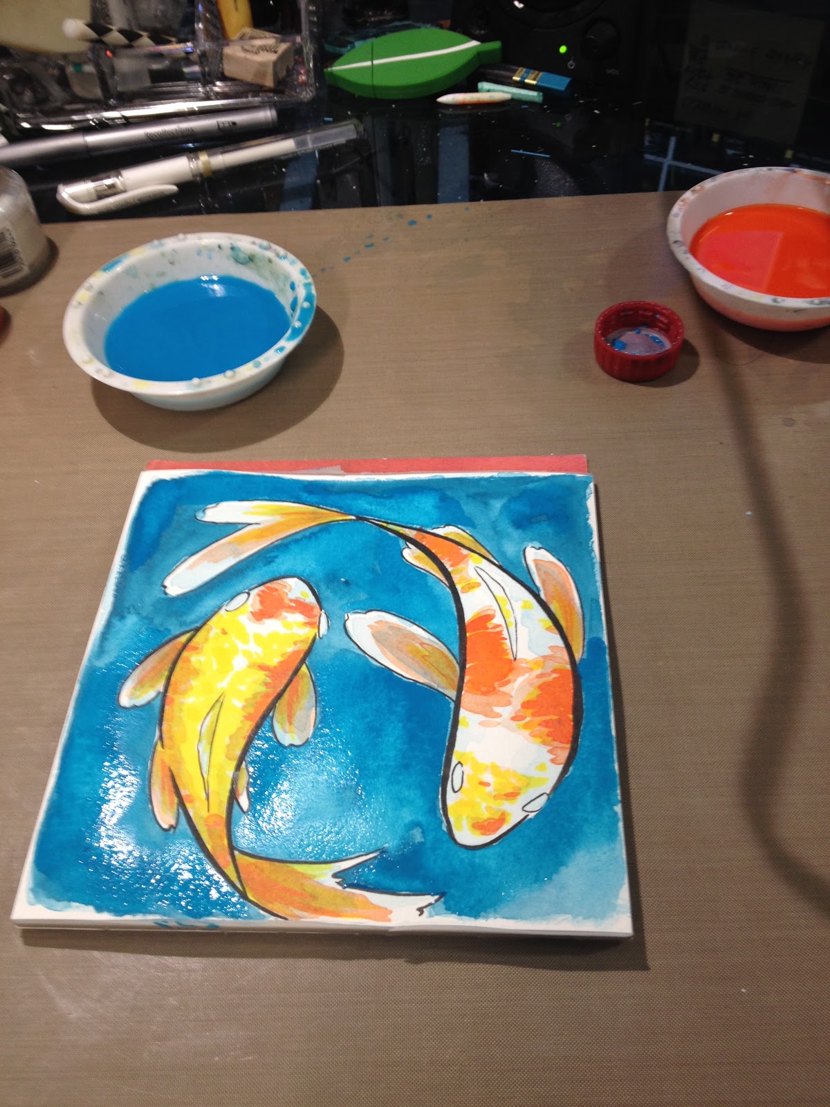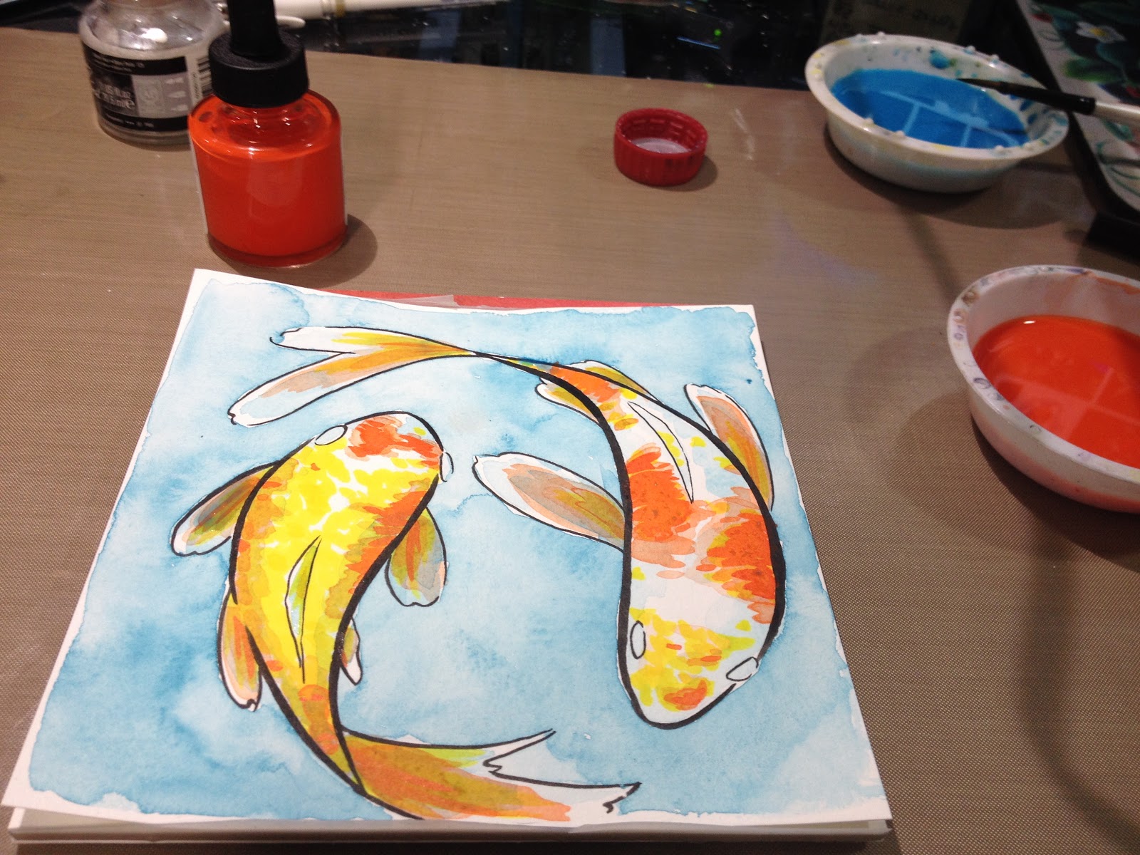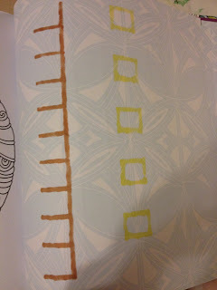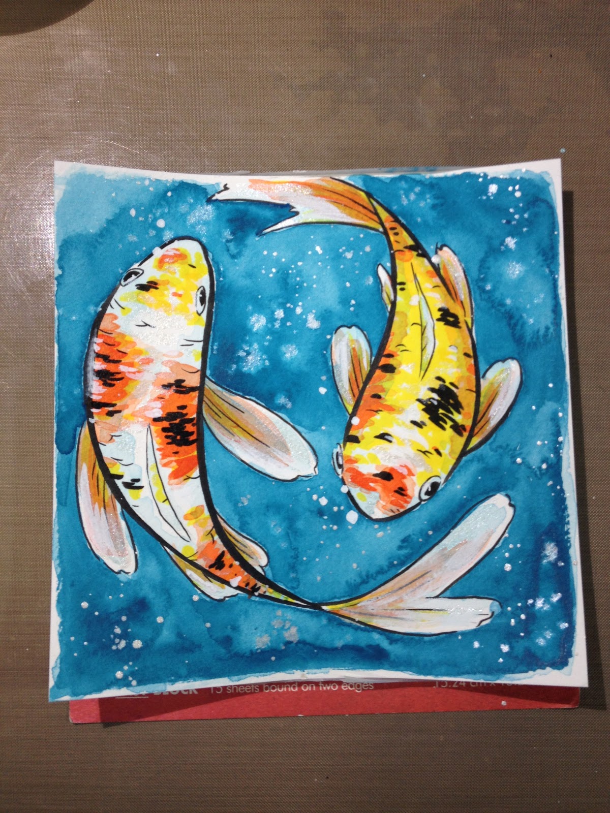 Once the wash dried, I began applying the koi's scales in the Prismacolor's Canary Yellow.
