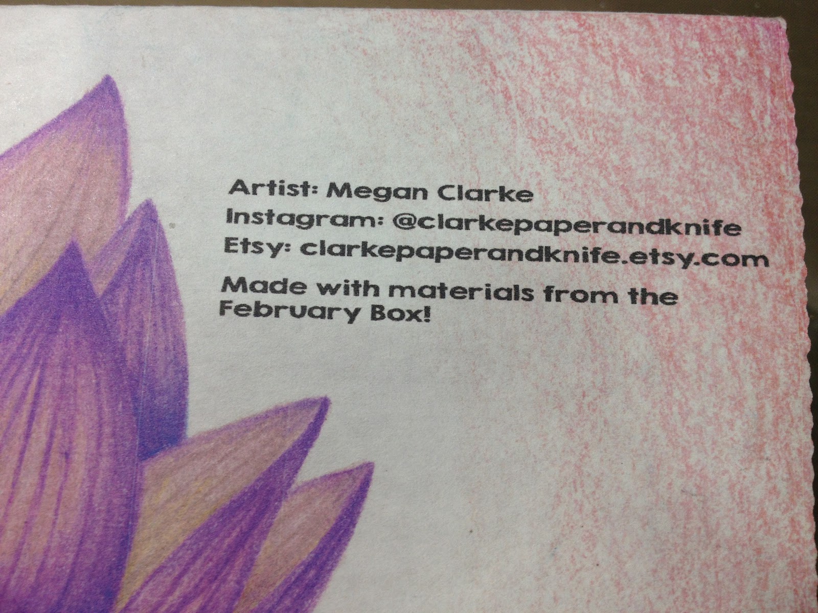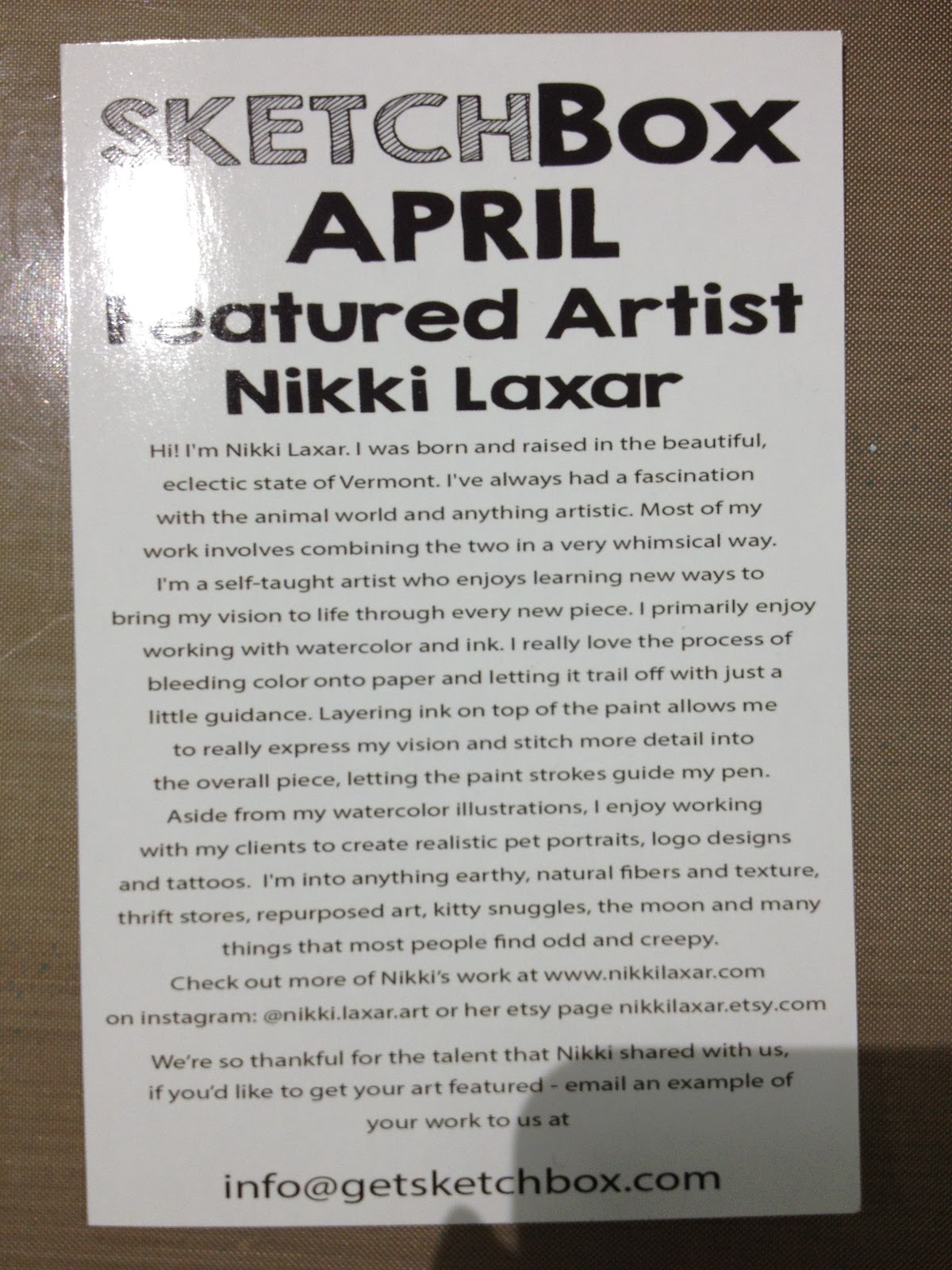 Another issue with SketchBox is the fact that they don't pay their artists in money, they pay them in exposure, which is a dirty word in the illustration and comic art communities. For all the promotion SketchBox gives their artists (which seems scant- I rarely see them give the illustrators whose work was featured on the box or the interior card more than a passing nod), these artists are providing SketchBox with art used to promote their service. While this is between the artists who knowingly contribute their art for SketchBox's use and SketchBox as a company, I wouldn't claim SketchBox is positively contributing to the arts community by doing this. Positive contribution would mean PAYING the artists, and would definitely raise SketchBox in the community, as they would become an employment opportunity, rather than just another company taking advantage of artists who may not know better. As a fellow artist, I try to always make it a point to not only read the cards out clearly for my audience, but to transcribe them here. If these artists are only paid in exposure, then that exposure needs to actually be able to do something for them. If SketchBox won't promote their work properly, then as a fellow artist, it's my duty to try and have their (the artists') backs.