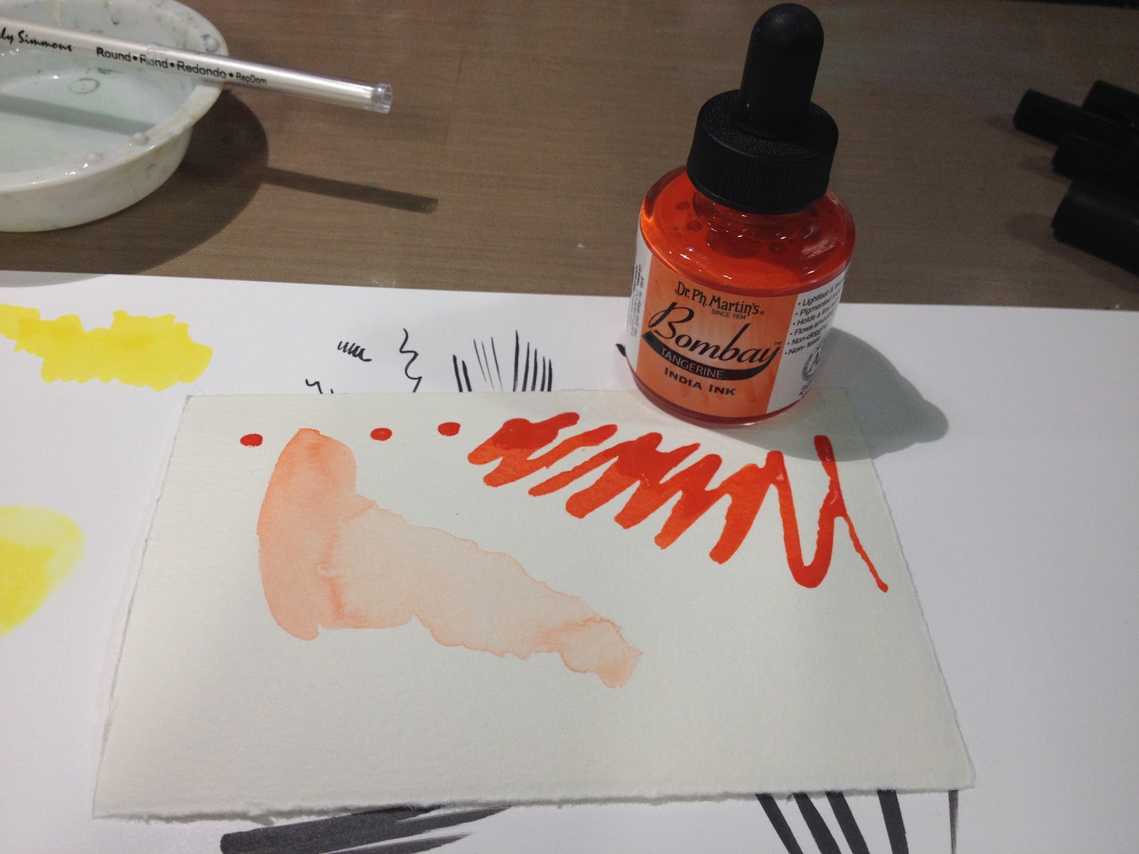 India ink is waterproof once dry (but not alcohol marker proof ever- the alcohol solution will reactivate the shellac), and I recommend allowing it to dry for 24 hours. Bombay is available in a range of vibrant colors, and while I have a few myself, the Tangerine ink sent by SketchBox Basic was a new one to me.