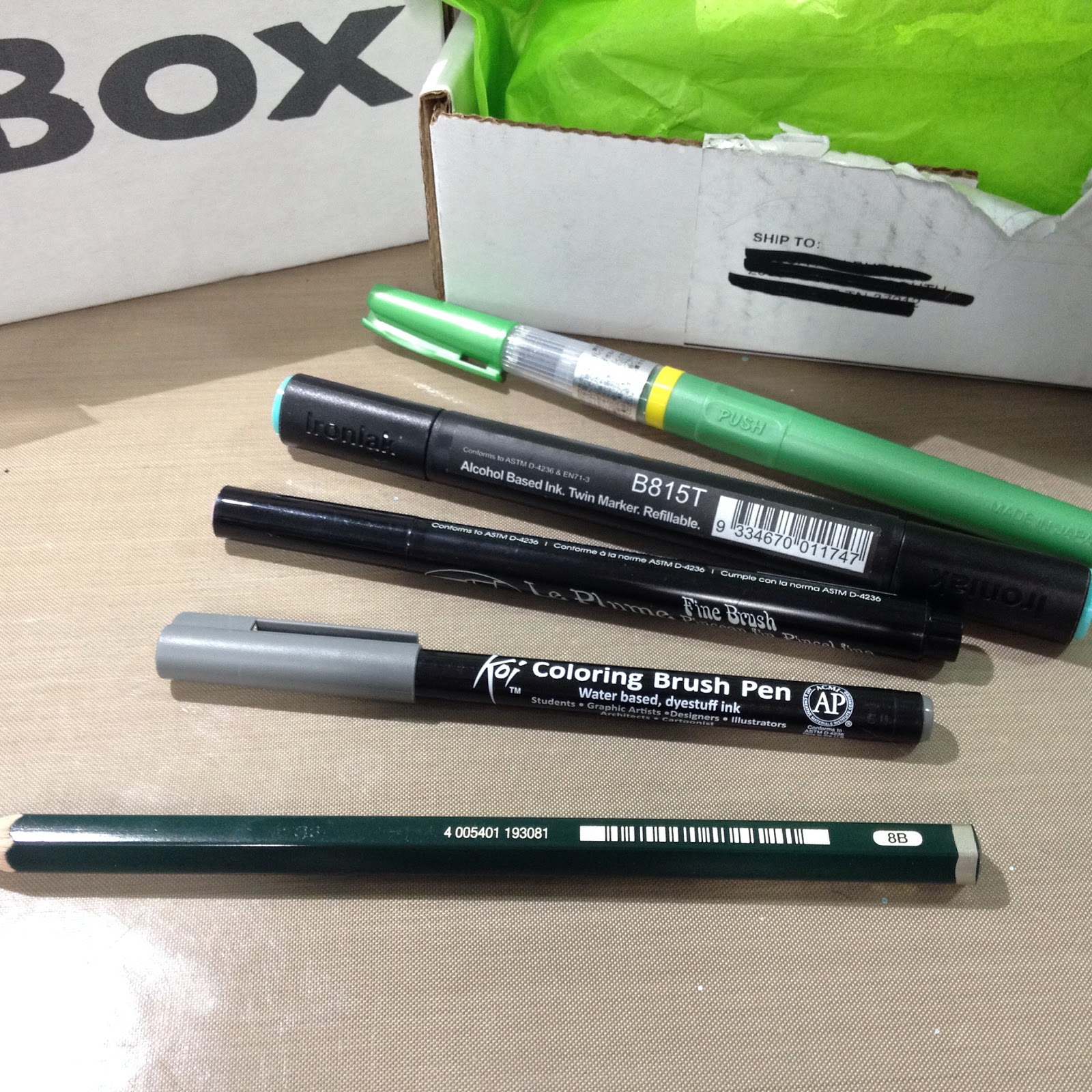 The only downside is that I wish ArtSnacks kept track of which colors were sent to people over the course of their boxes. I have two Tombow Irojiten pencils in Kingfisher Blue from ArtSnacks, and now two waterbased Kuretake metallic brushpens in the same shade of green. This is a fairly minor quibble, but it makes it difficult for me to utilize ArtSnacks as a way to fill out my studio.