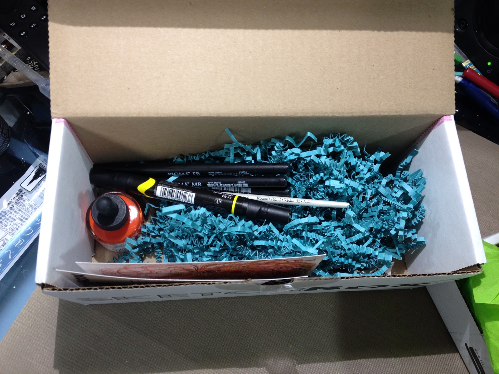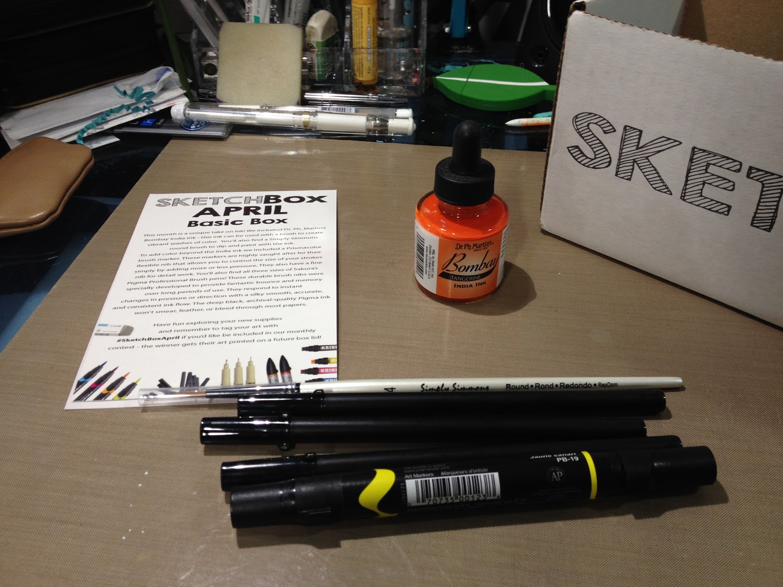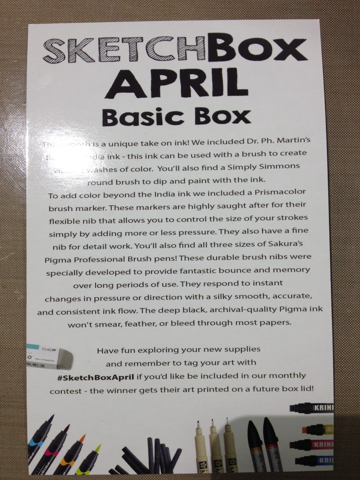When comparing the Basic and Premium boxes each month, I have to wonder what SketchBox defines as 'premium'. Is it solely based on price? In what world is the Kurecolor S, which is refillable yes, but the refills are difficult to come by, and only comes in chisel and bullet nibs, more premium than a Prismacolor brush tipped marker? Is it the same world where Daler Rowney Calli ink, which tends to be thin with unimpressive coverage, more 'premium' than Dr. PhMartin's Bombay? And if I had opted for the Premium Box this month, and received, yawn, Staedtler pigment fineliners instead of the fantastic Pigma brush pens, I would definitely feel annoyed and a little cheated. If SketchBox utilized tutorials (as suggested multiple times in the past) to increase the value of their boxes, I would be willing to suspend disbelief (and annoyance) and let them learn me something new, but as it is, I can only go by what the included cards and the website tell me, and that isn't much.
