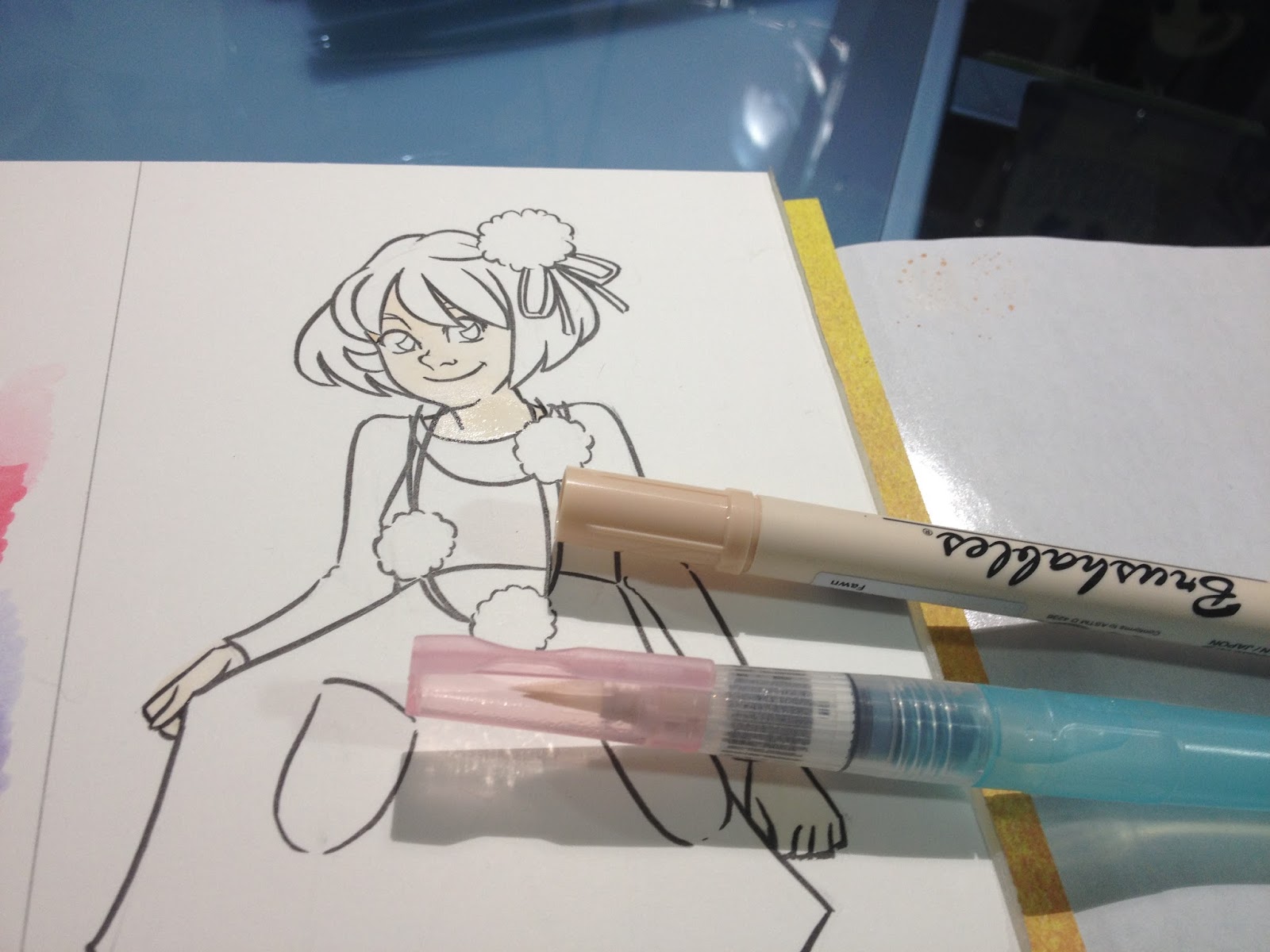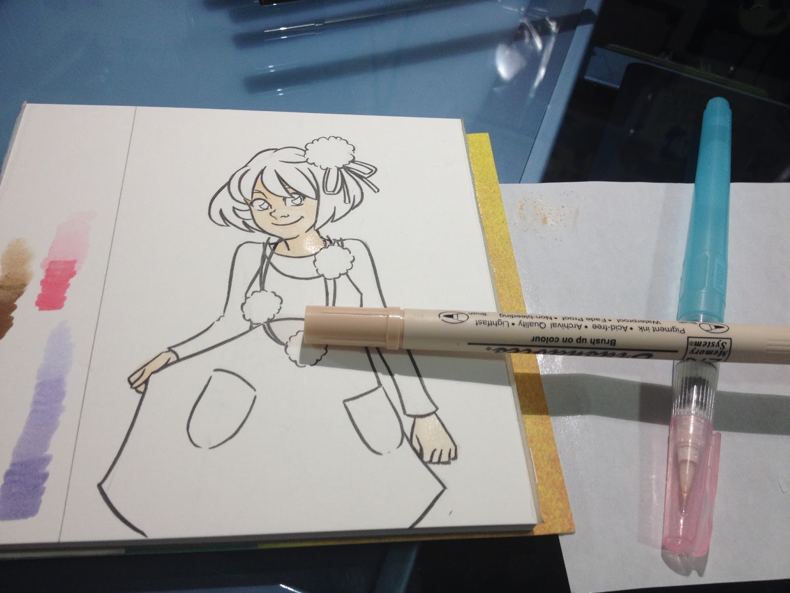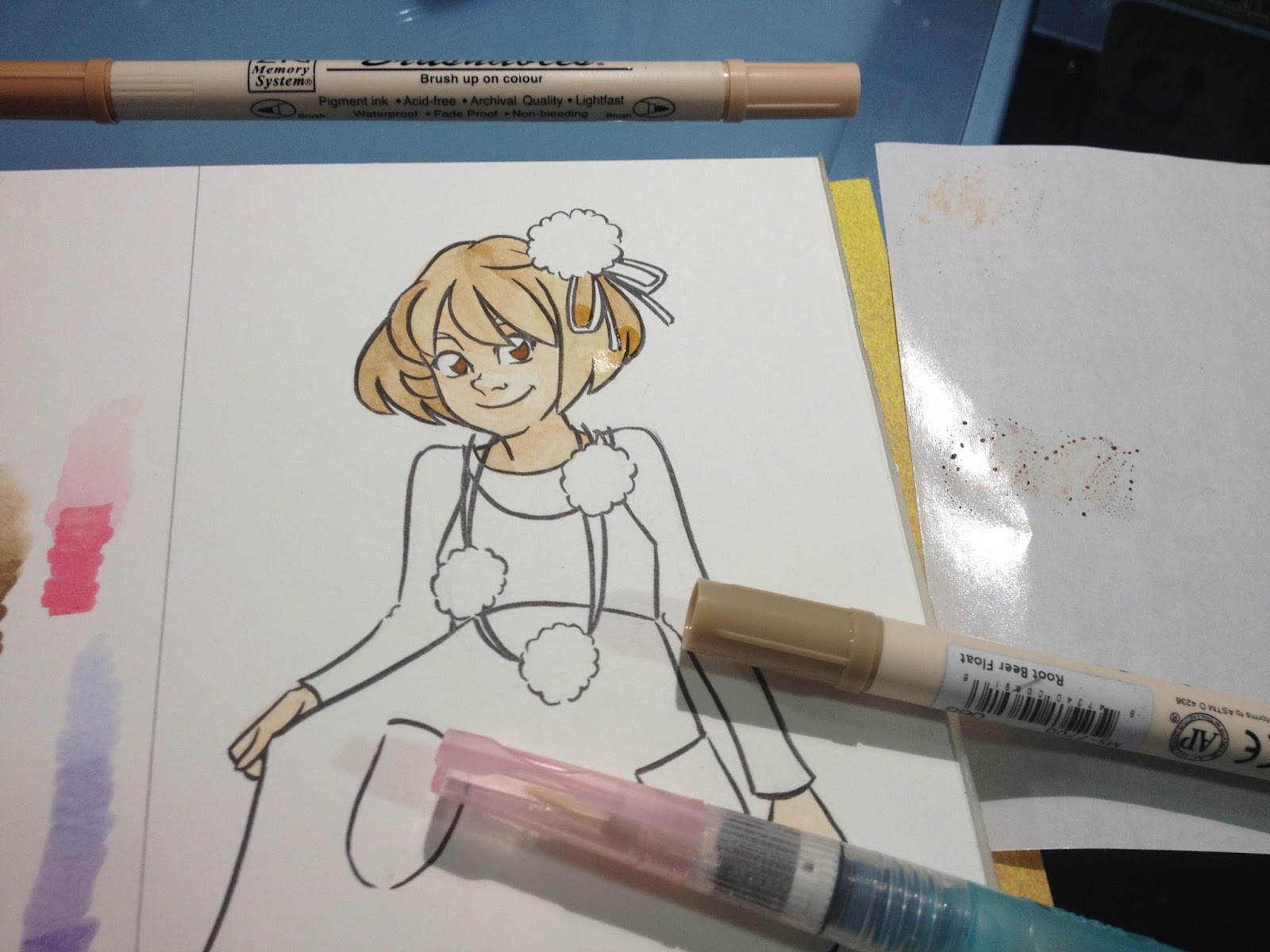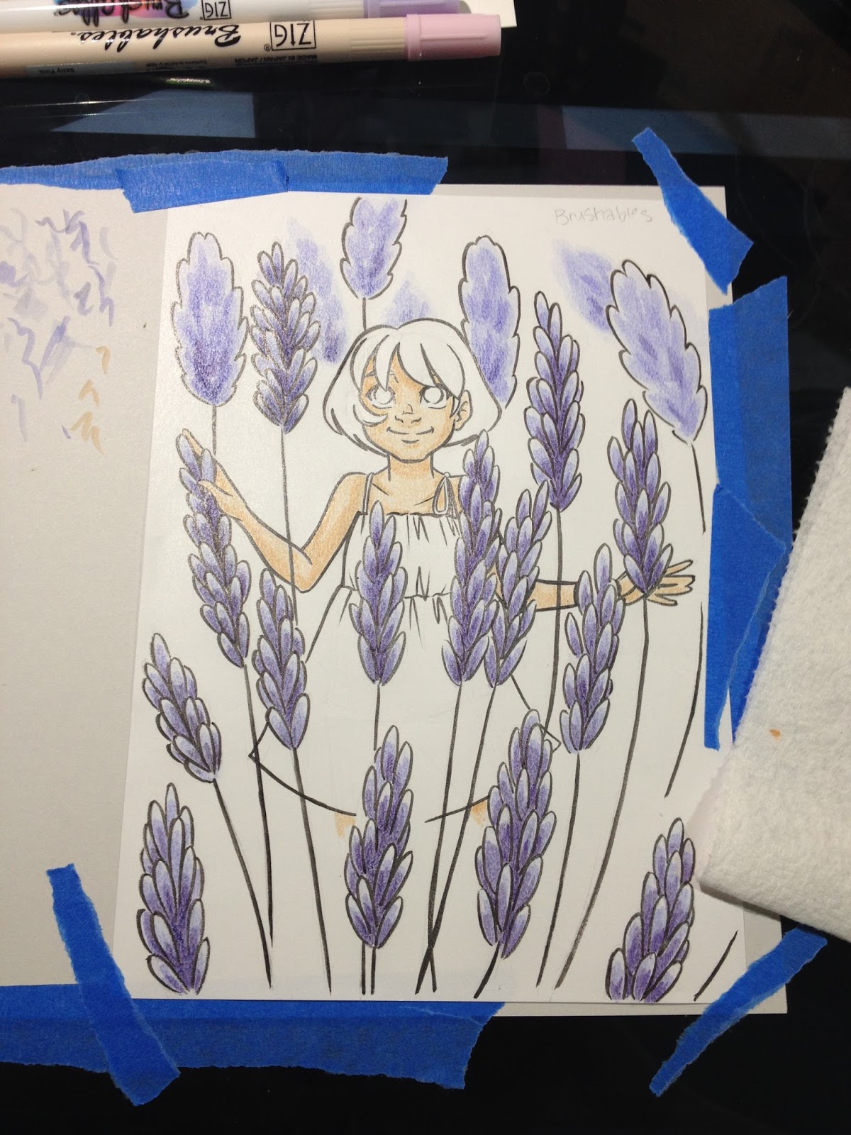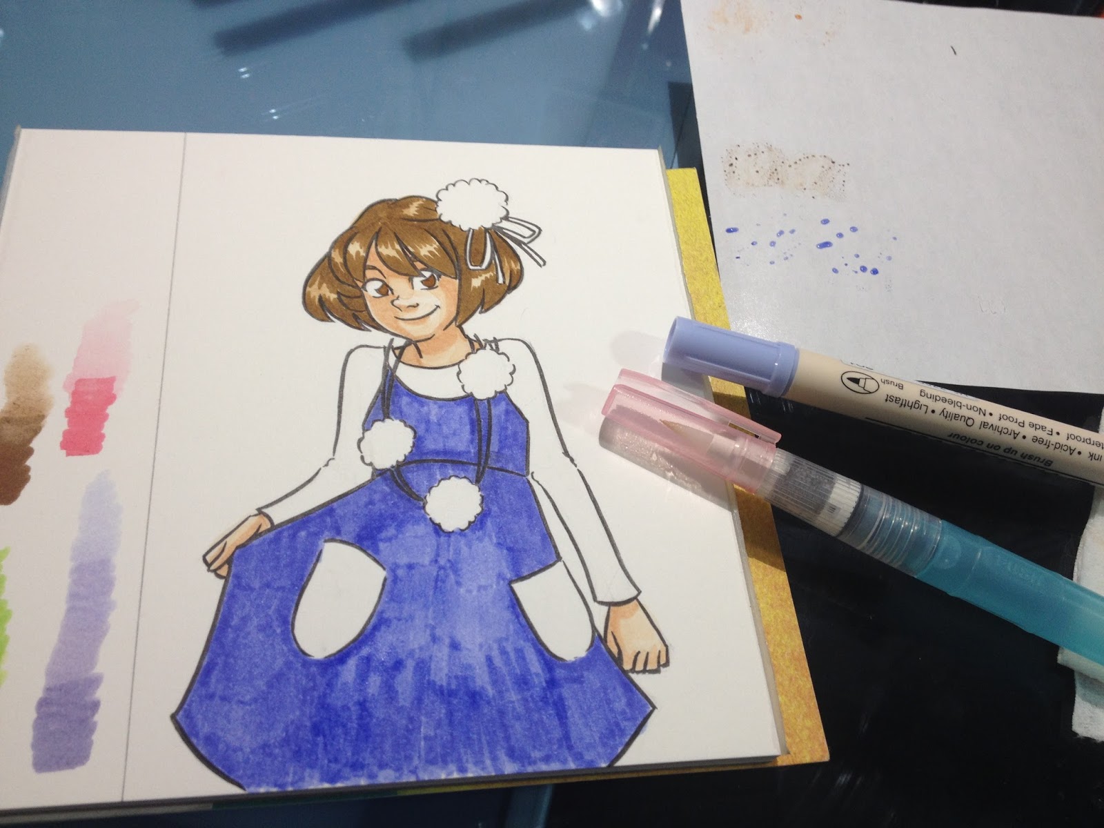 Sailor Mitsuo Aida ink on Winsor and Newton Pigment Marker Paper, Zig Brushables and Zig Art and Graphic TwinThis little illustration of Kara in lavender was completed as part of my review for Zig Brushables waterbased markers. I loved how they handled on the Winsor and Newton Pigment paper, but didn't love that they reactivated my ink. I've since found that pretty much ANYTHING will reactivate Sailor Mitsuo Aida ink on Pigment Marker Paper, so I'm giving the Brushables a shot on a couple different types of coated marker paper.