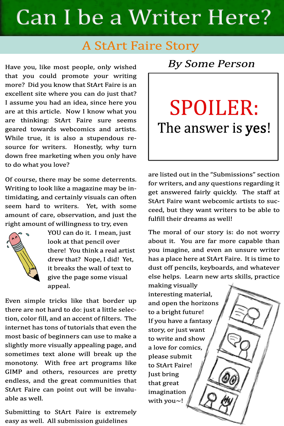 Submitting is huge, I think a lot of people think they can only submit a Magazine Exclusive Comic, and that’s really just one aspect of the magazine. There are so many other ways to submit. We’re looking for articles, tutorials, ads, we’re open to every and anything right now so if you have an idea please don’t shy away from throwing it out there for us to see. Because we’re new this is such a great opportunity since the potential for what we can allow in is still wide open. Other ways people can help is by mentioning StArt Faire on forums and social media sites where other people may be interested in it. Reading the magazine when it comes out is also a great way to help support it. Sharing it, talking about, supporting the creators who are dedicating their time to it by reading their other works and letting them know what you think. Feedback is in itself such a great way to support artists since so often being an artist is like screaming into a void. And then of course helping to support those artists on their Patreons if they have one or choose to have one in the future.
