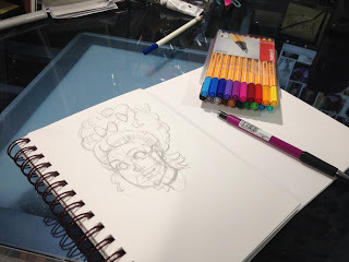 Sailor Mitsuo Aida ink on Strathmore canvas paper, Winsor and Newton Pigment MarkersStrathmore's linen paper for acrylics turned out to handle the pigment markers best for how I like to render- no smeared ink, fairly easy to layer, drying times didn't matter as much.