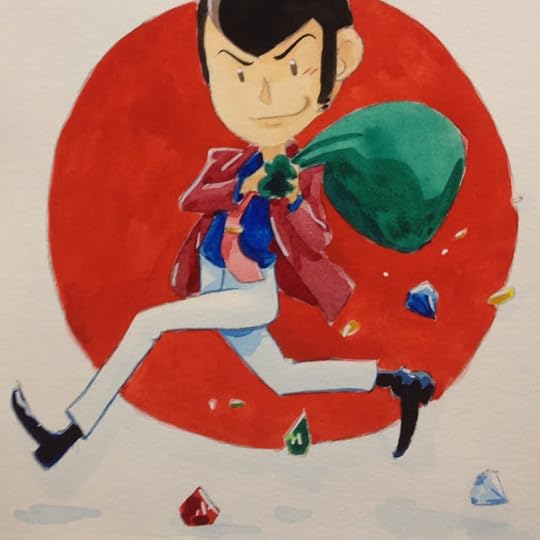 Sailor Mitsuo Aida ink on Arches rough press watercolor block, Kuretake Gansai Tambi watercolorsThis piece was a field test for the Kuretake Gambi Tansai watercolor set Heidi Black sent me as a Christmas present. I inked it with a Sailor Mitsuo Aida brushpen, and used my normal sable and squirrel brushes to paint on Arches Rough watercolor paper.