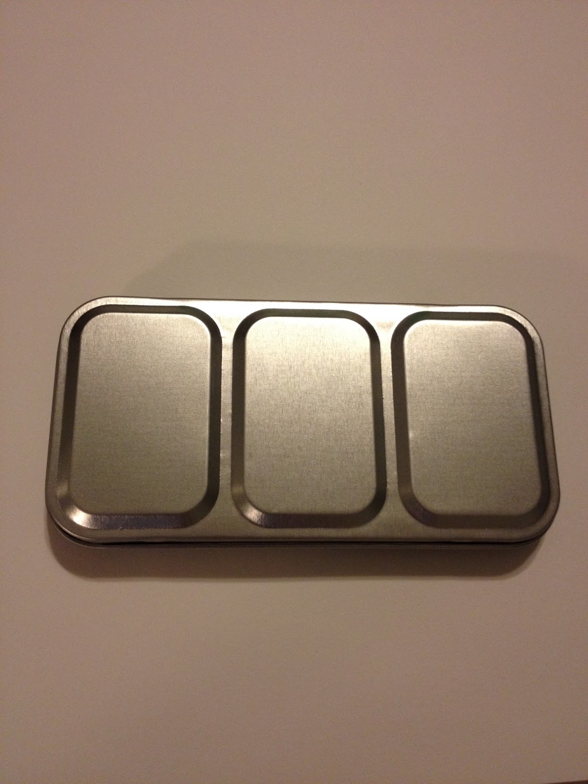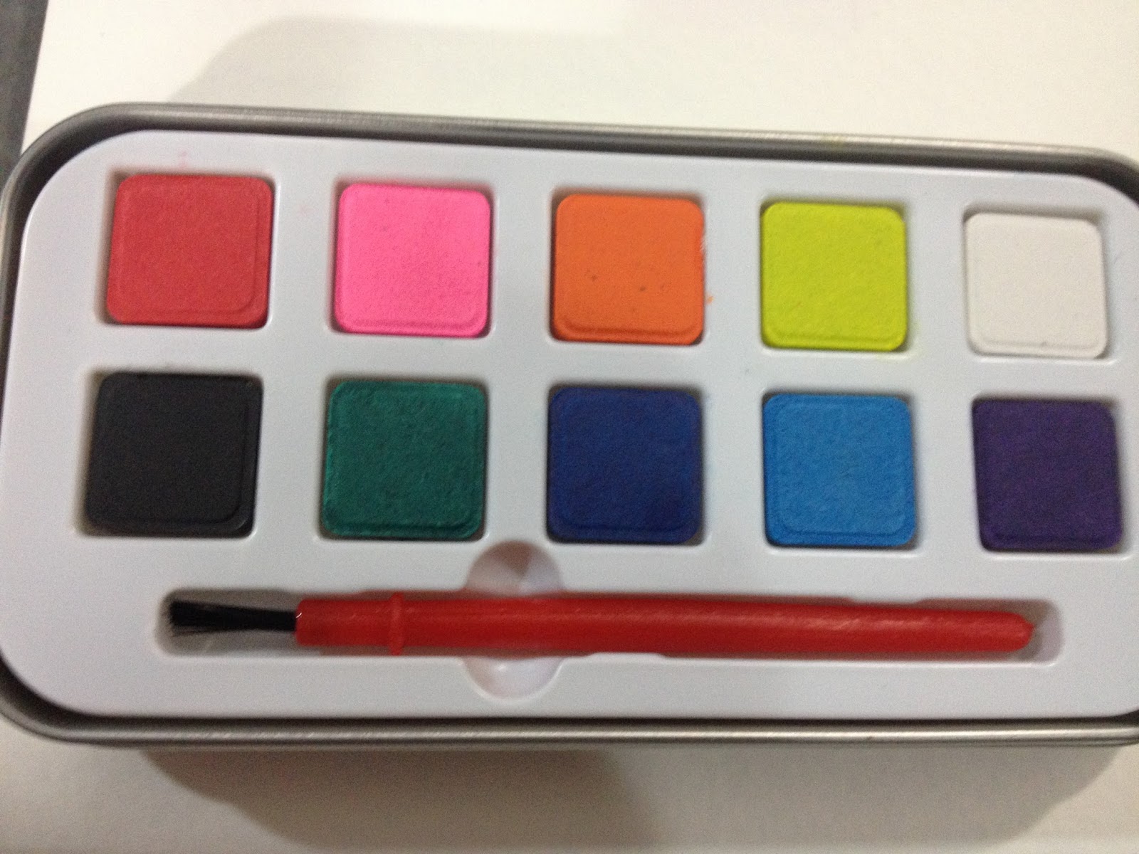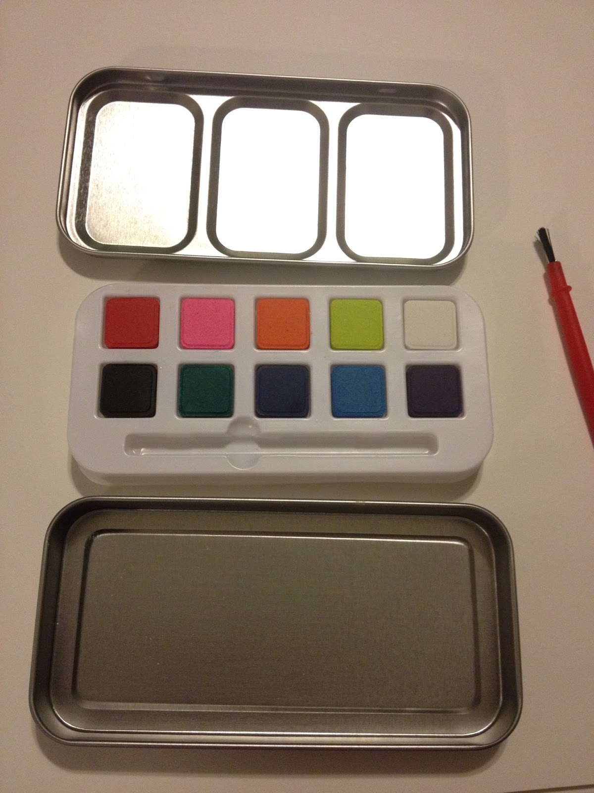 The chicklets of watercolor come in a little tin box that has wells for mixing color, and are in a removable plastic insert that feels very very cheap.