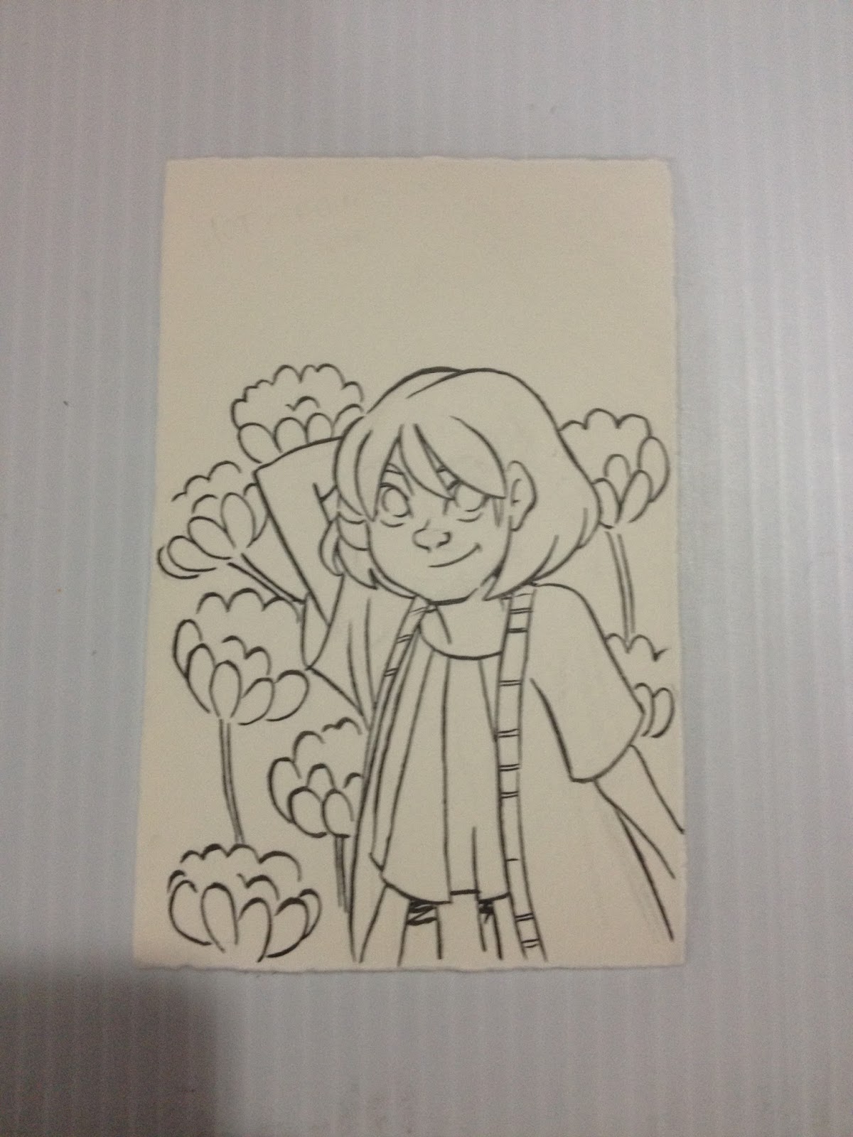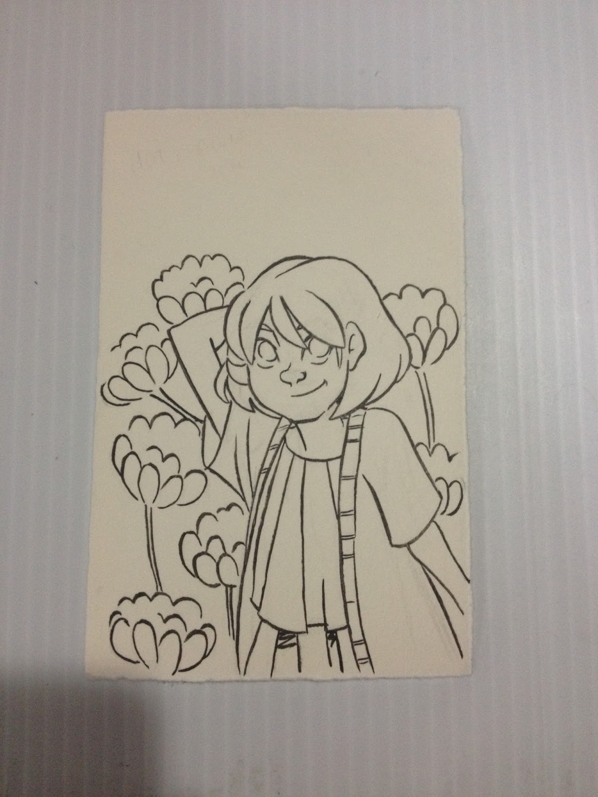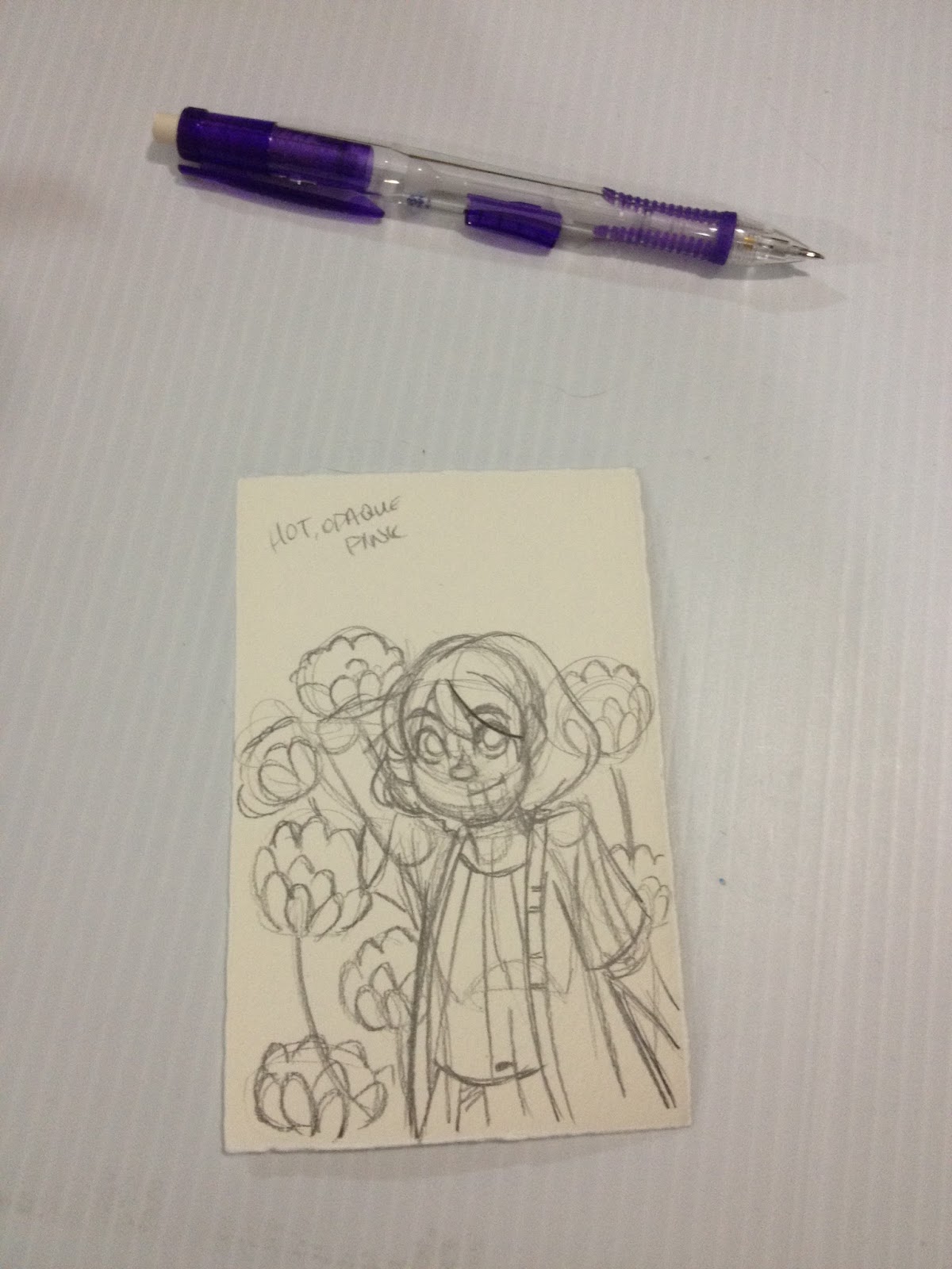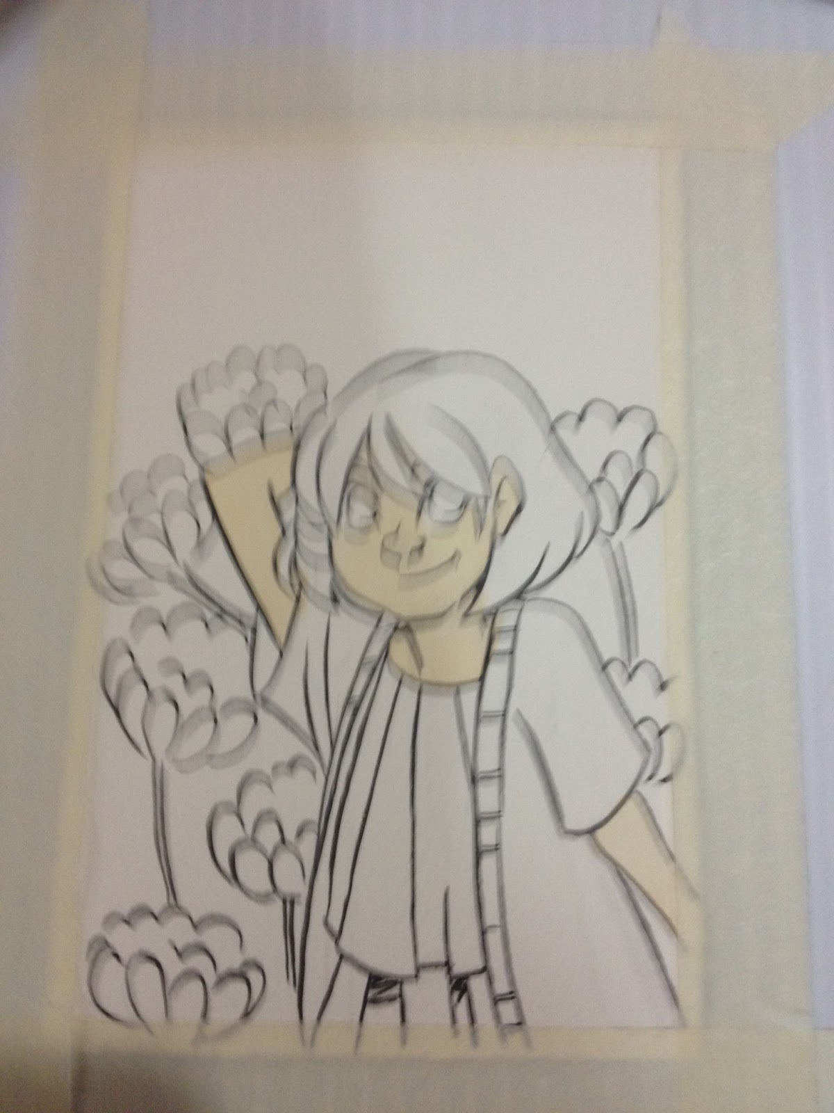 1. Pencil an image on nice watercolor paper that doesn't have too rough a texture (Fluid pads, Fabriano pretorn watercolor paper)