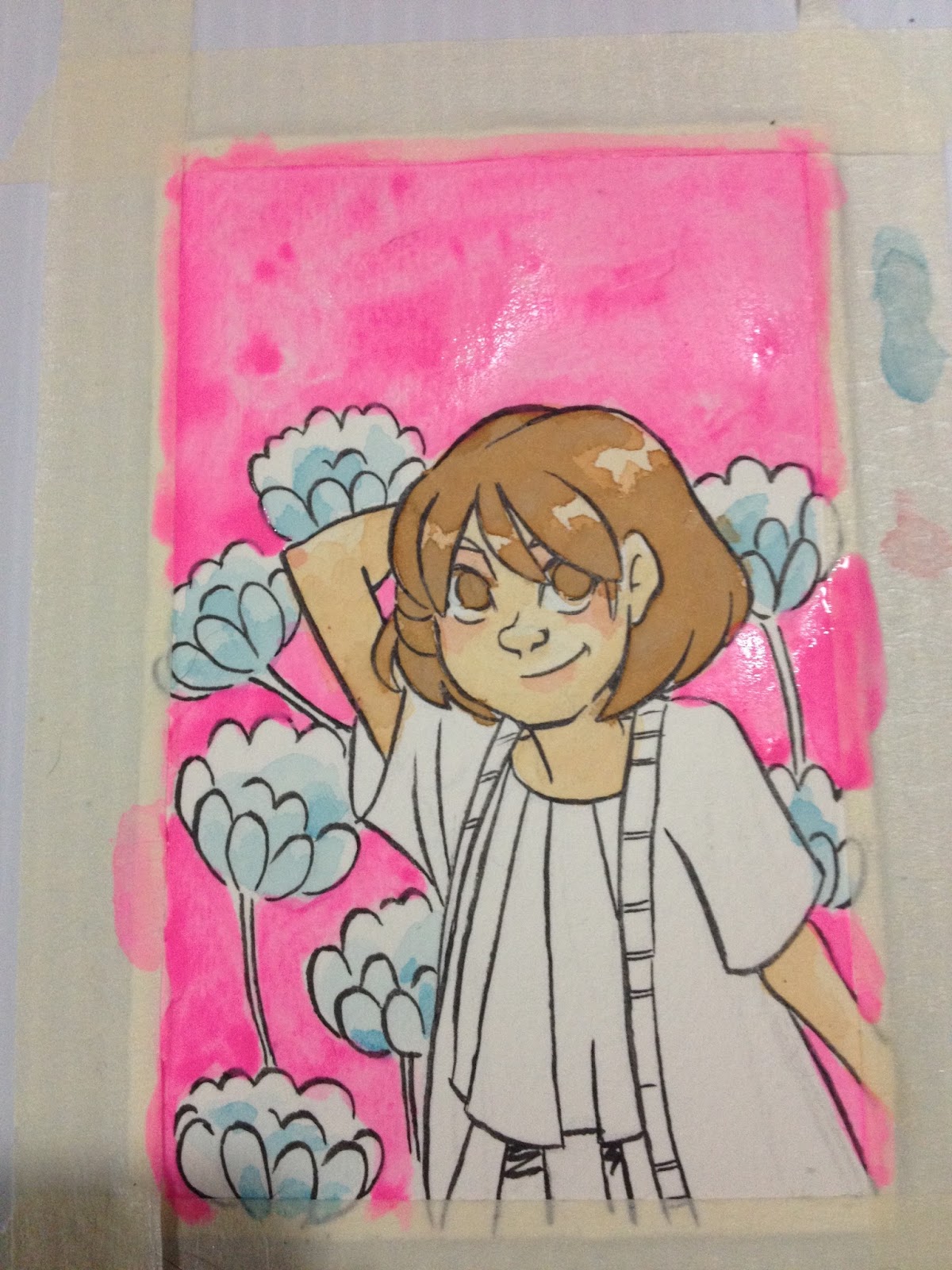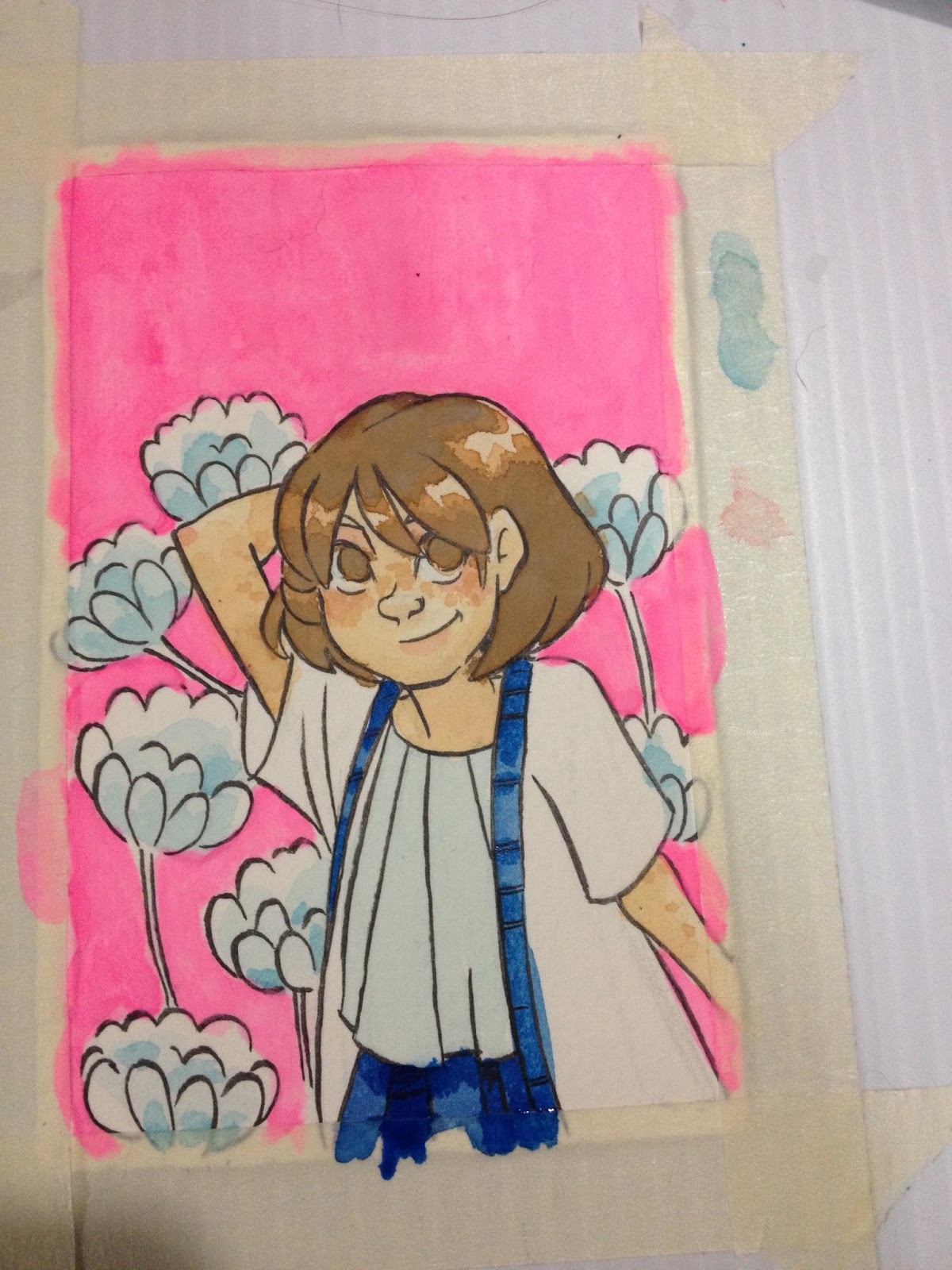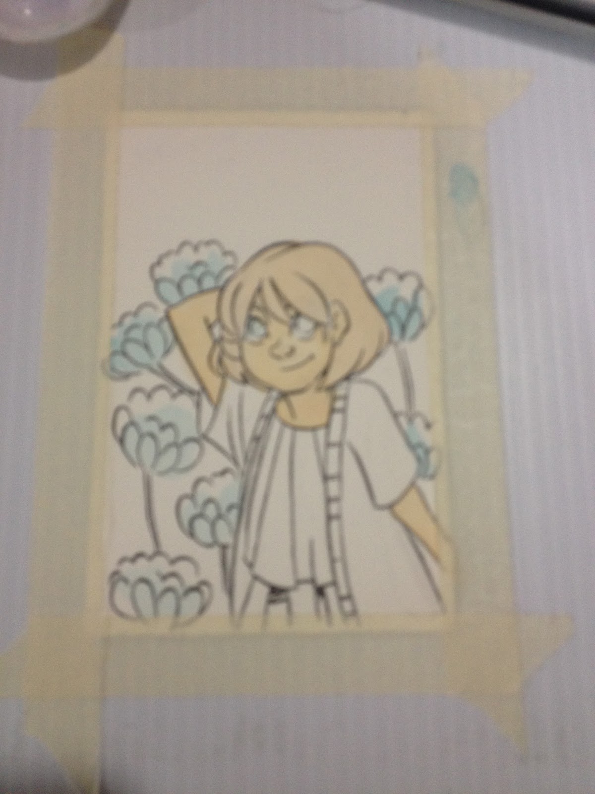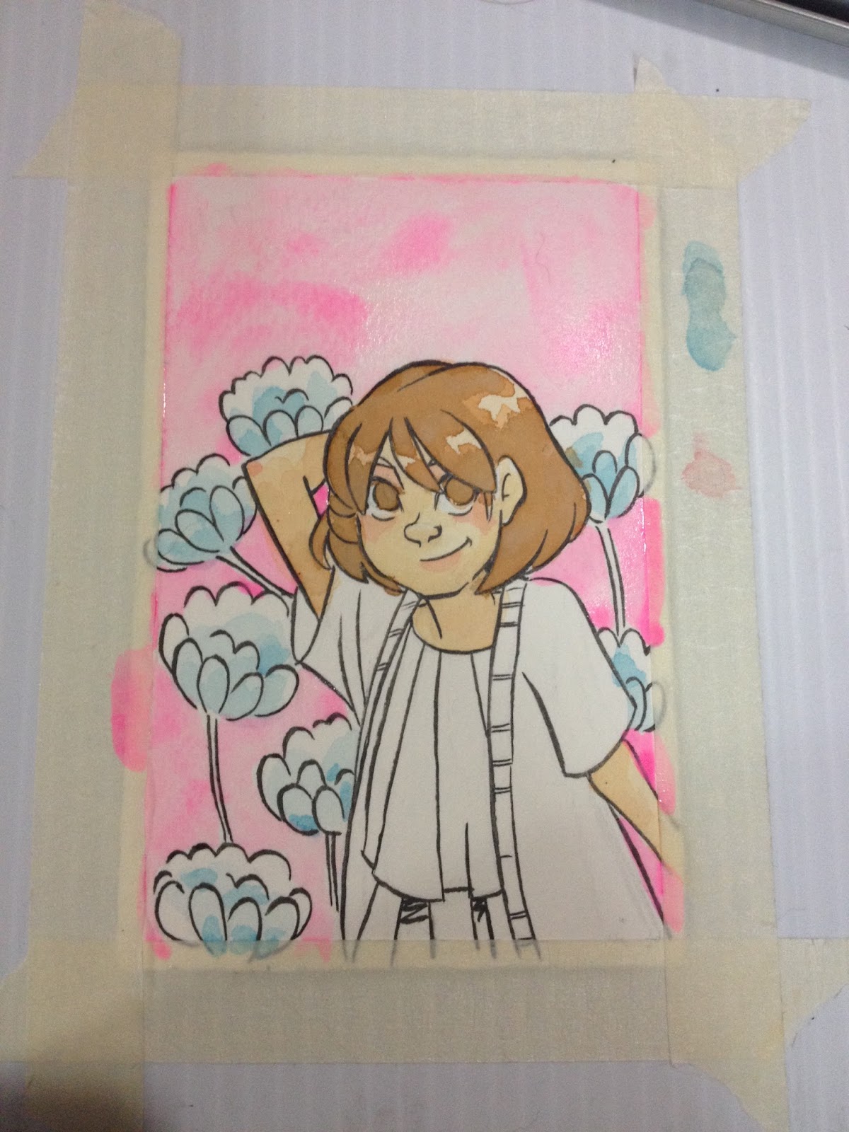 1. Pencil an image on nice watercolor paper that doesn't have too rough a texture (Fluid pads, Fabriano pretorn watercolor paper)