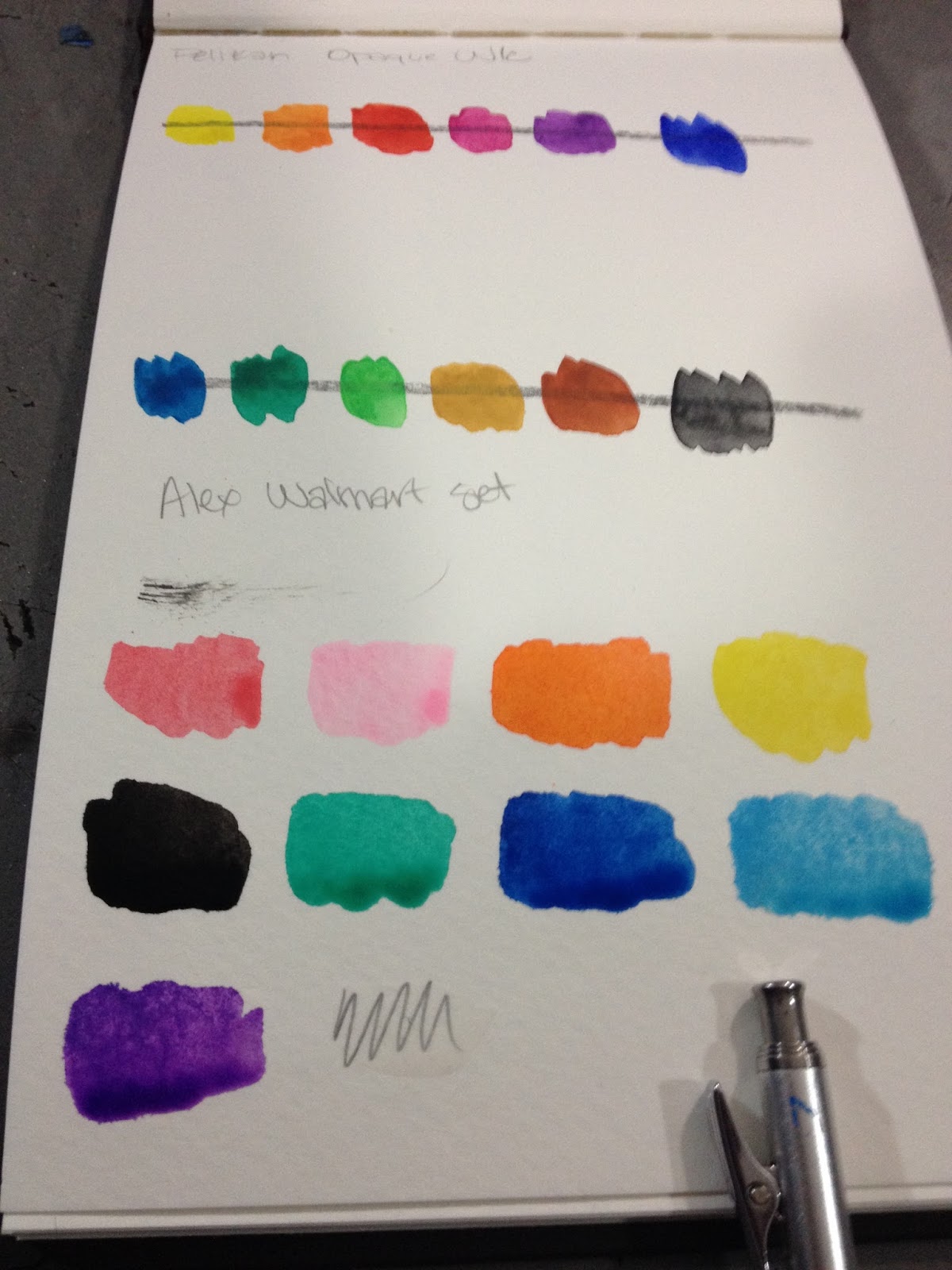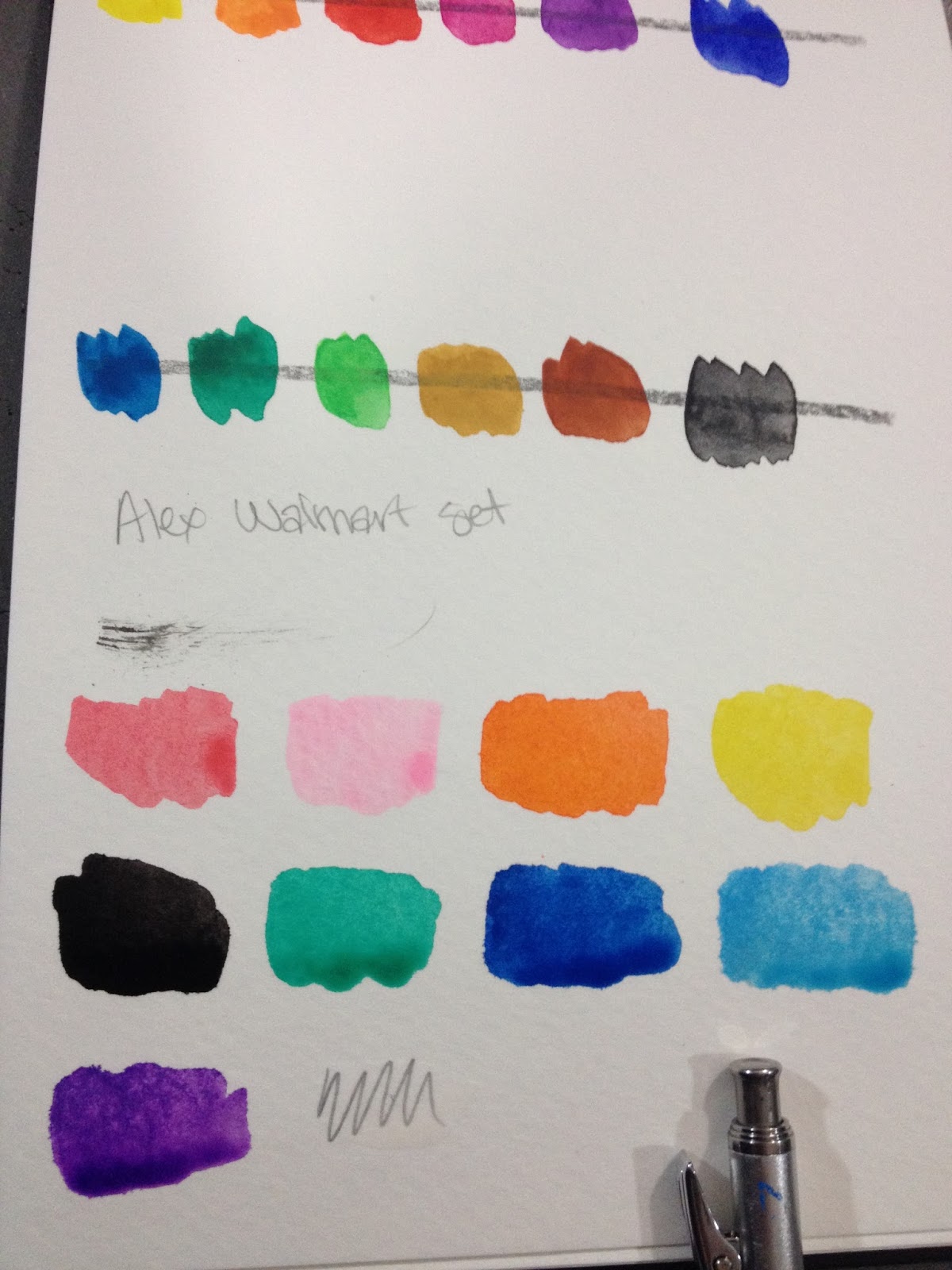 Above is one of the two palettes I regularly use for serious watercolor illustration- 7" Kara comic pages, Gizmo Grandma Illustrations, ect. Below is the Alex palette. As you can see, there are a lot of differences between the two paint sets.