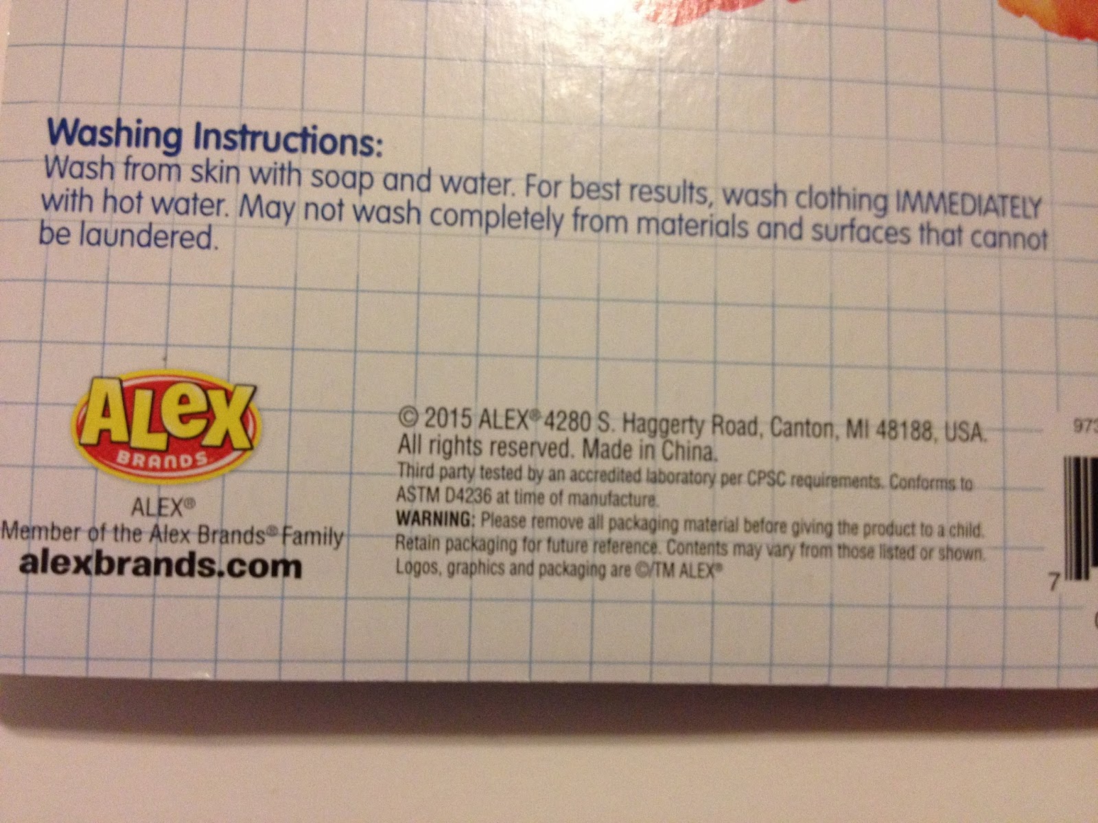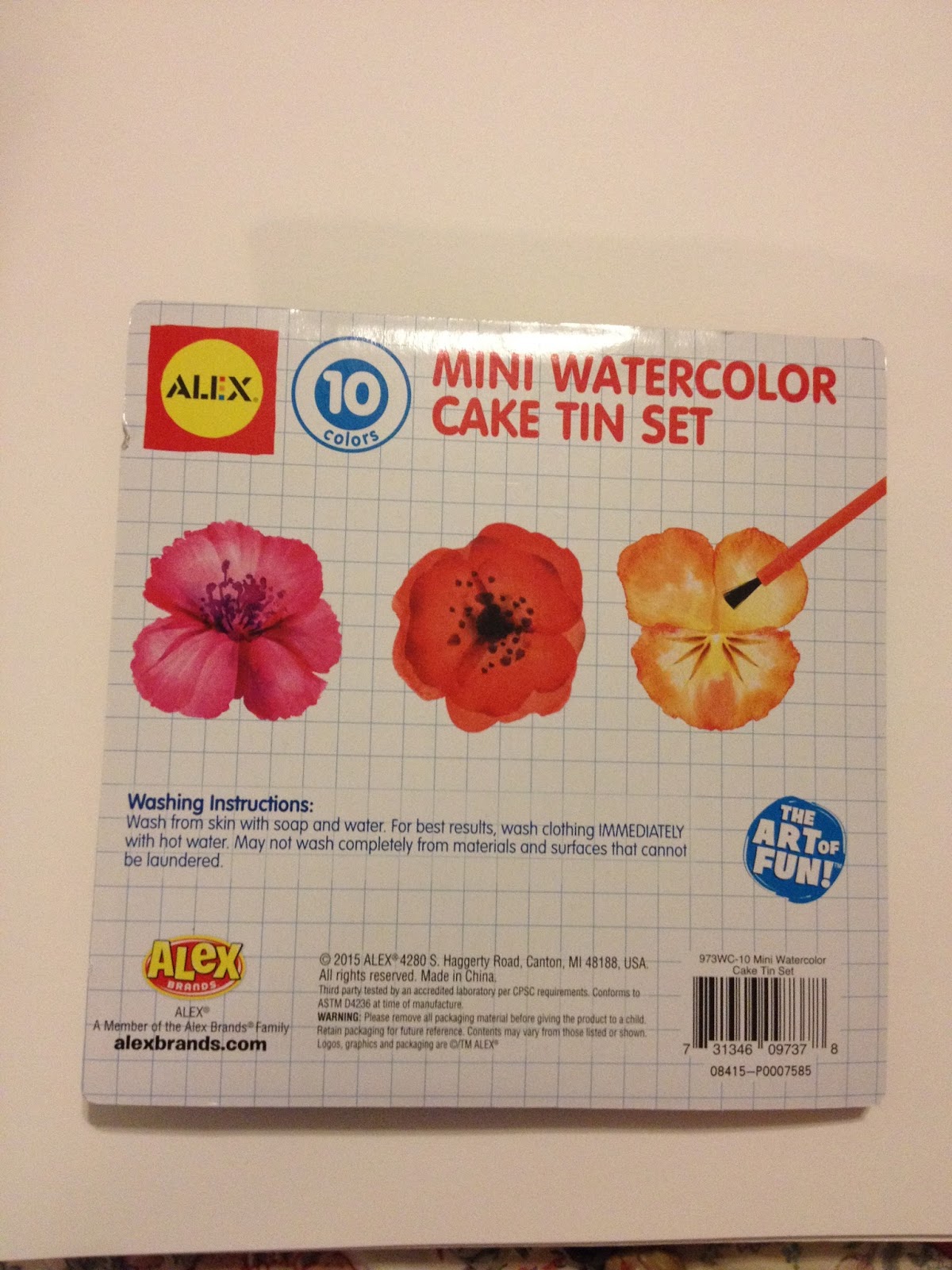 My little dollar tin of Alex watercolors came blister packed in a plastic and cardboard package, which are my favorite for American products, as they're easy to open. I have my doubts about being able to paint the shown flowers using either these paints or the included brush.