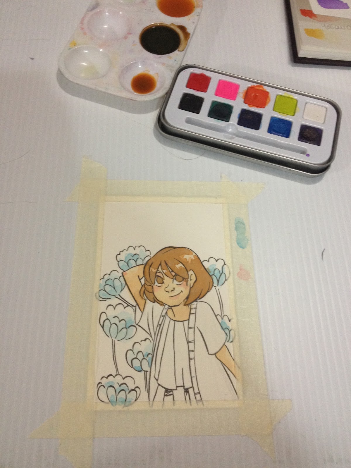 6. Apply ink to side palette, wet brush with clean water, begin to apply background.