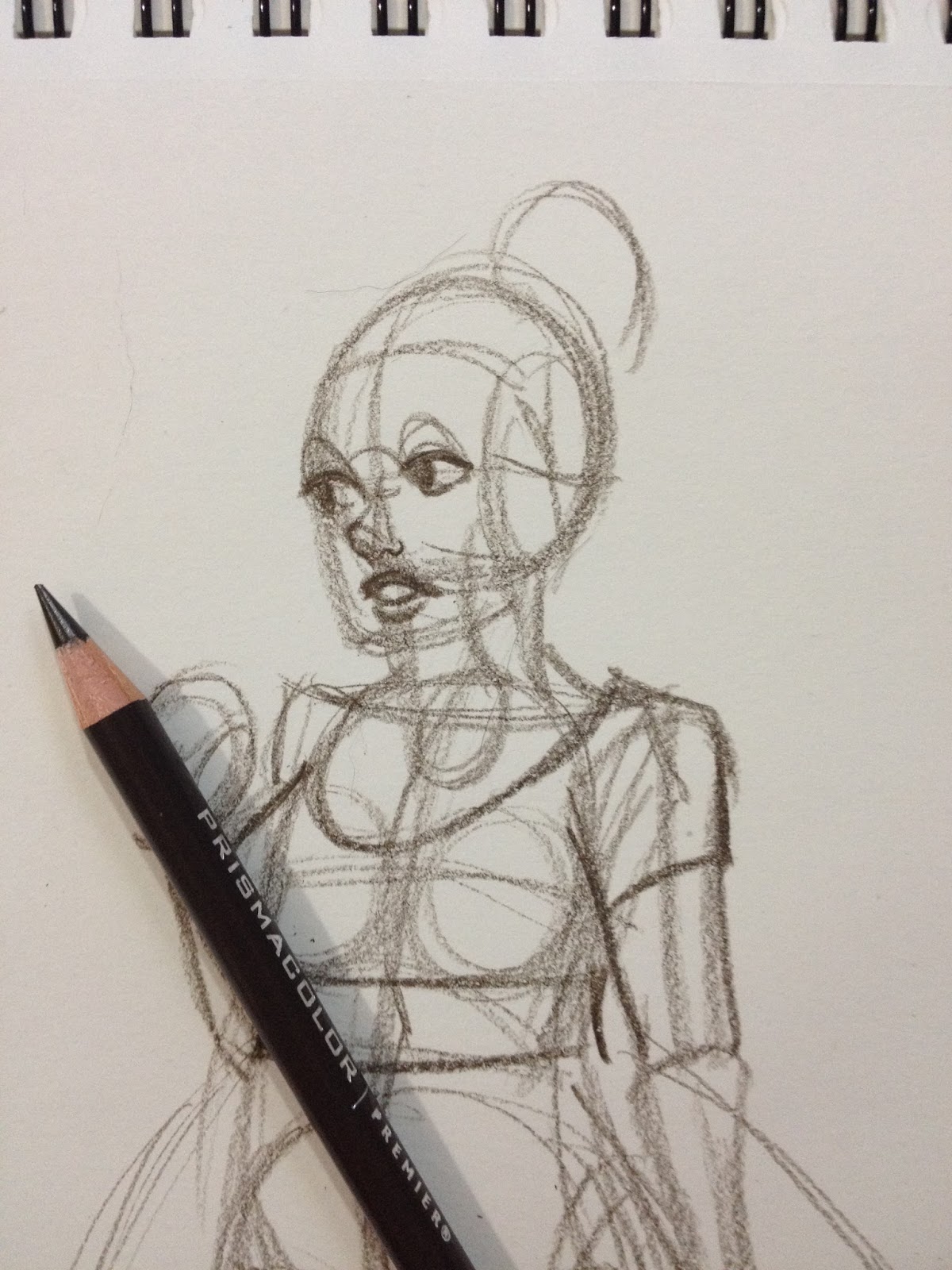 For sketching, I've pretty much moved entirely to using color pencils. I like the fact that they're expressive and immediate, that playing around with different colors can have a vastly different feel for the resulting sketch. I find sketching in color pencil to be very immediate and gestural- I don't overly worry about making things perfect, because I don't have the ability to erase. If I absolutely have to redraw something, I'll use a piece of sticky note and attach that on top.