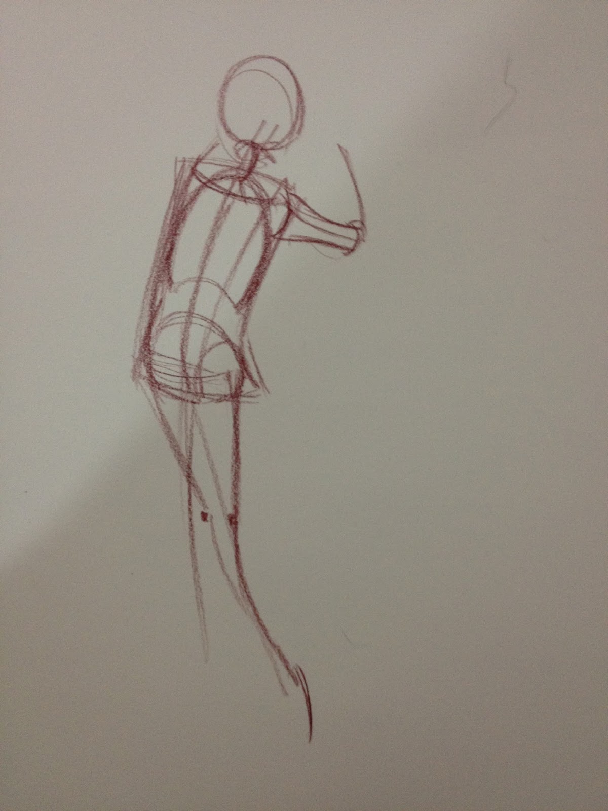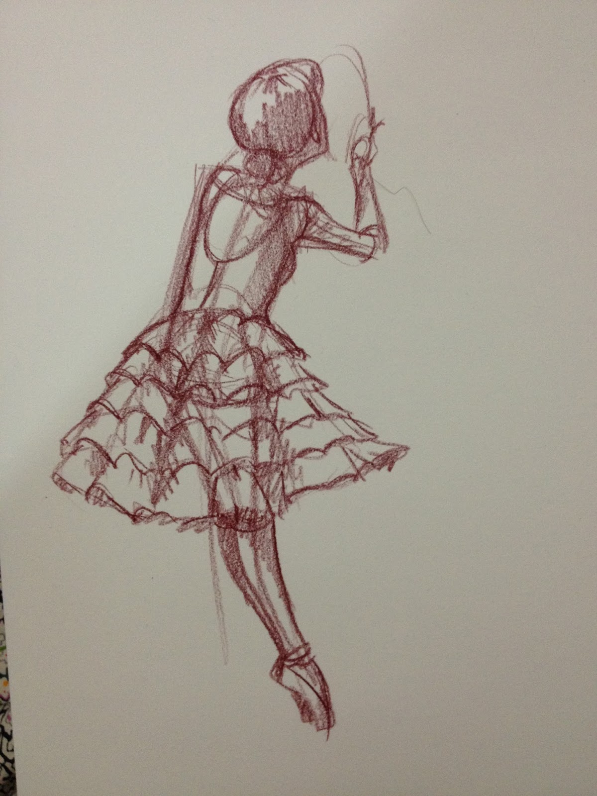 Nice long line of action that goes from head to the natural point of gravity on the floor. In the image Im referencing, the dancer is leaning on her partner, but I opted not to draw the partner. She is not supporting herself, so her line of action does not meet up with where her feet are.