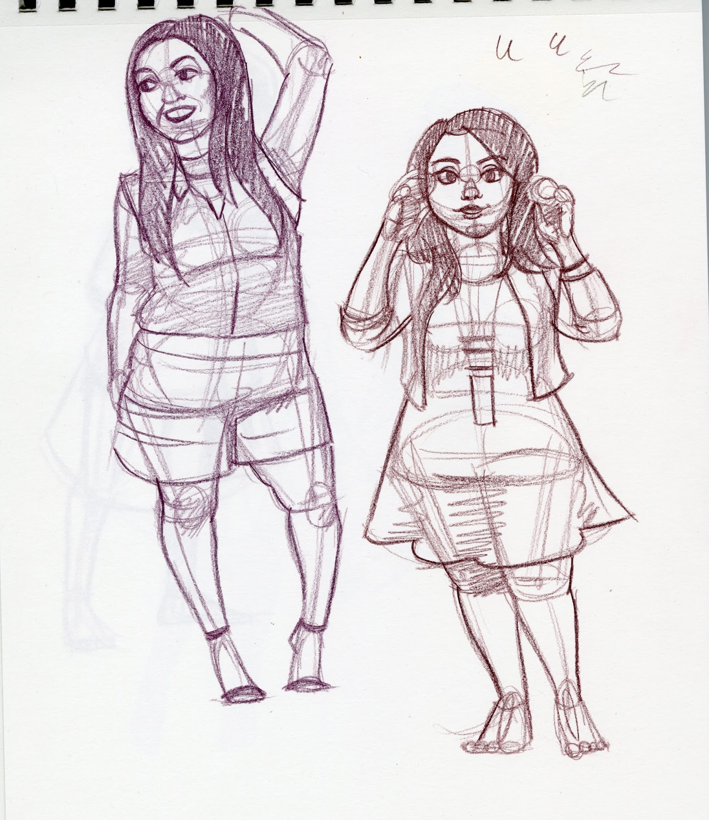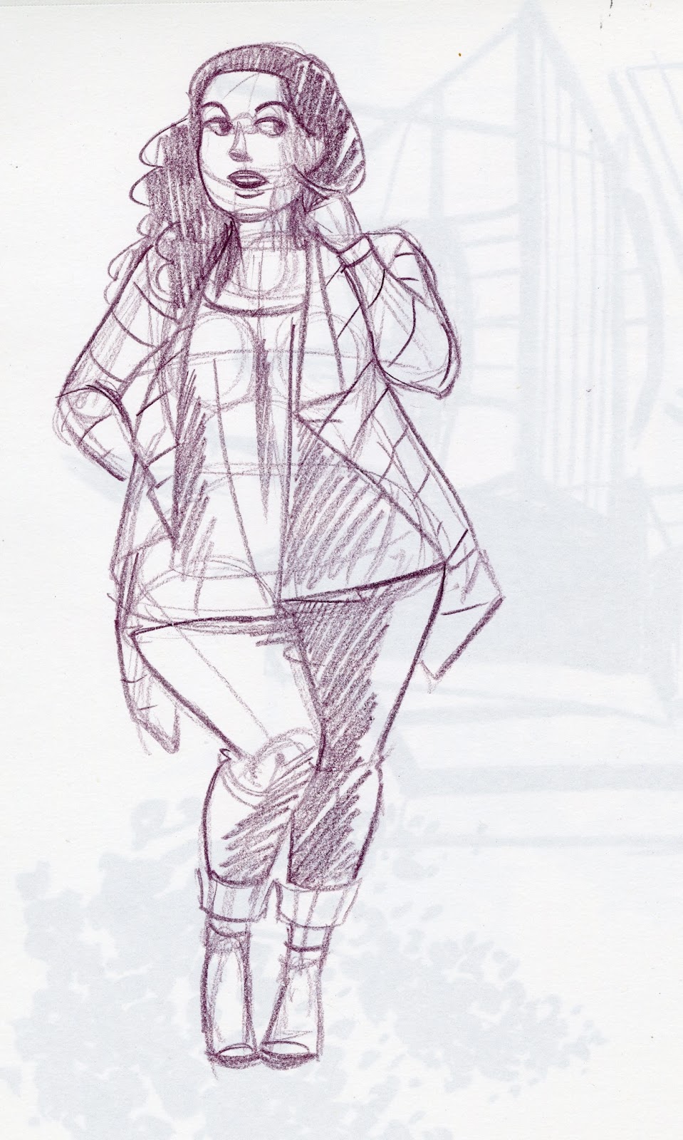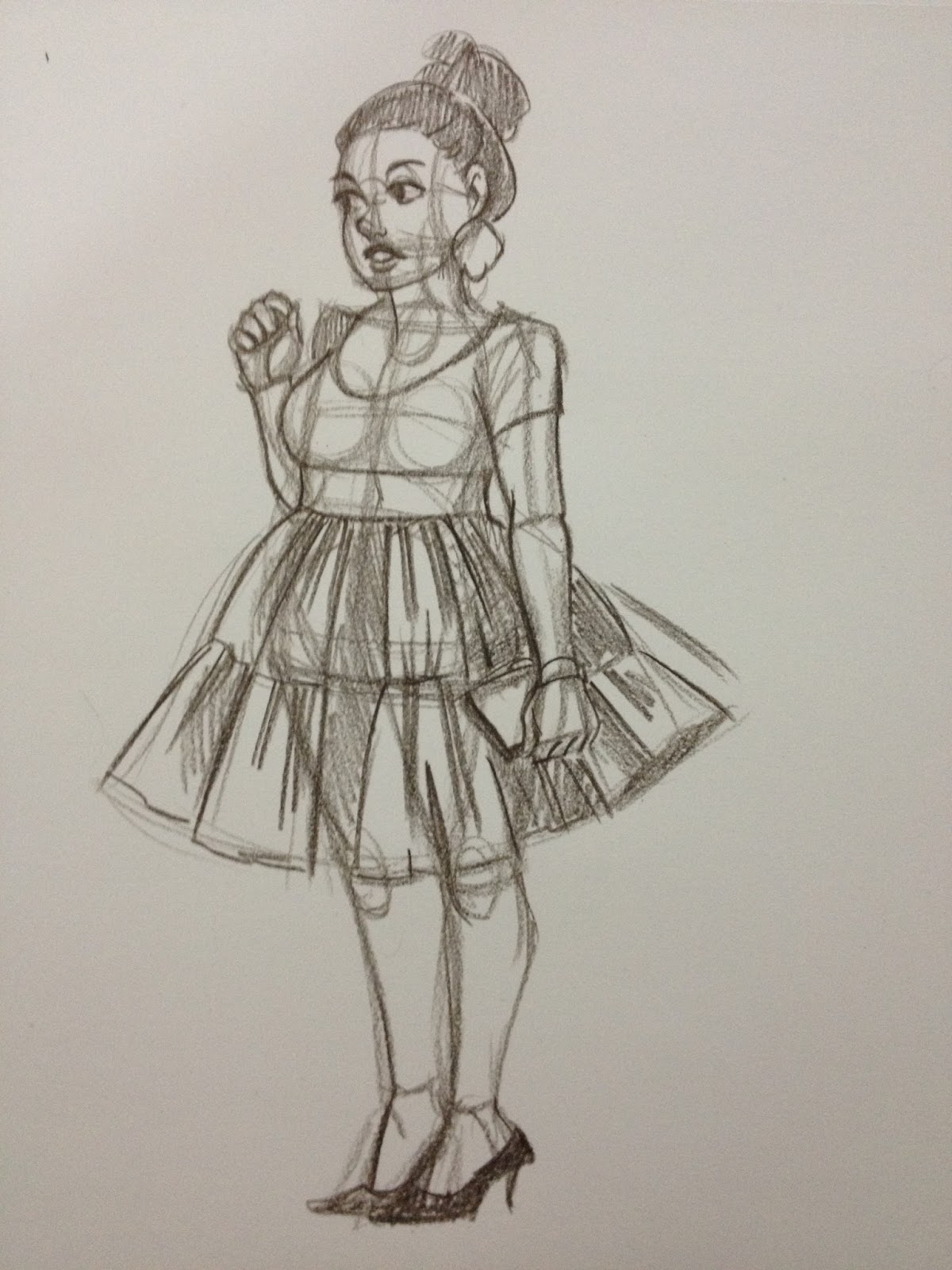 I've gotten bored with the lack of figure variety on sites like The Sartorialist, so I turned to Pinterest for some plus size model reference. By changing my inspiration, I found I was able to work on a problem that consistently plagues my work-oversized heads. The change in proportions meant I had to study the figure carefully, rather than being able to cheat through muscle memory, which just reinforced bad habits.