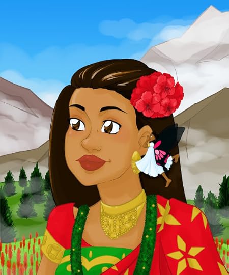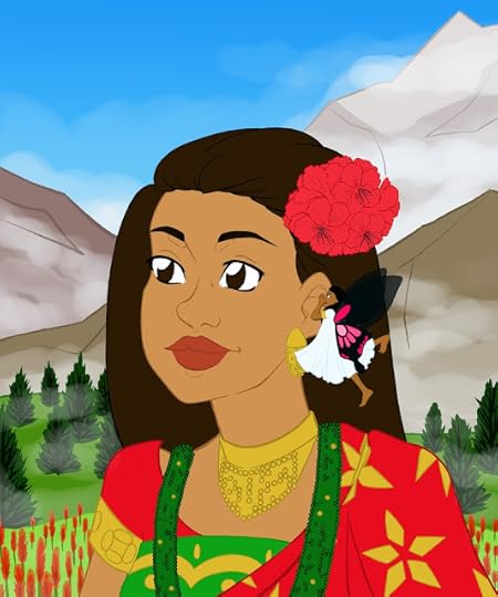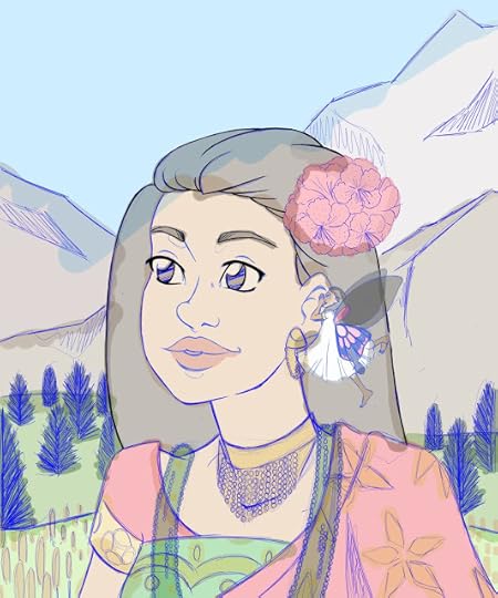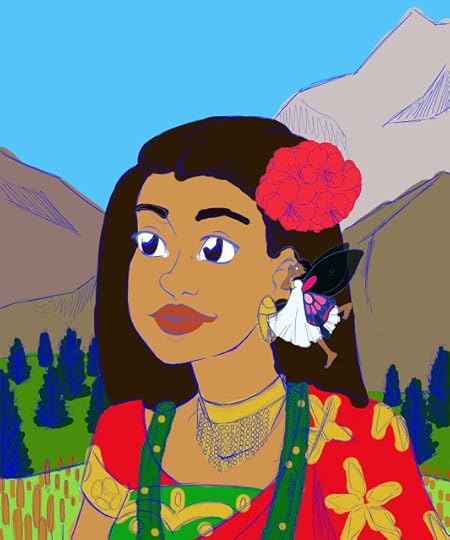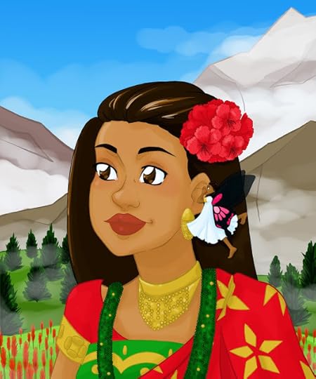 The reference I collected for Nepal were mostly lovely mountain meadows, and I wanted that atmosphere in my illustration. I also wanted that high, endless blue sky, and the cloud shrouded mountains. The sky is simply a gradient layer set to multiply, and the clouds are a large brush set to very low opacity and layered.