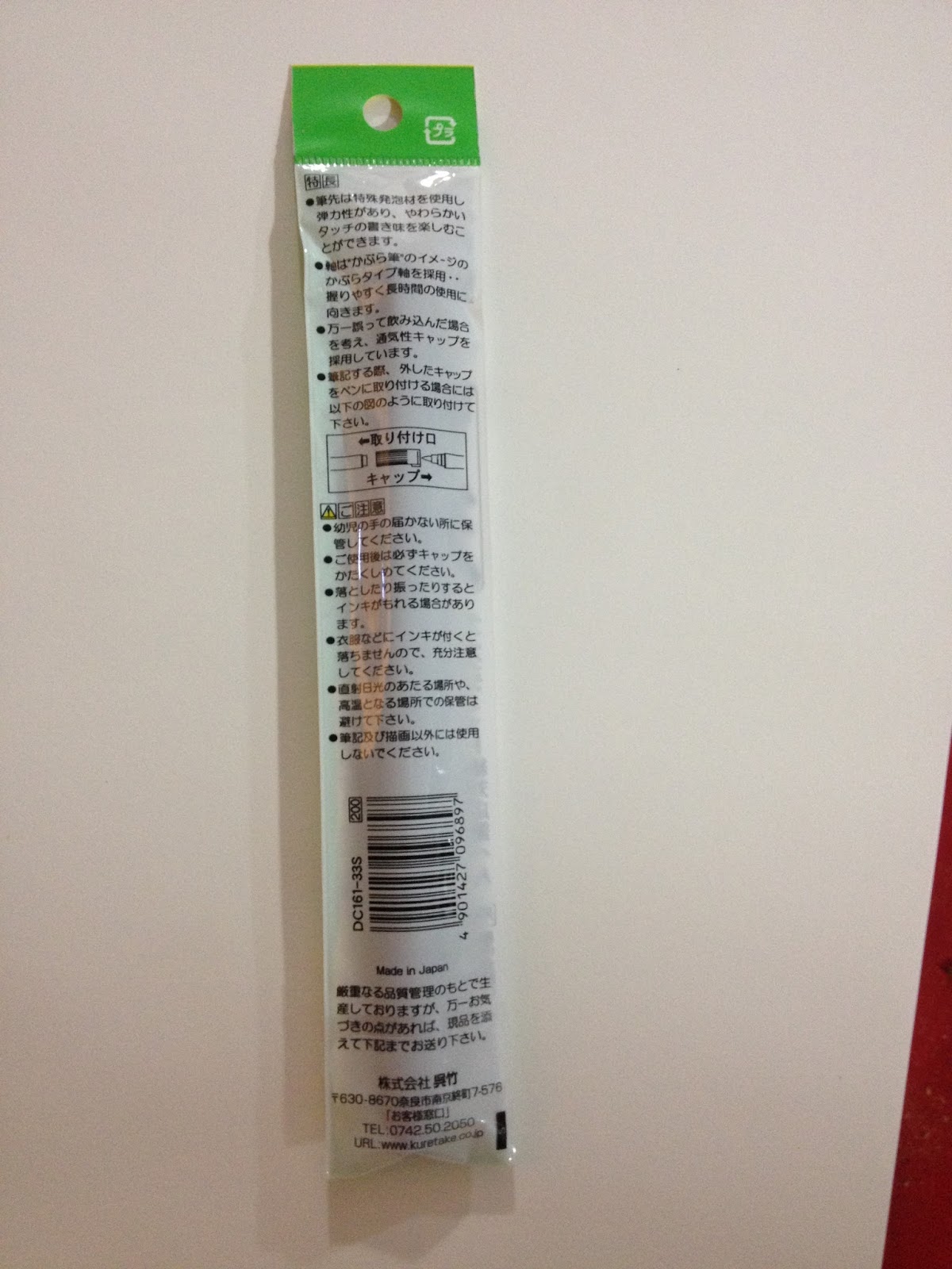 Kuretake No. 33 Brush Pen SoftThis is one of the pens I purchased from Amazon, I believe, as I progress my way through Kuretake's numbered brushpens to ferret out their differences. You can also get this pen on Jetpens for $3.30. It's almost identical to the No. 6 reviewed above, except that it's one sided- only a large black Japanese brush.