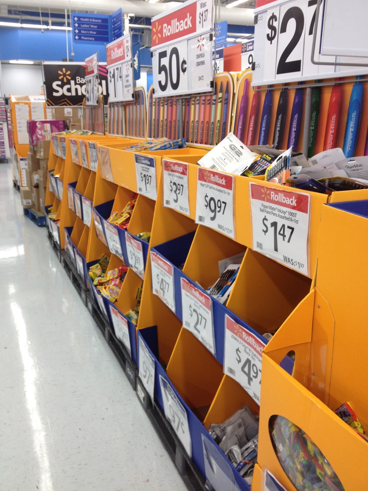 Rows of cardboard school supply display