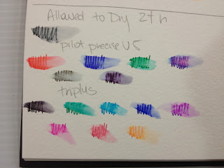 Immediate water application causes the ink to run drastically, but the effect is almost like a watercolor marker or brushpen, and could be utilized for color application. Most of the inks tested held their color even with water, and though all pen points were chosen as fineliners, and the marks made reflect that, the color distribution is generous.