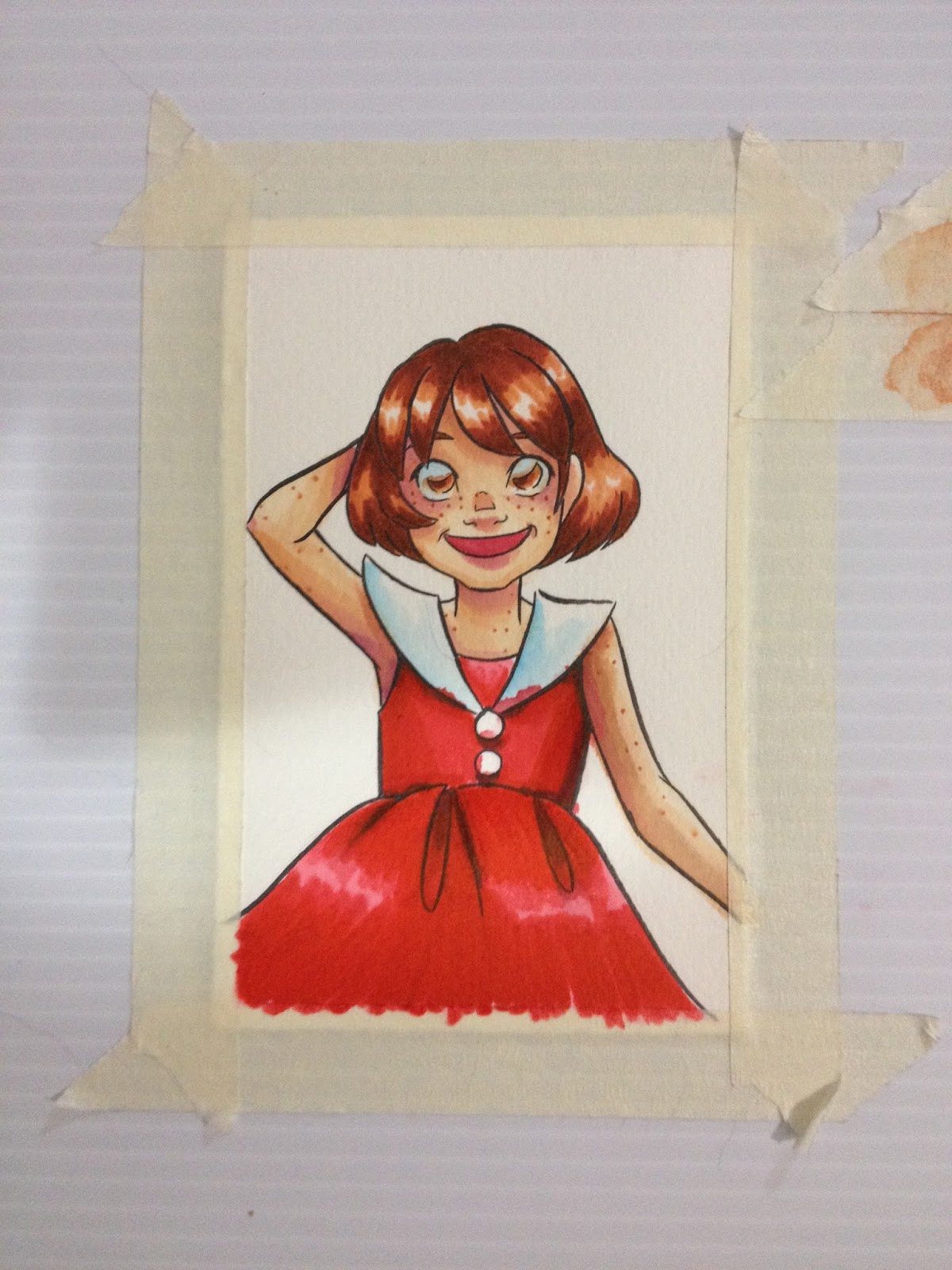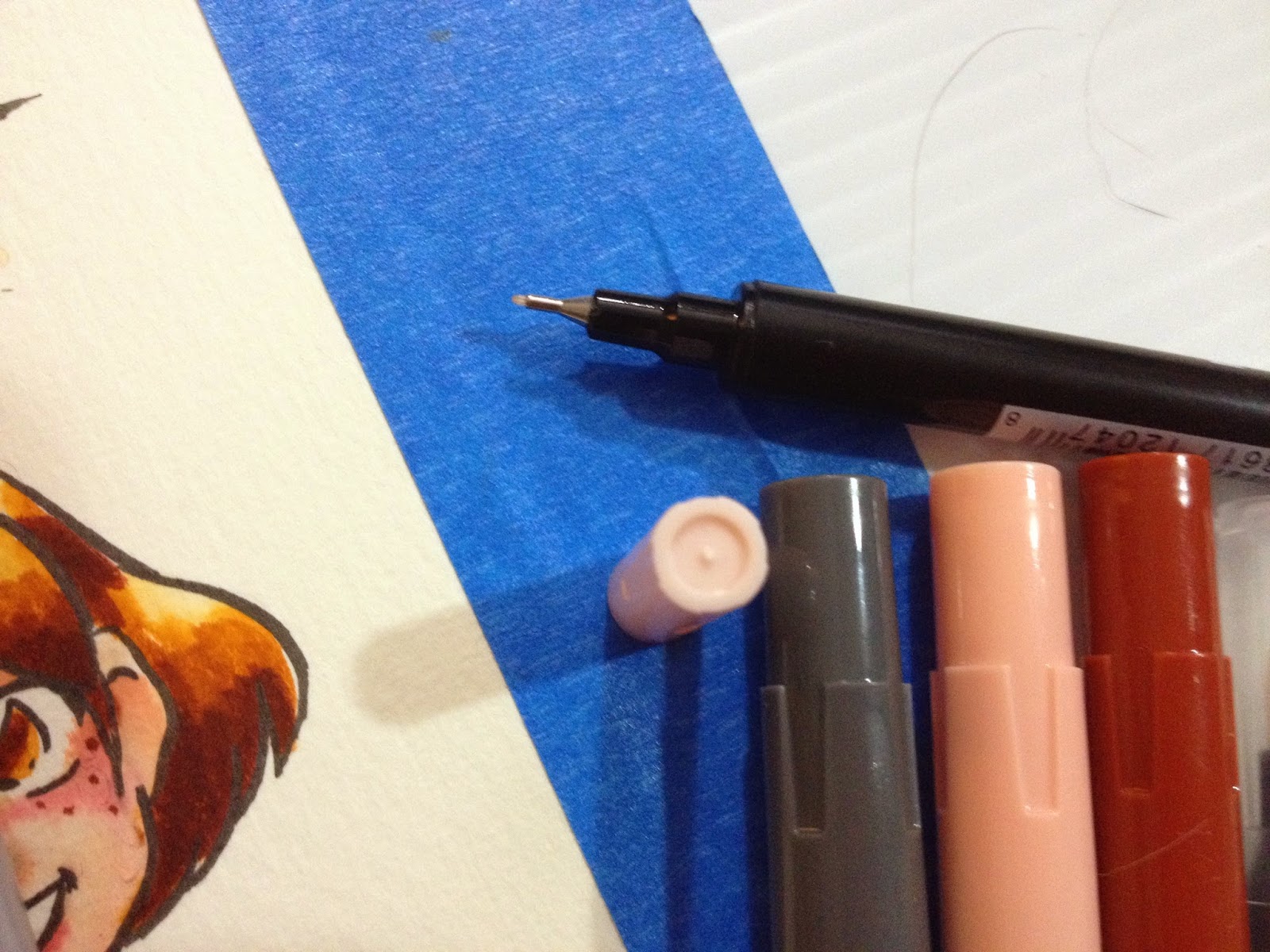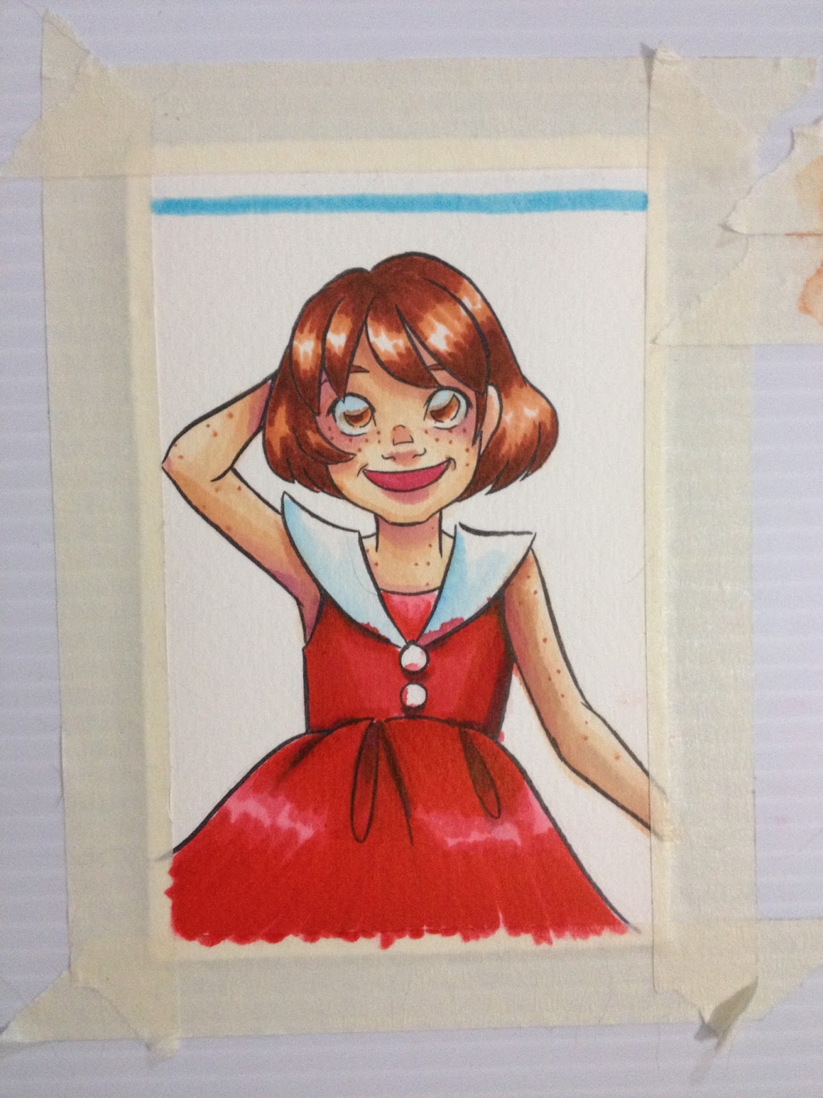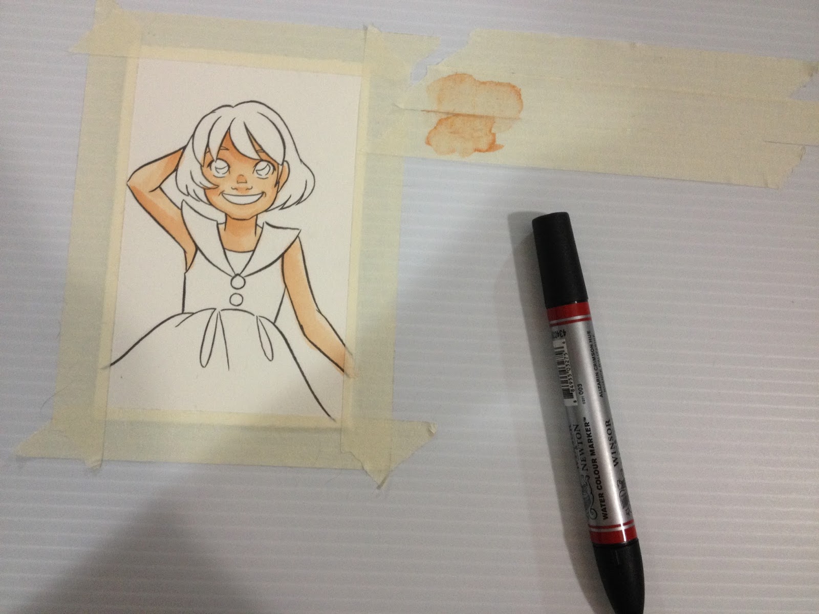 You can use the side masking tape palette to also mix colors by applying one on top of the other before adding water. I did this to mix the skin shadows for the field test illustration- usually I apply shadows last, but I thought it might be easier to handle if I applied the red violet skin shadows first. These markers don't have color names, so I can't list them, but I mixed a hot magentaish pink with a reddish purple.