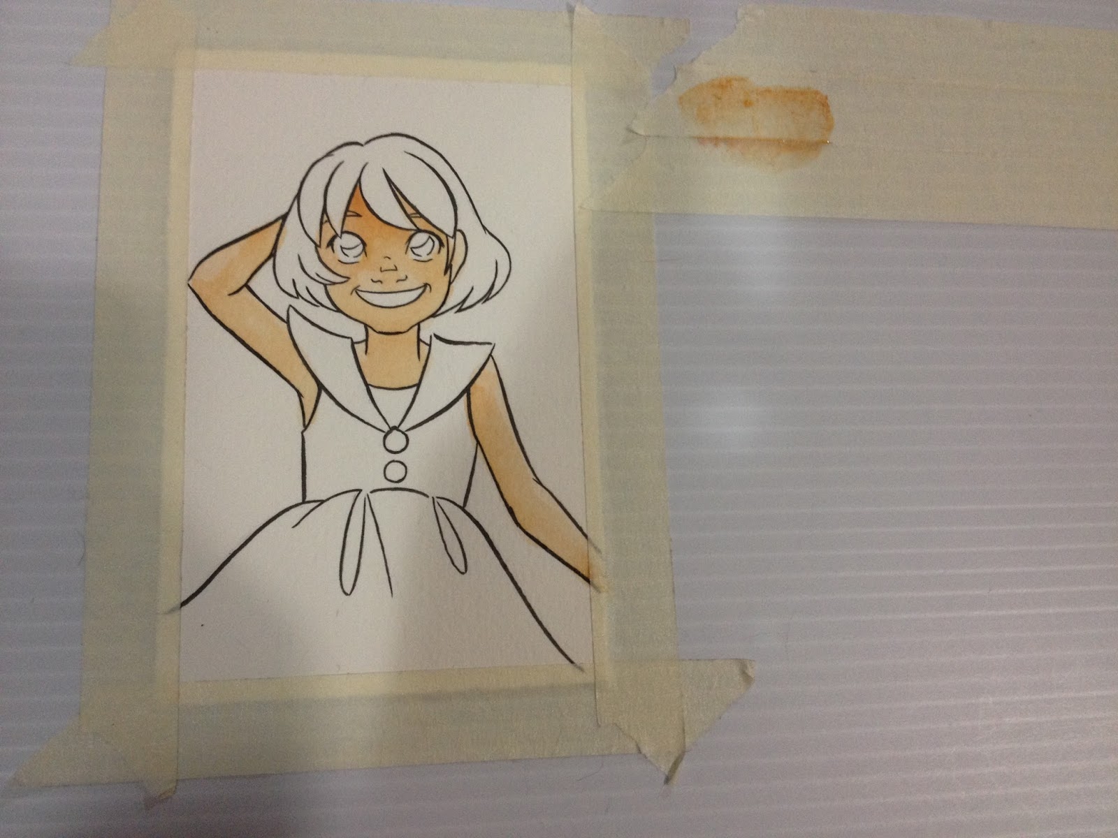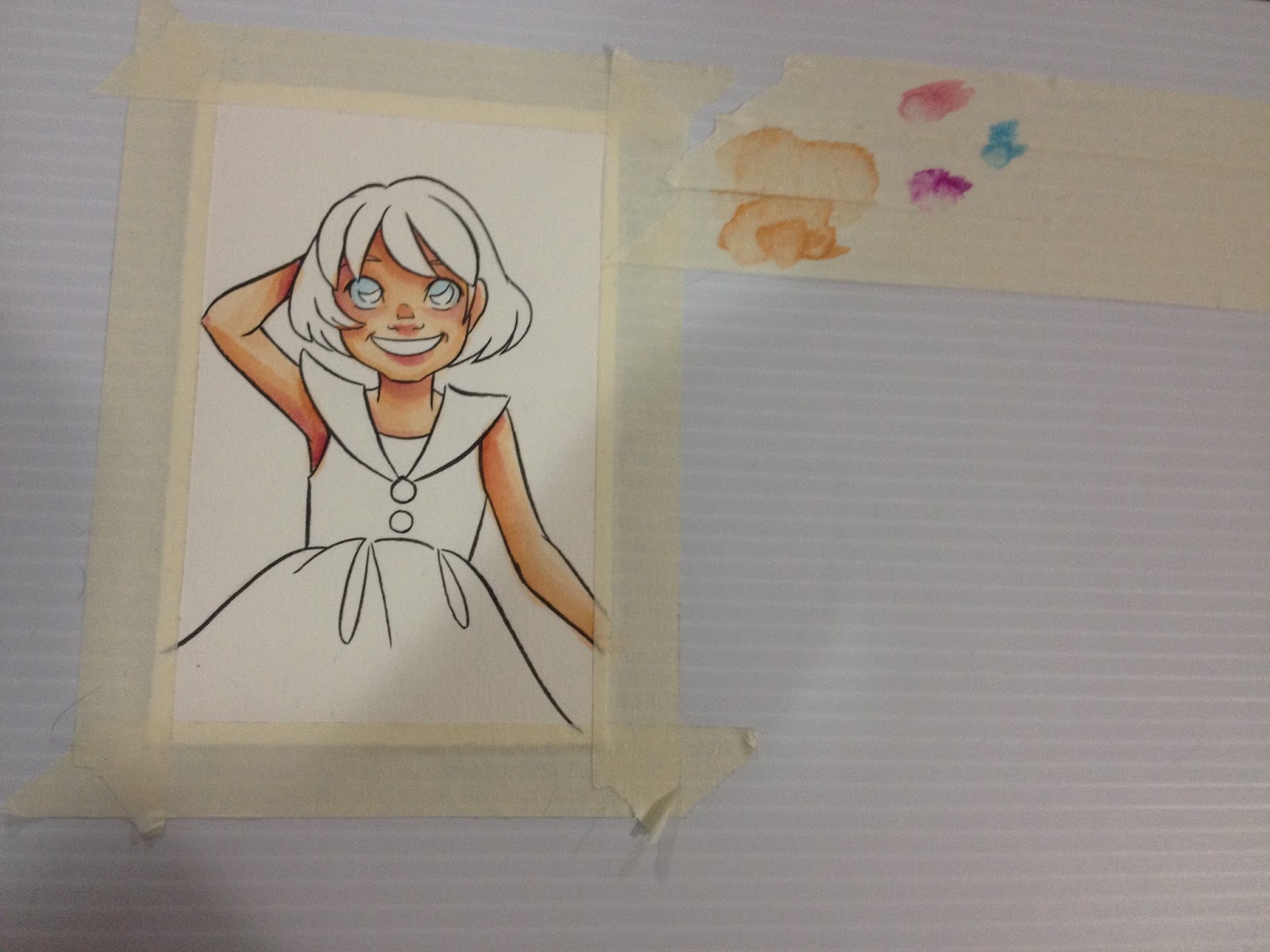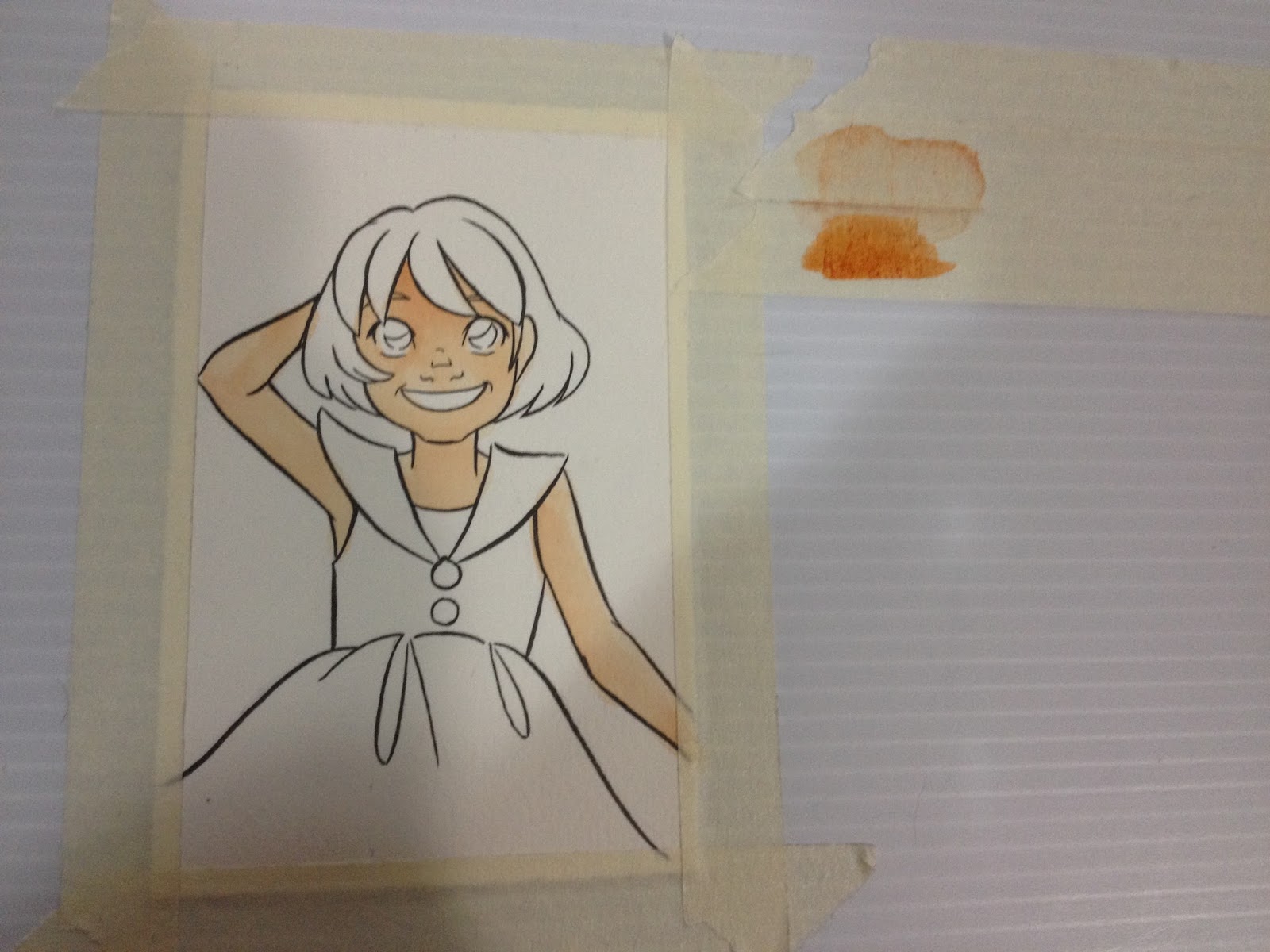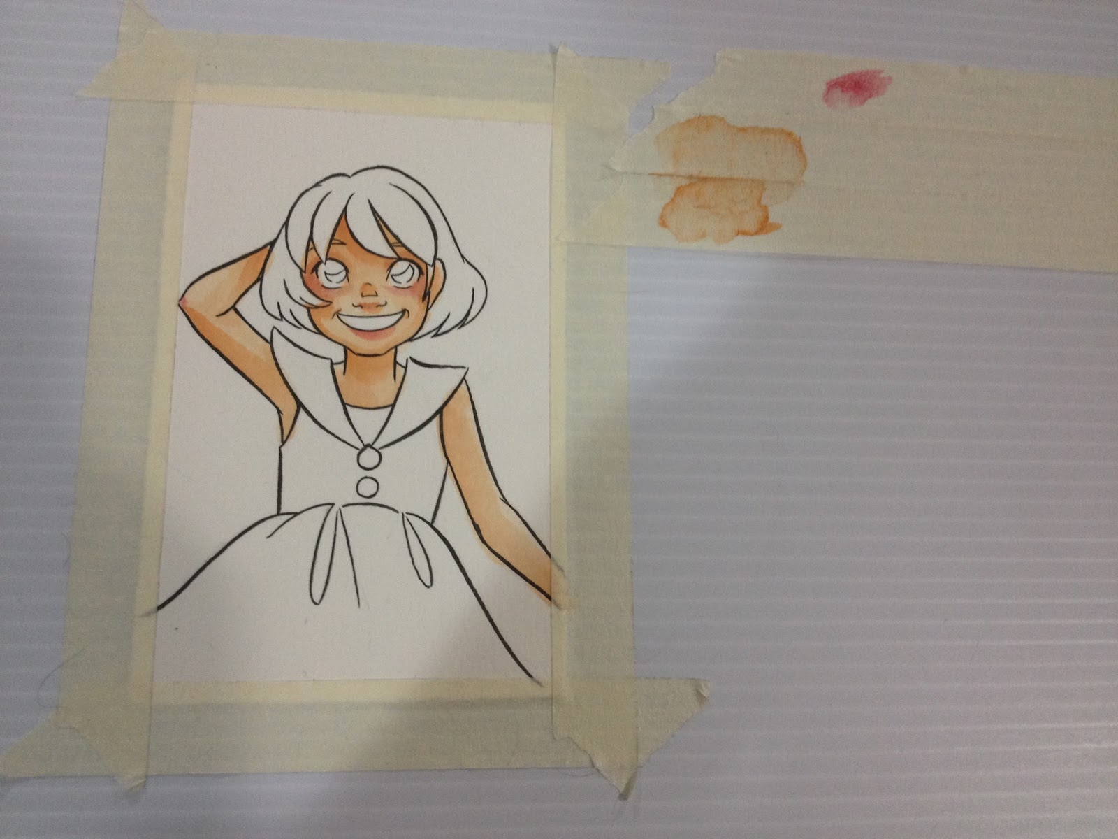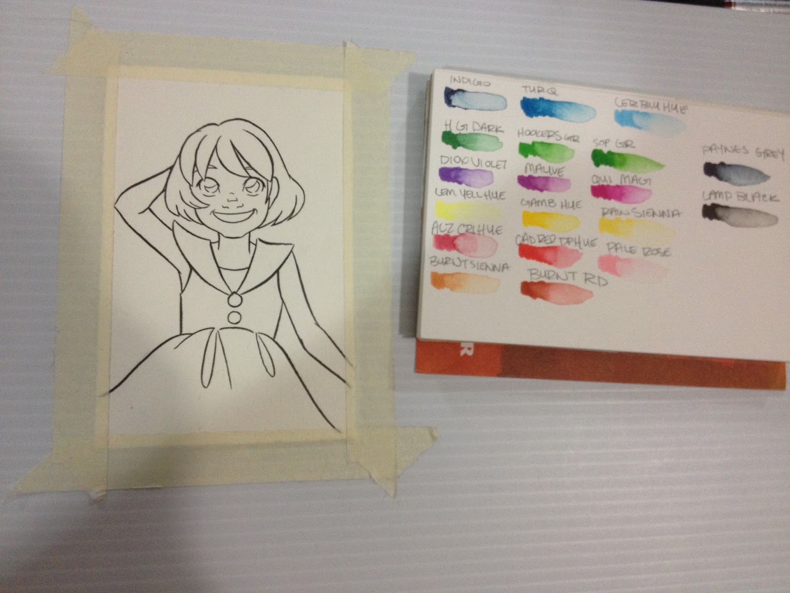 For the purposes of this review, I sketched out a little Kara, inked her with the Sailor Mitsuo Aida, as it's waterproof and a fude pen, and let that dry for 24 hours before erasing the pencil. I then taped that sucker down, and started laying down some color. I used Fabriano Medioevalis 208 S, because I have a 100 pack of these little cards, which is a fairly soft watercolor paper.