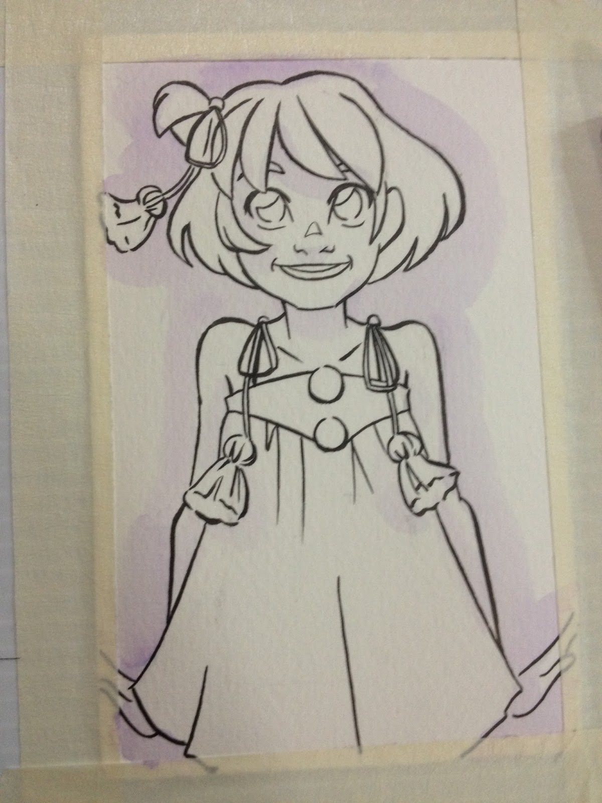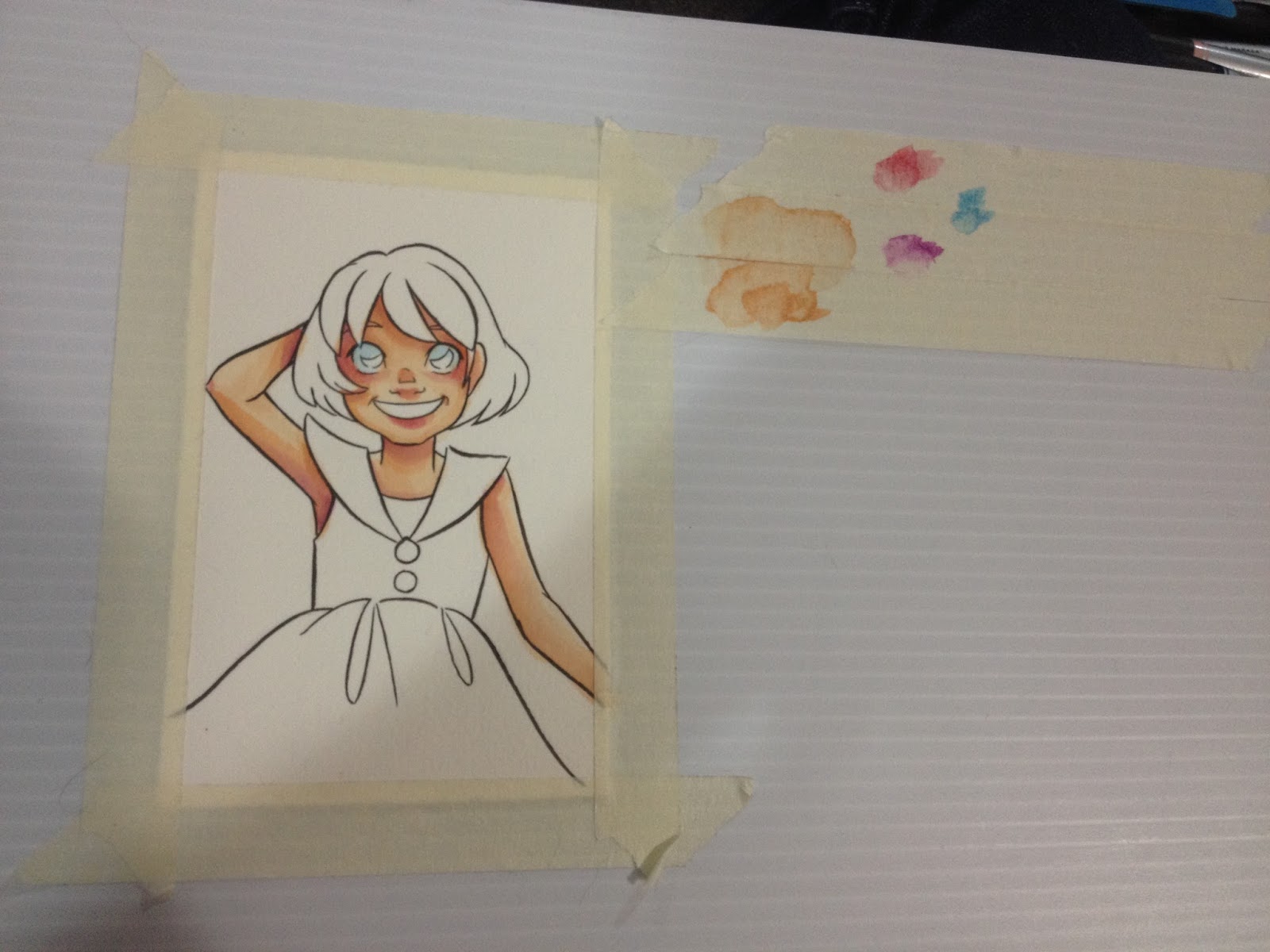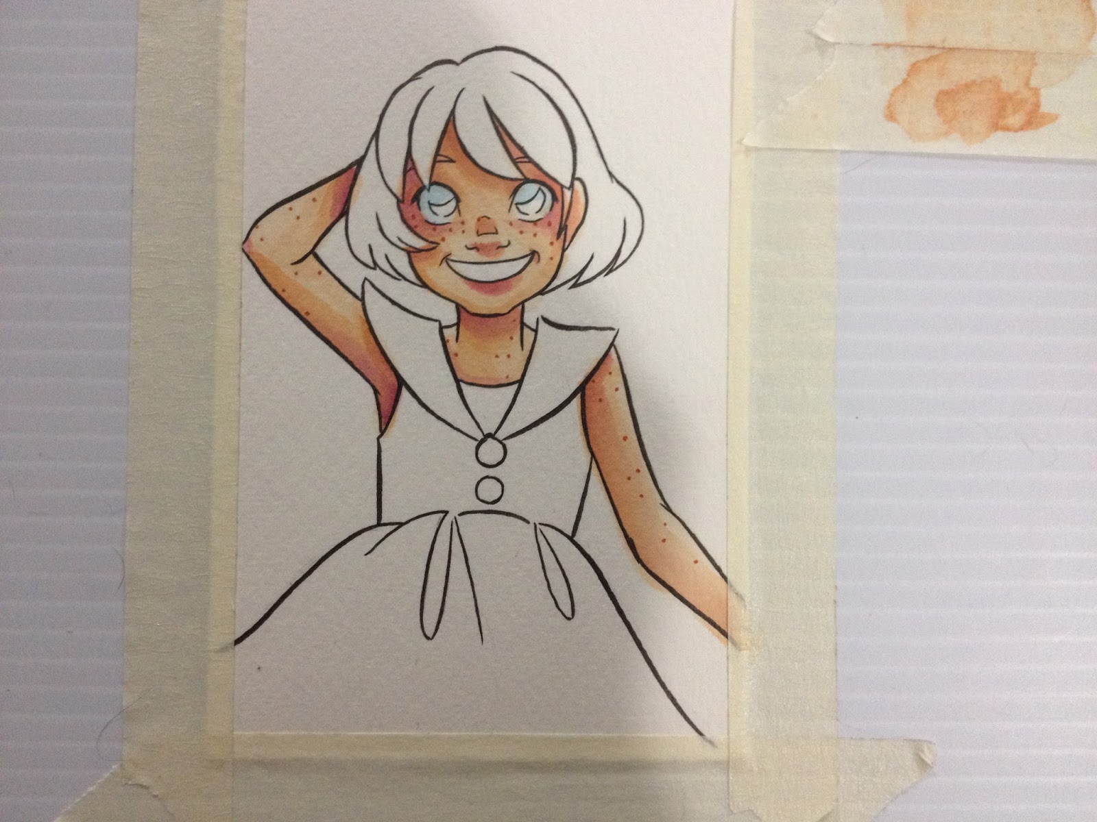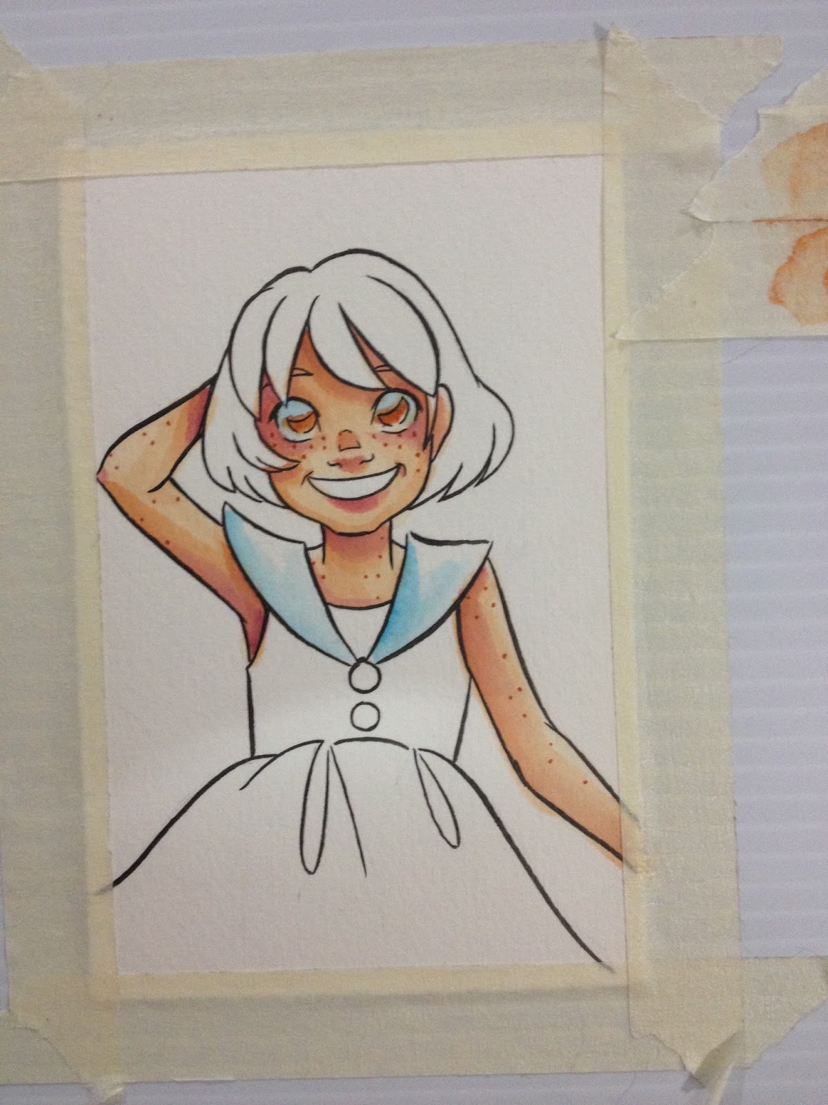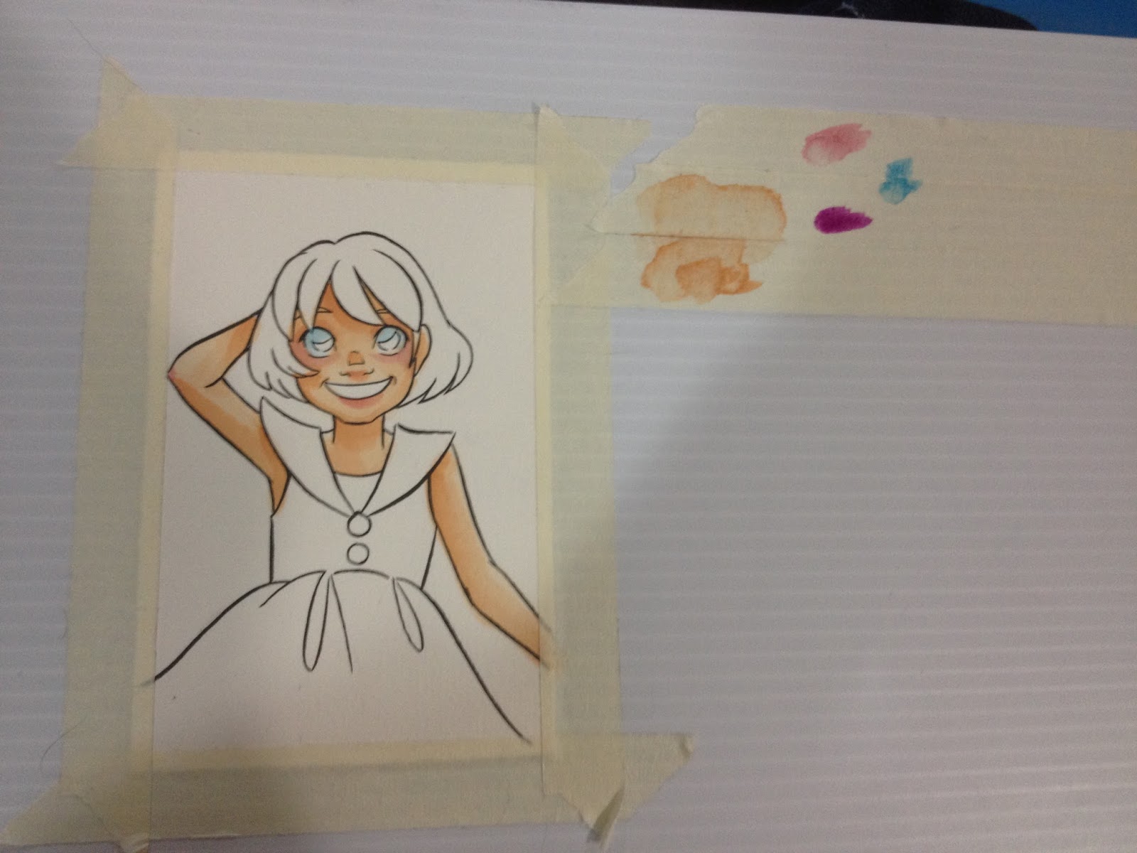 For the purposes of this review, I sketched out a little Kara, inked her with the Sailor Mitsuo Aida, as it's waterproof and a fude pen, and let that dry for 24 hours before erasing the pencil. I then taped that sucker down, and started laying down some color. I used Fabriano Medioevalis 208 S, because I have a 100 pack of these little cards, which is a fairly soft watercolor paper.