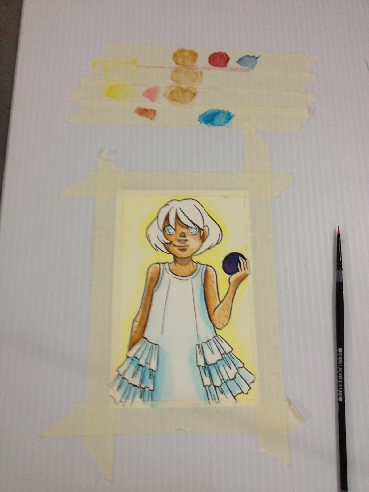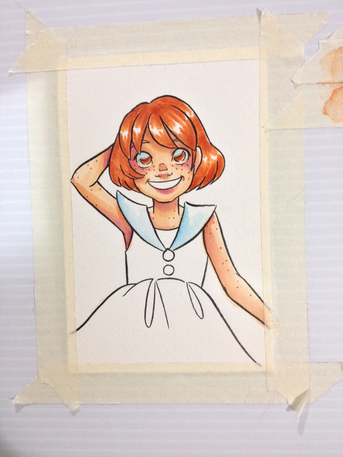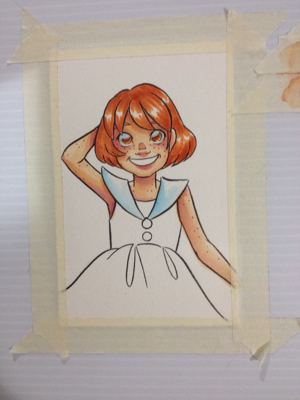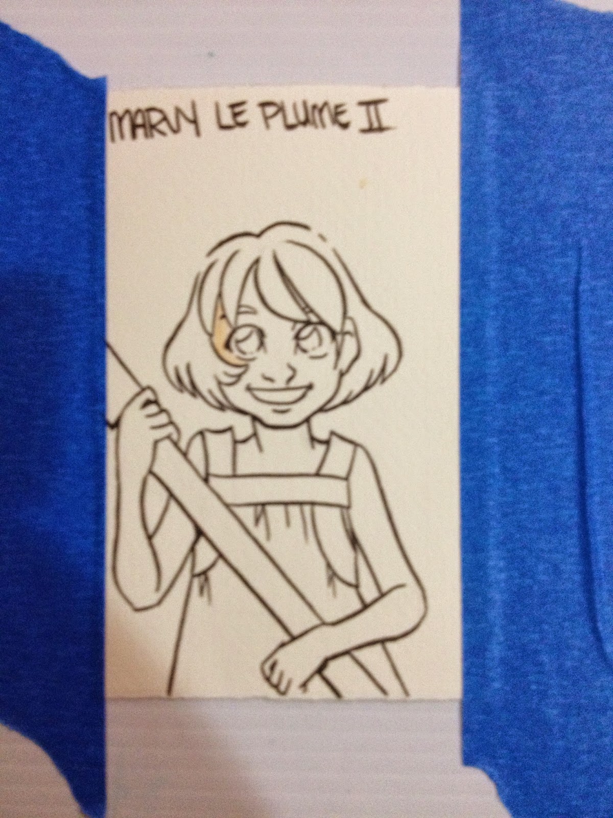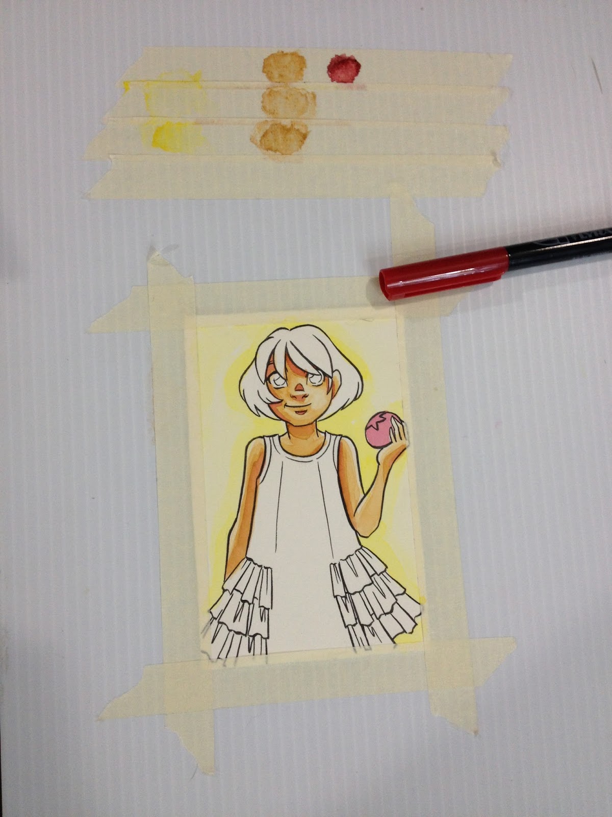 For the purposes of this review, I sketched out a little Kara, inked her with the Sailor Mitsuo Aida, as it's waterproof and a fude pen, and let that dry for 24 hours before erasing the pencil. I then taped that sucker down, and started laying down some color. I used Fabriano Medioevalis 208 S, because I have a 100 pack of these little cards, which is a fairly soft watercolor paper.